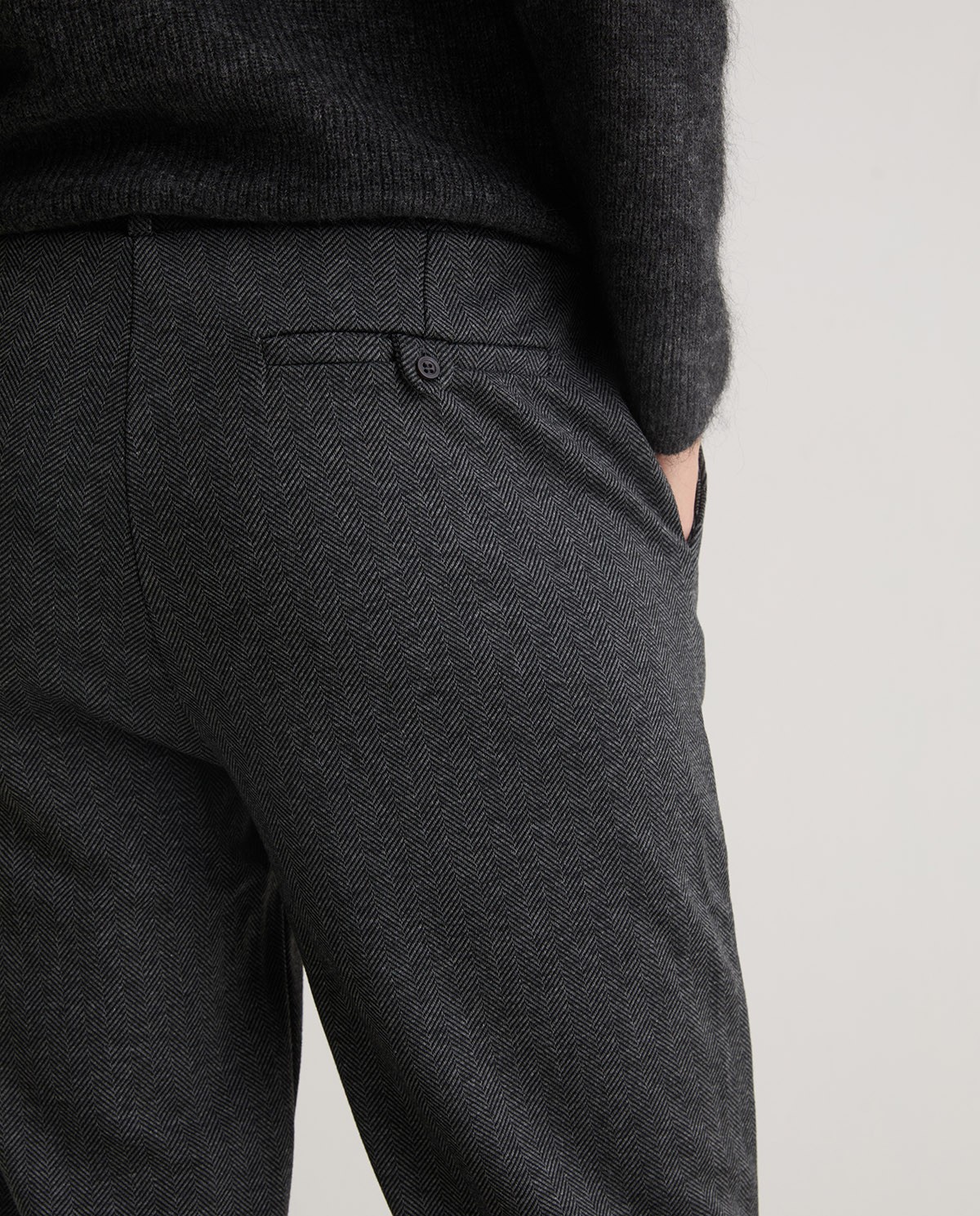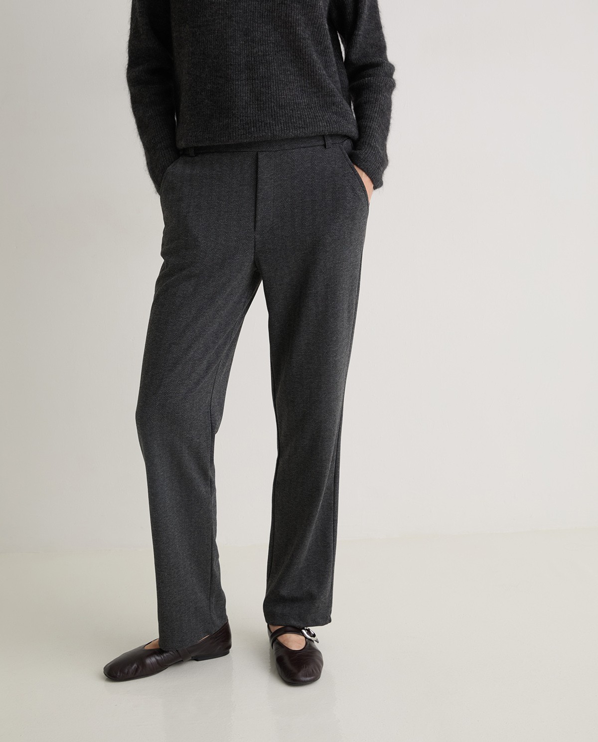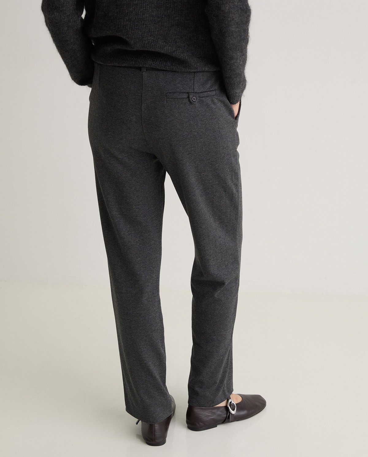 Pantalón recto de punto. Tejido de espiga. Regular fit. Sin cierre. Cintura elástica con trabillas. Dos bolsillos laterales y 1 bolsillo de vivo abotonado detrás.