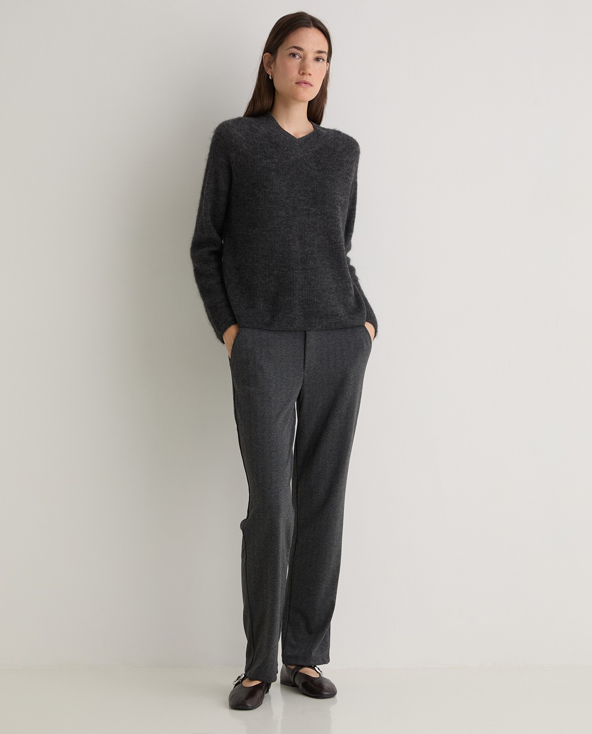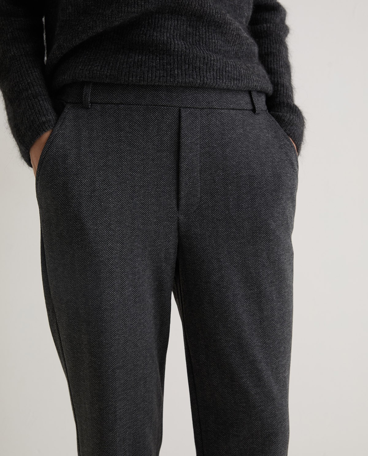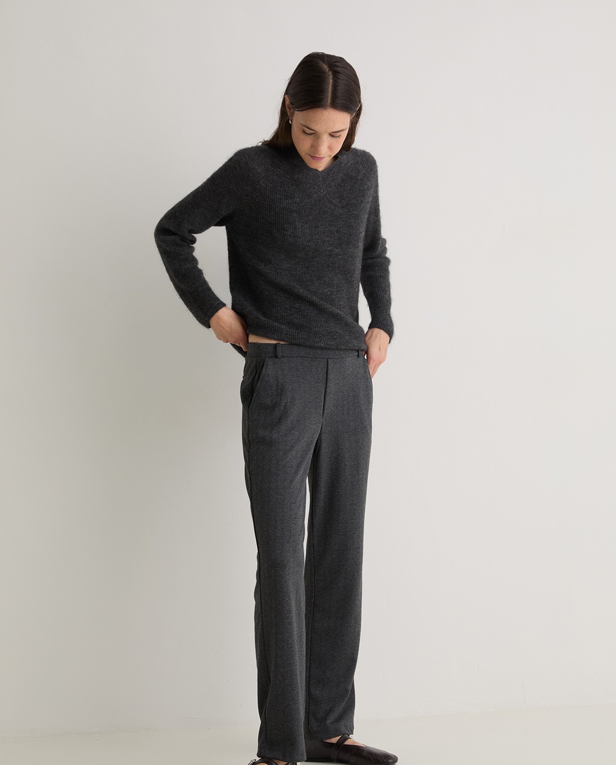 Pantalón recto de punto. Tejido de espiga. Regular fit. Sin cierre. Cintura elástica con trabillas. Dos bolsillos laterales y 1 bolsillo de vivo abotonado detrás.