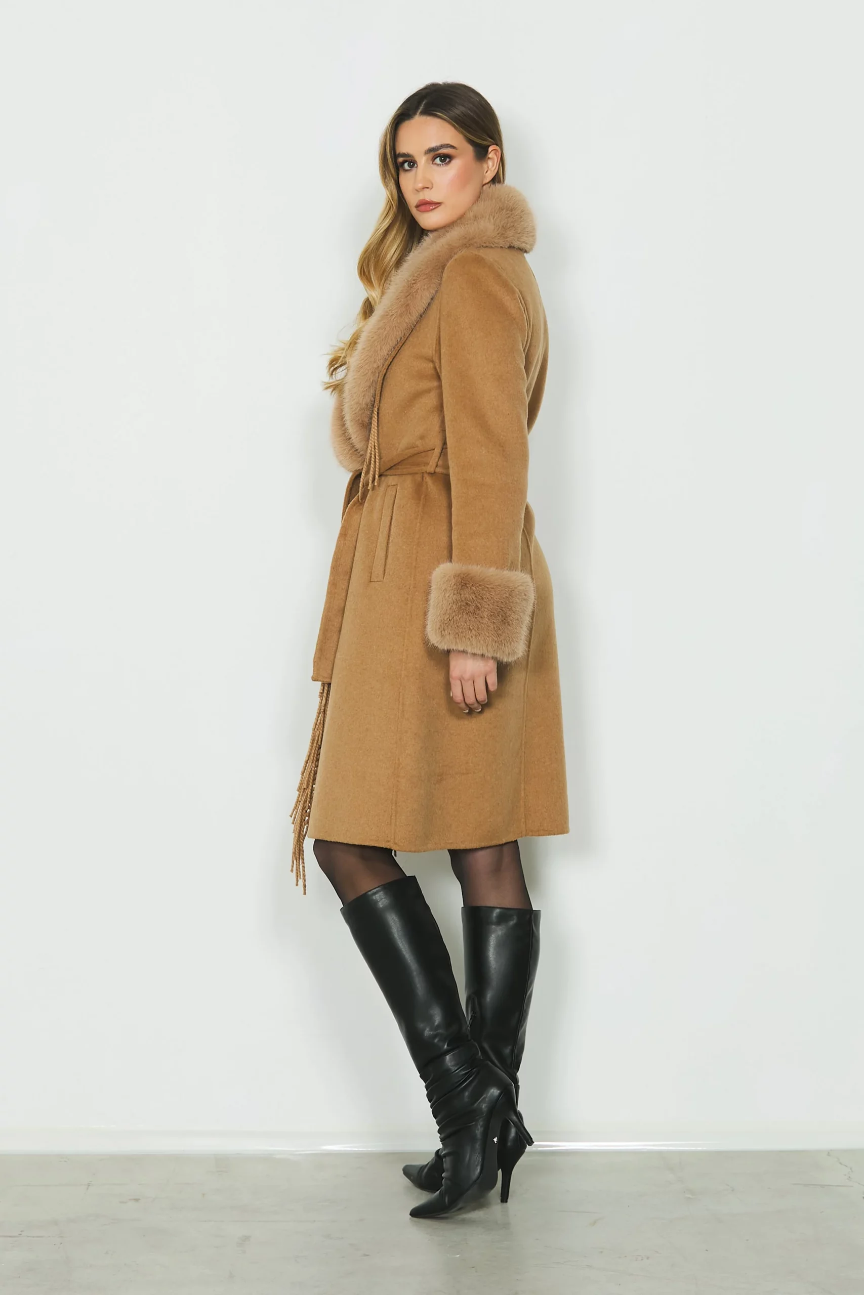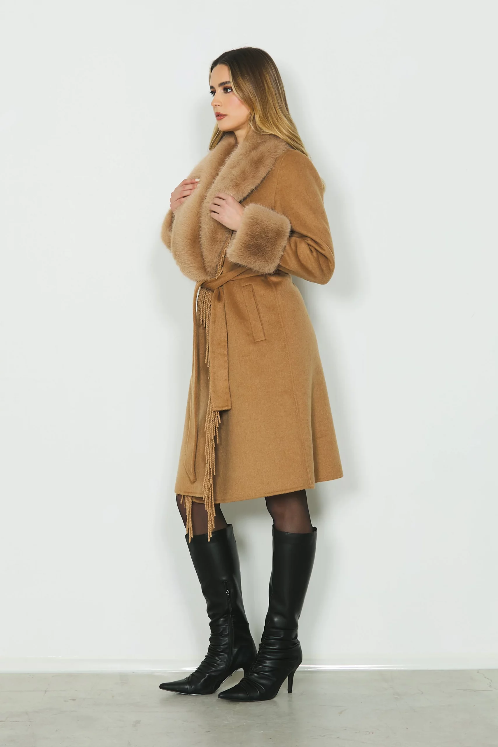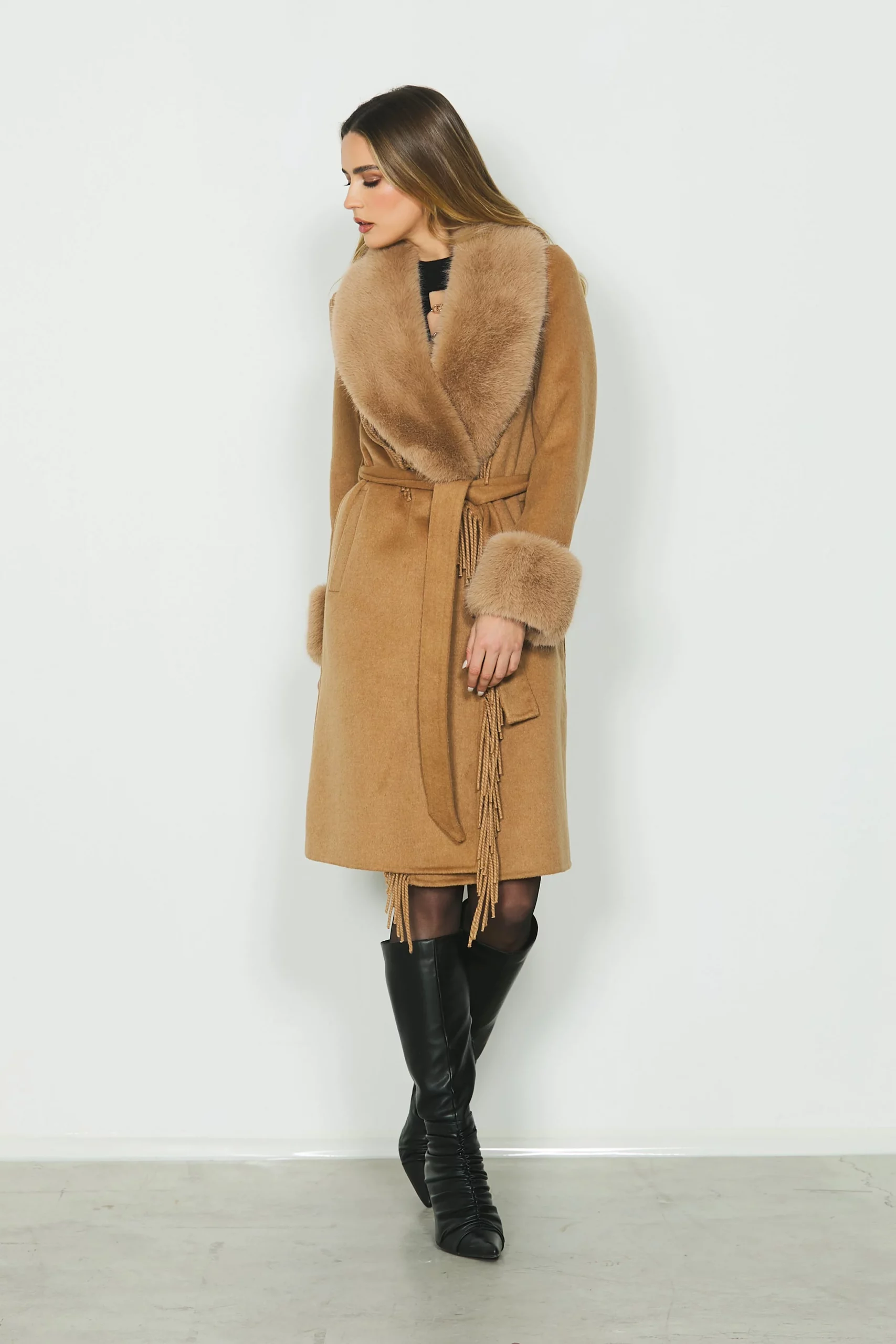 Abrigo GUENDA de manga larga con pelo sintético despegado. además de cinturón y flecos sin forro