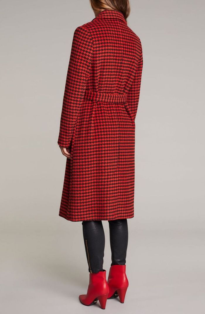 Abrigo lago midi, con estampado de pata d gallo, cuello con solapas, cierre delantero cruzado con botones forrados y cinturón en el mismo tejido.