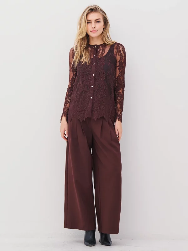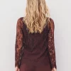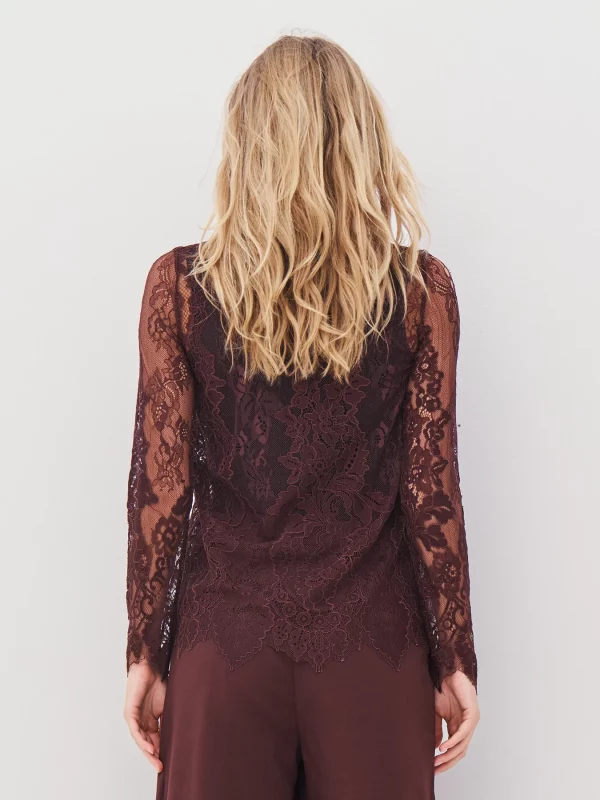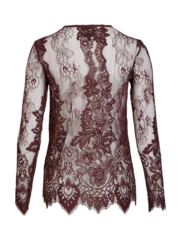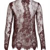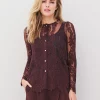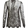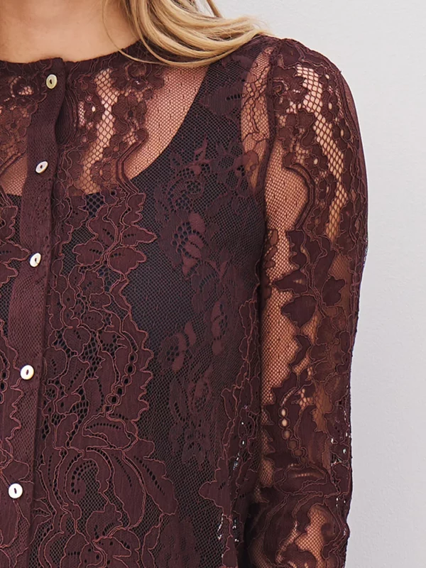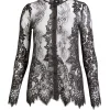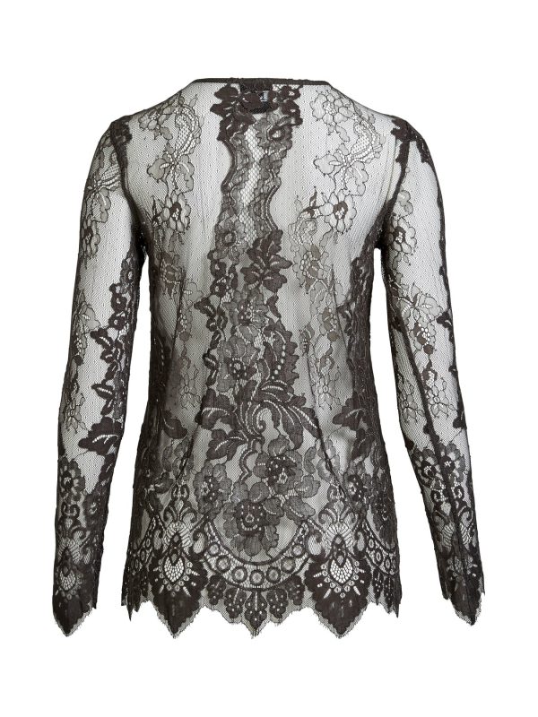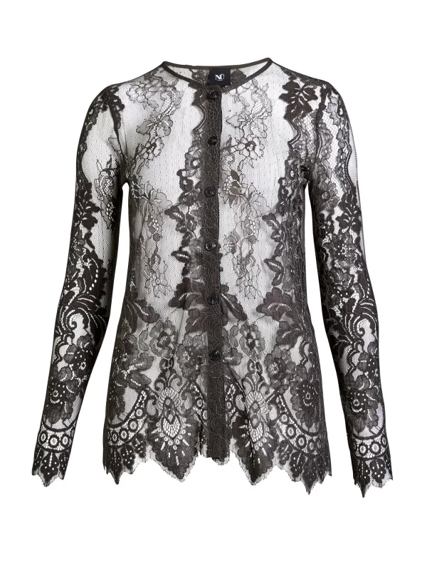 Este top está confeccionado en encaje transparente con un detallado estampado de flores y bordes, creando una expresión romántica y elegante. Presenta escote redondo, mangas largas y cierre de botones en la parte delantera. Los bordes ondulados y sin rematar en el bajo y las mangas realzan su artesanía y le aportan un acabado exclusivo.