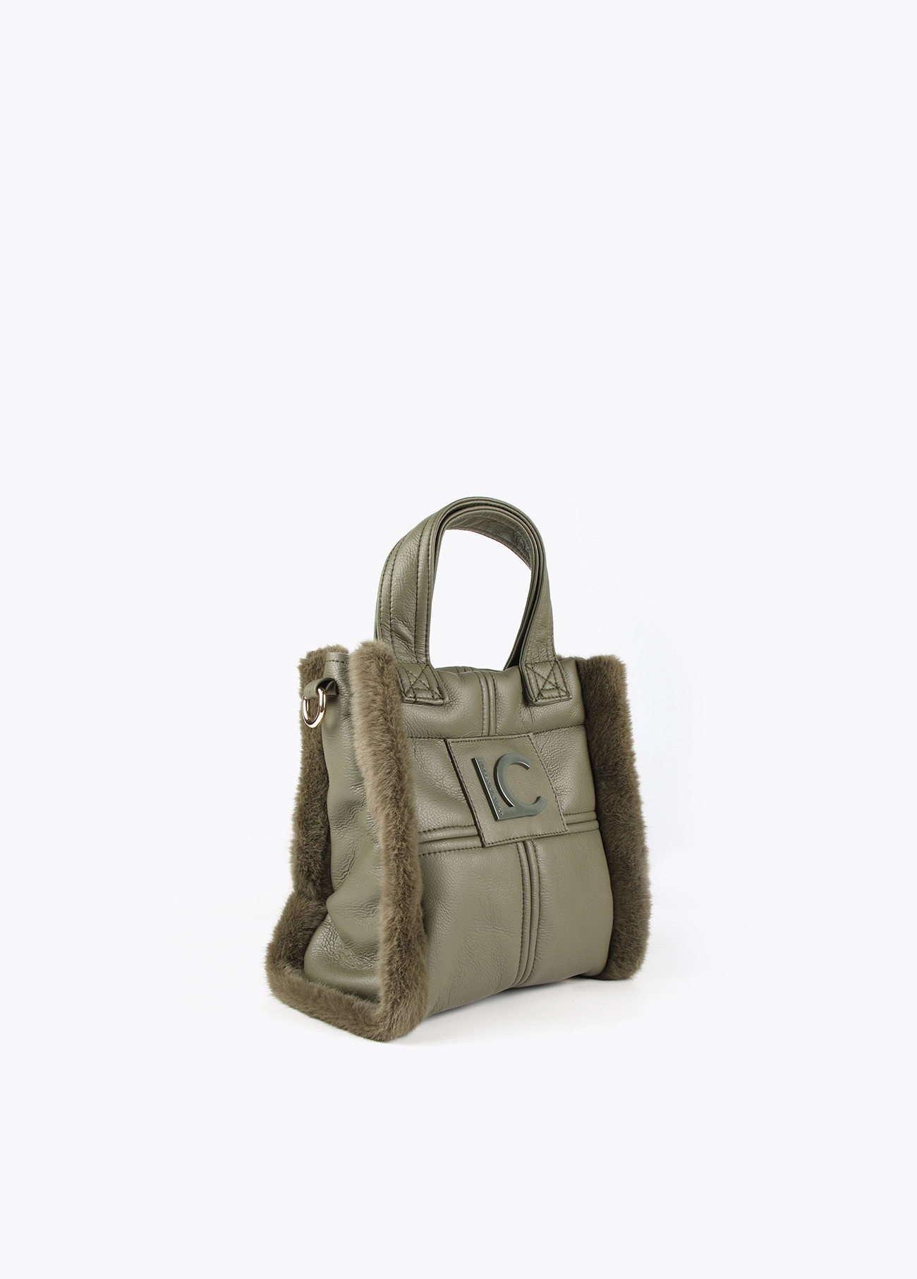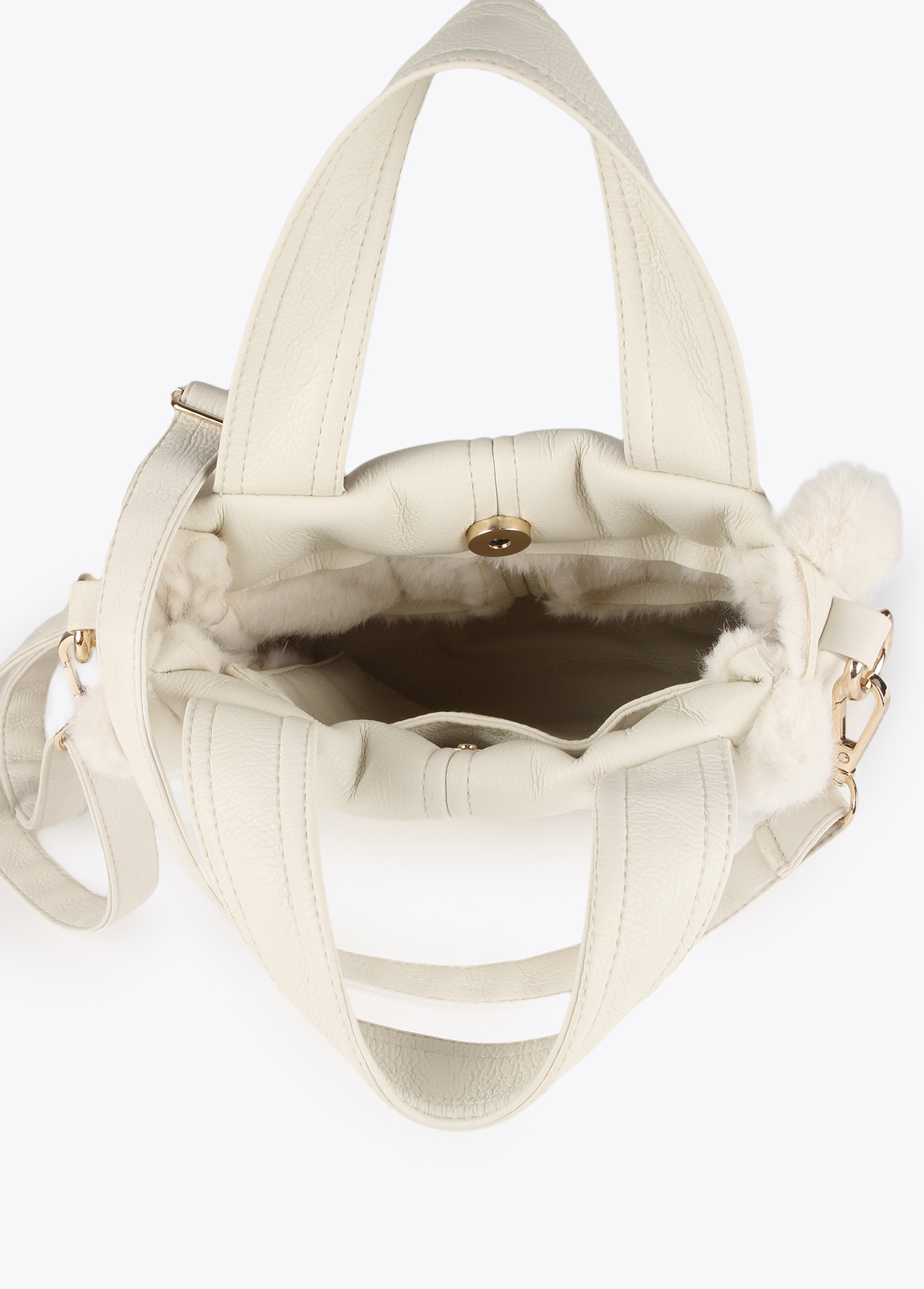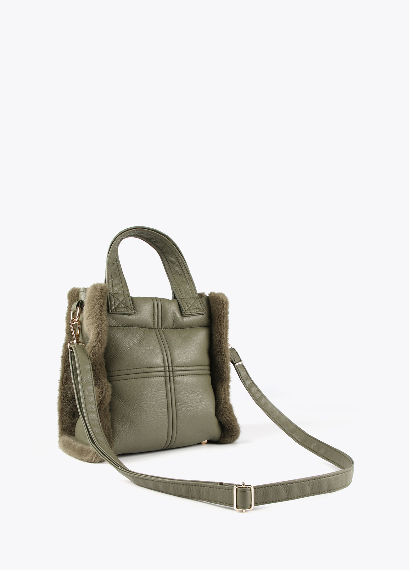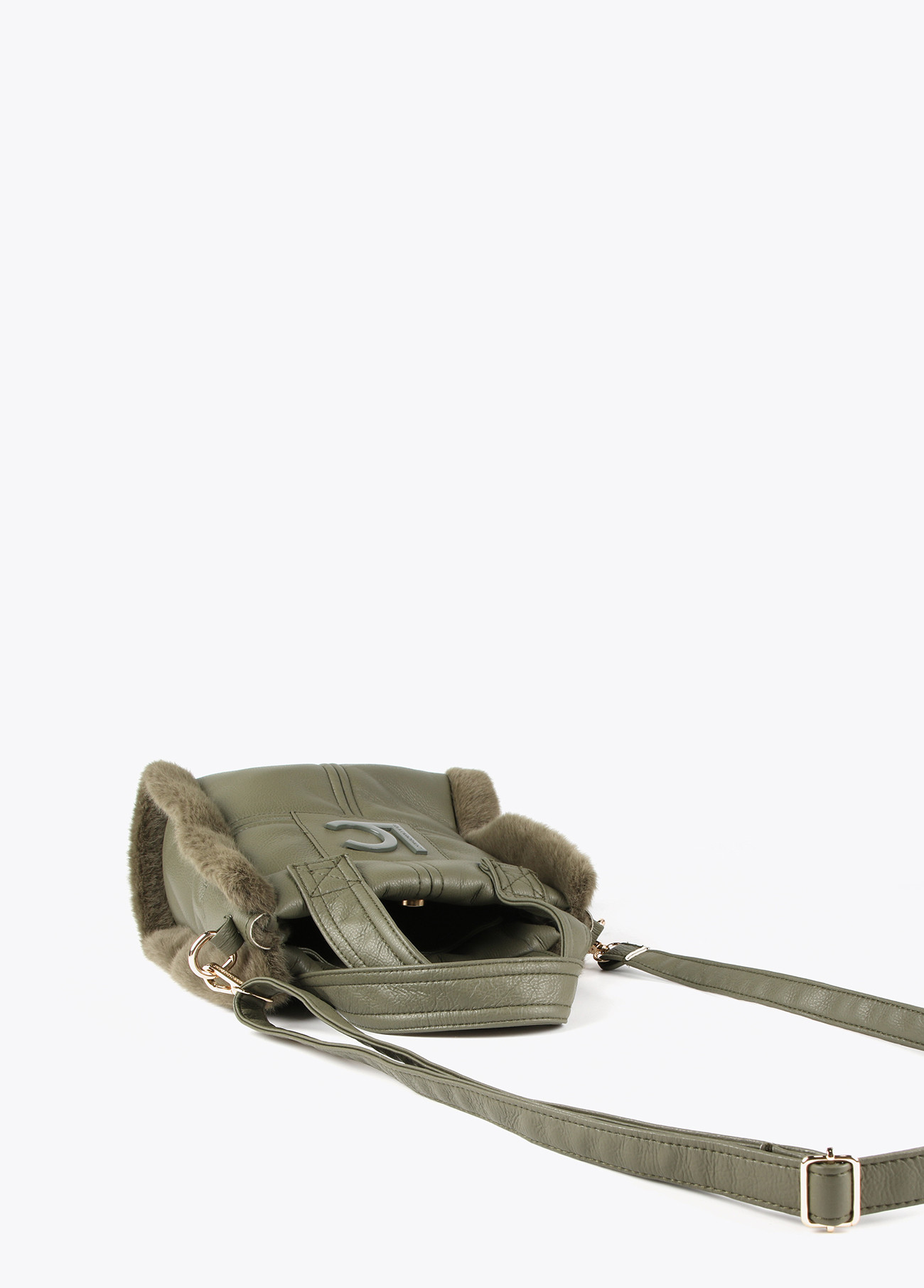 Bolso tipo bandolera en efecto piel y efecto pelo combinados. Asas de mano y asa bandolera ajustable y extraíble. Cierre con botón imantado y logo lacado en parte frontal.