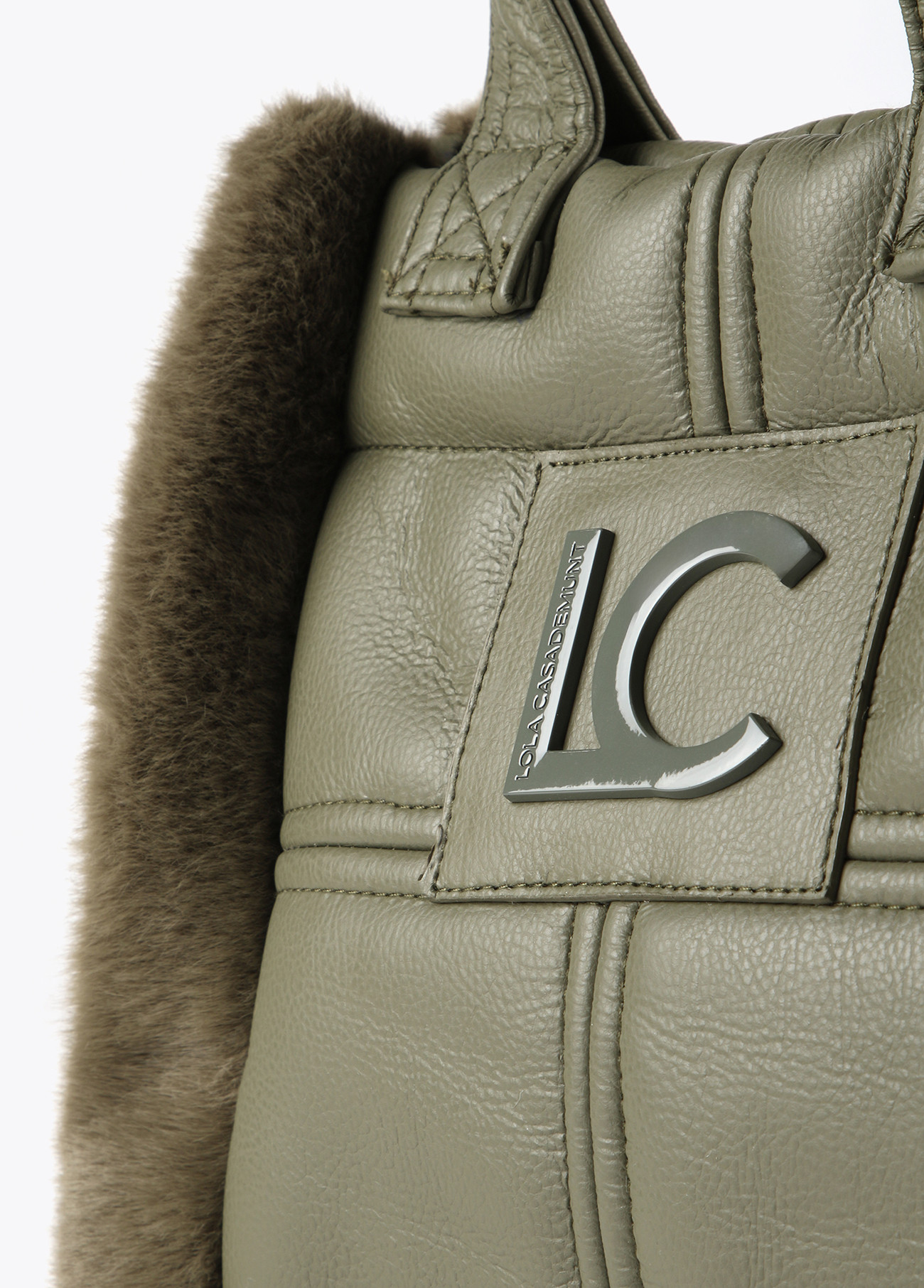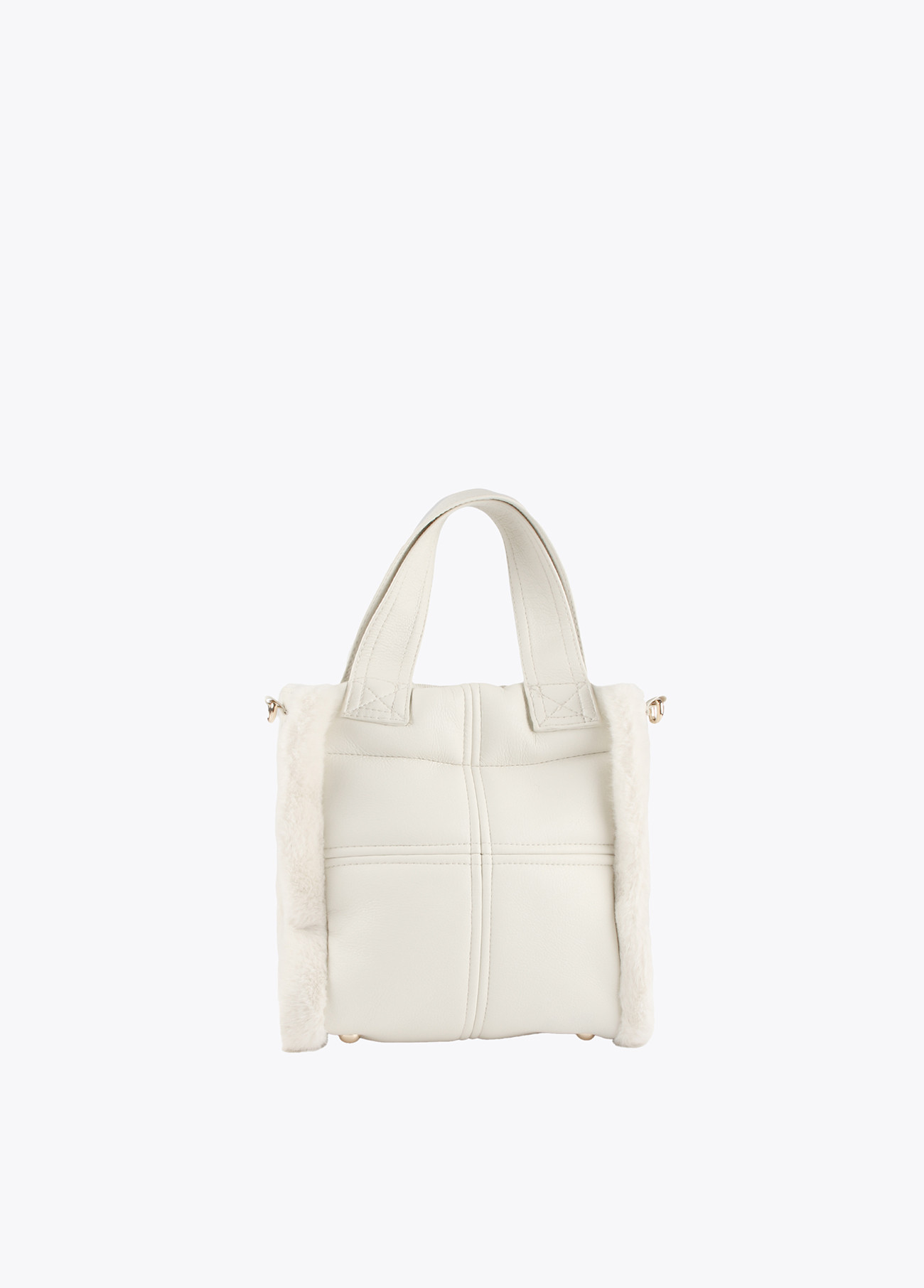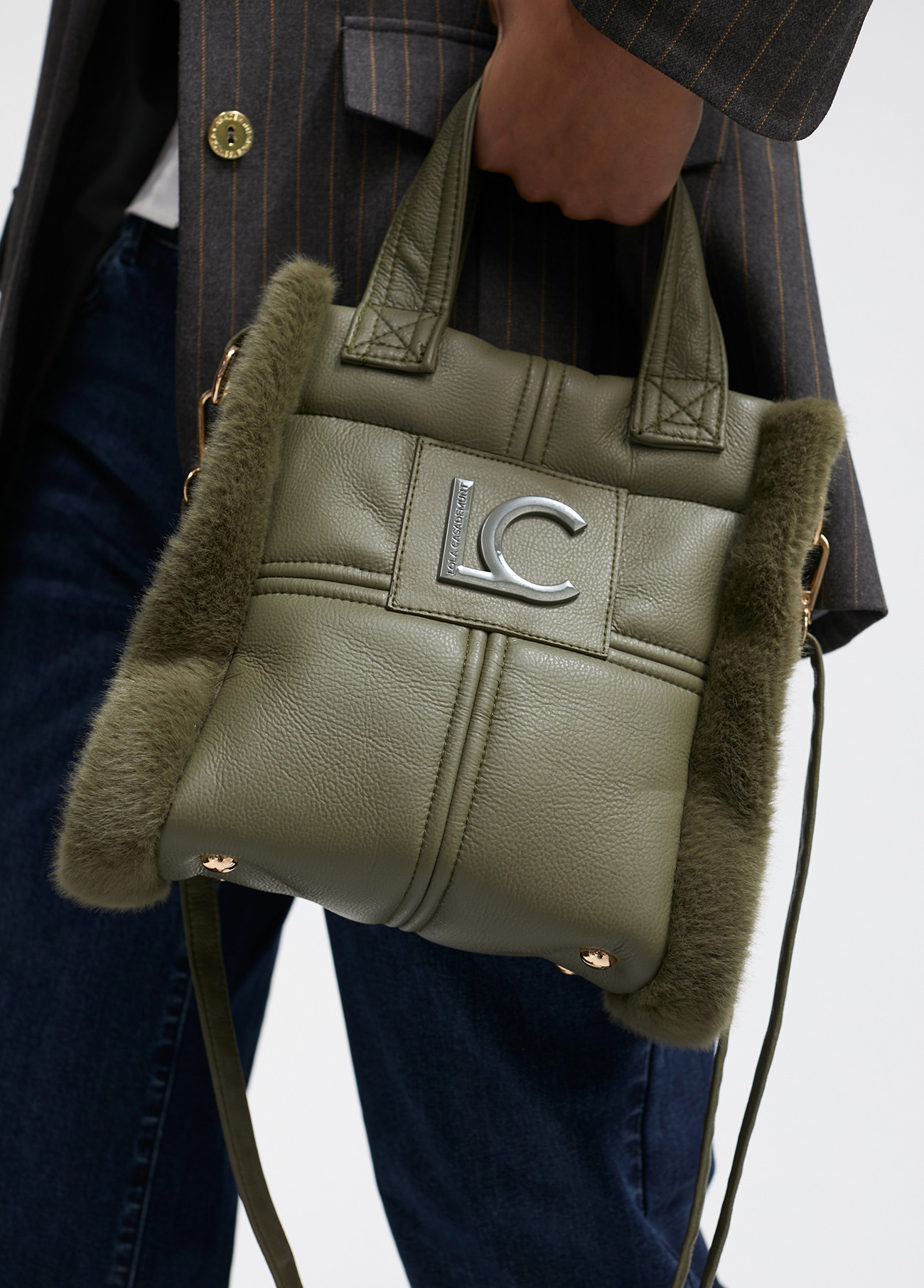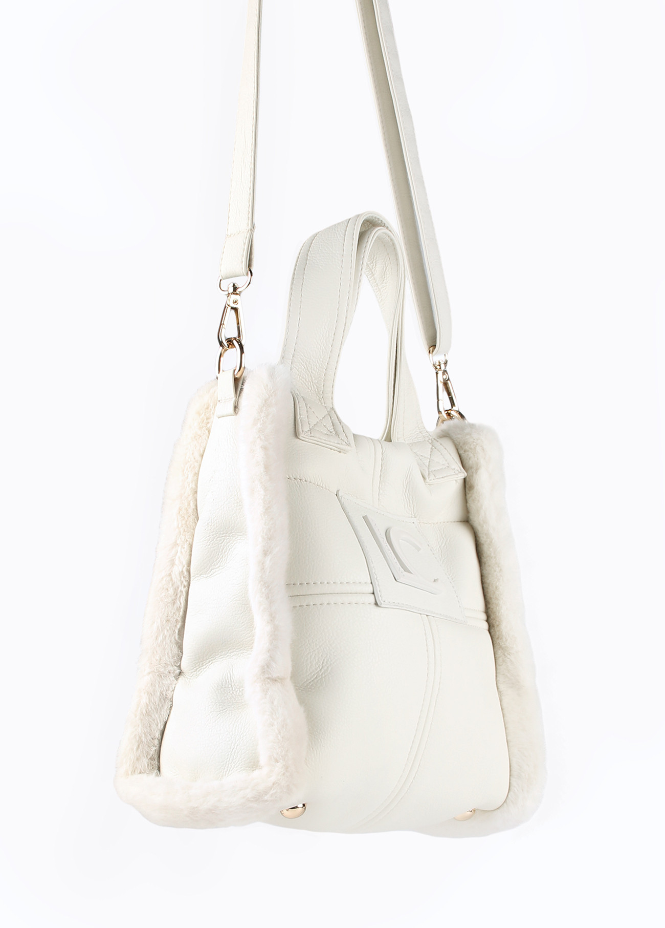 Bolso tipo bandolera en efecto piel y efecto pelo combinados. Asas de mano y asa bandolera ajustable y extraíble. Cierre con botón imantado y logo lacado en parte frontal.