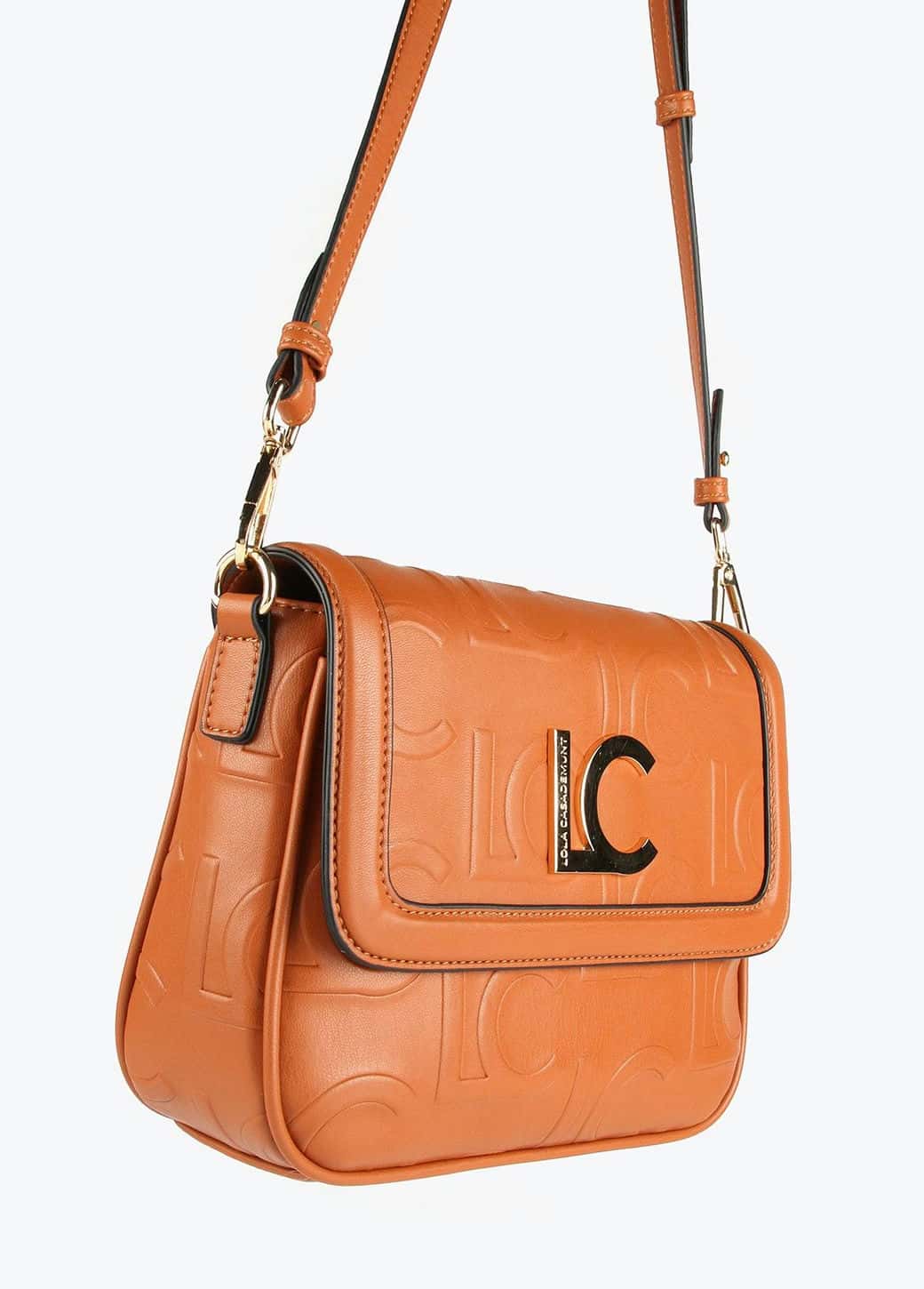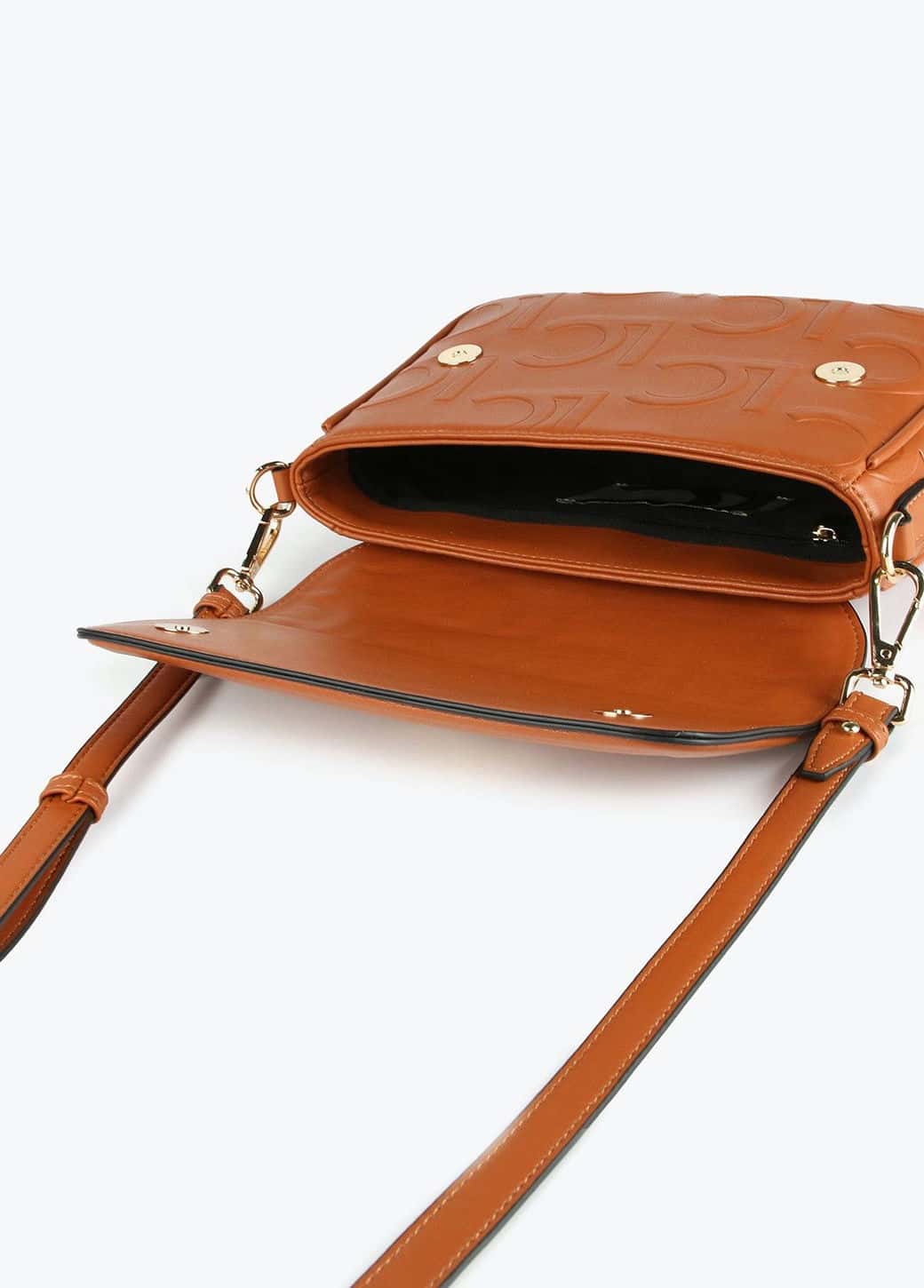 Bolso tipo bandolera logotipada con logo dorado en parte frontal. Cierre con doble botón imantado en la solapa. Asa bandolera regulable y extraíble.