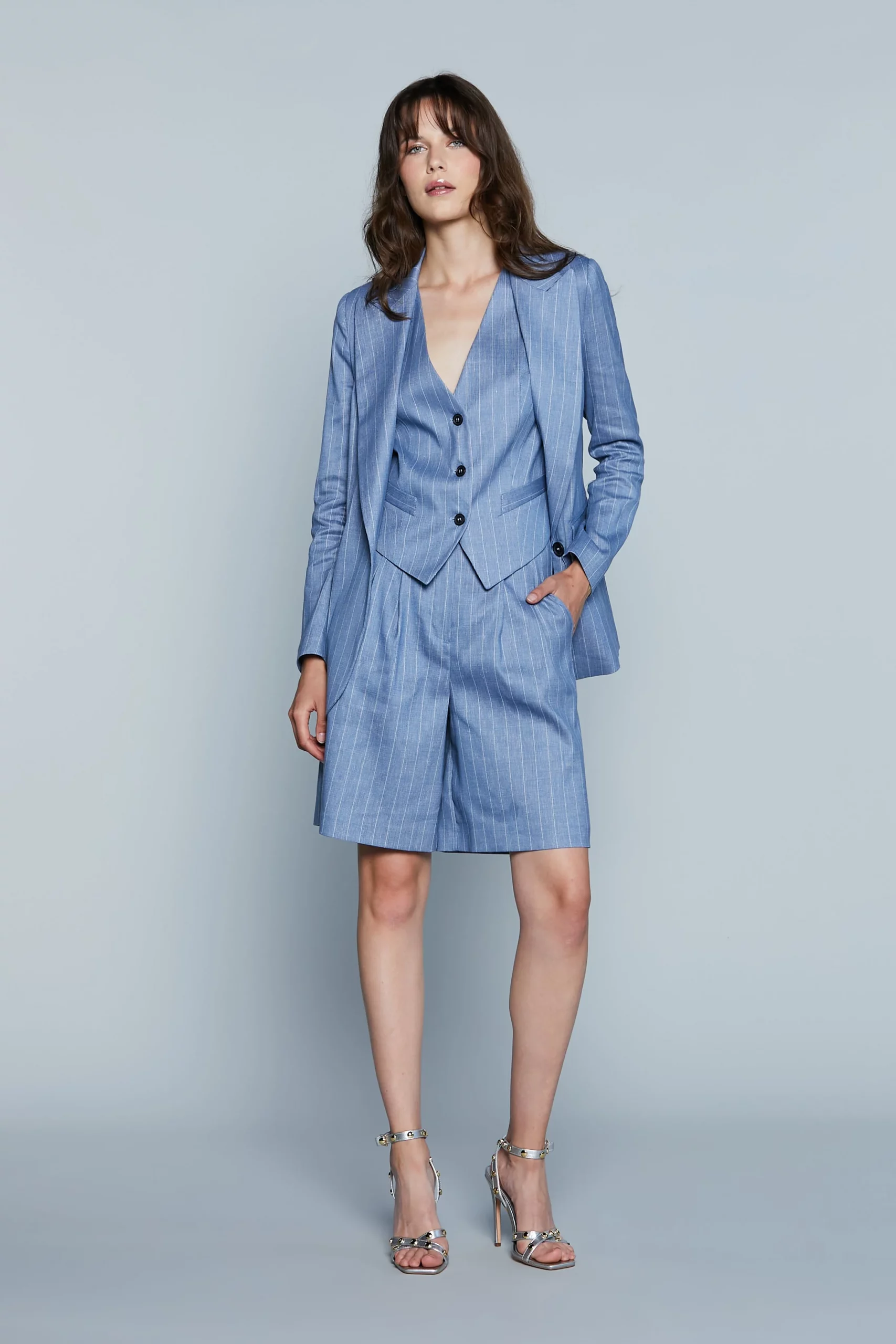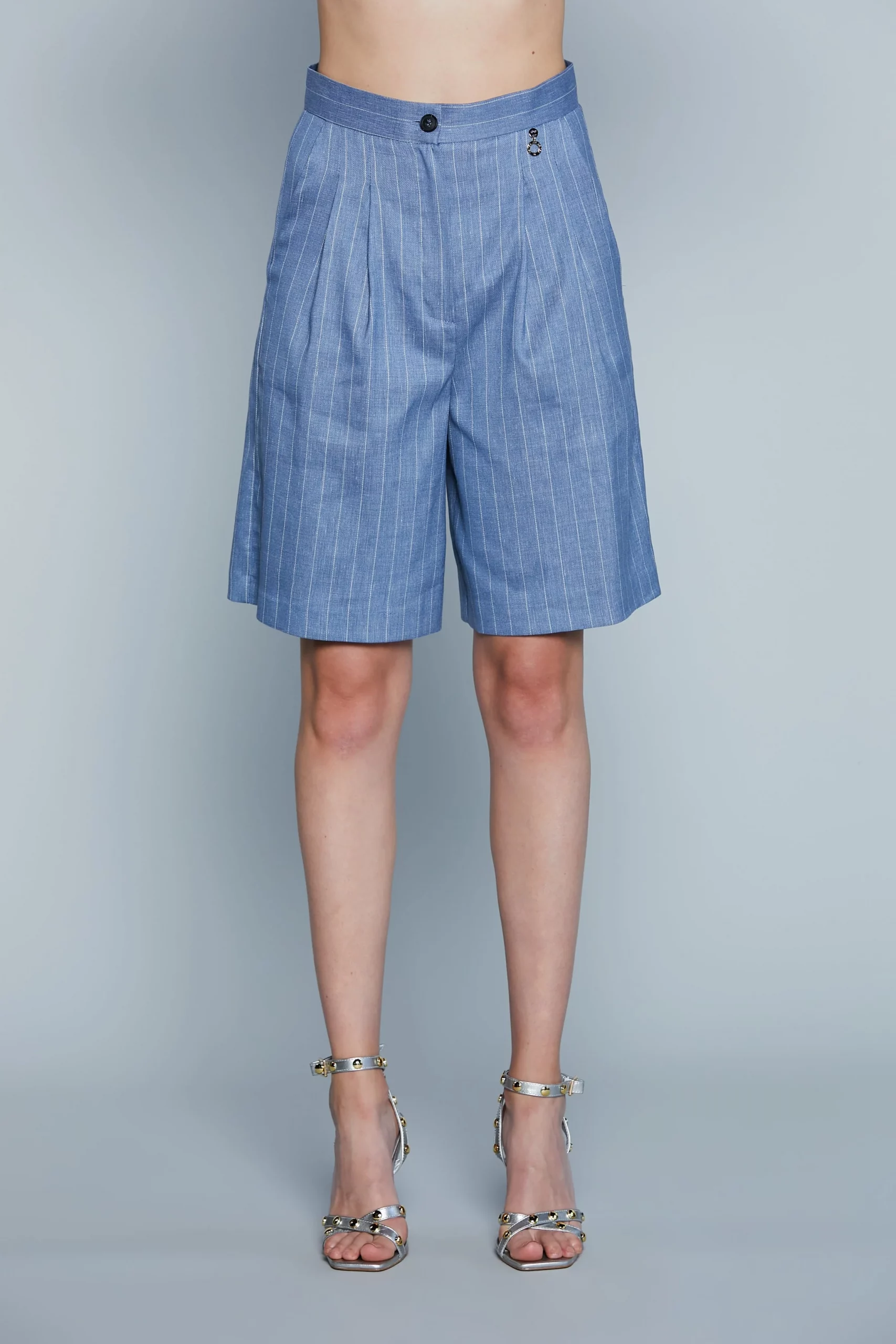 Estos pantalones cortos bermudas combinan elegancia y practicidad con un diseño contemporáneo y entallado. Con cintura alta que realza la silueta, presenta pliegues frontales que aportan volumen y estructura para un look sofisticado. La tela de raya diplomática proporciona una estética refinada, perfecta para combinaciones formales o casuales-elegantes. Ideales para conjuntos básicos o de verano, las bermudas Melita_C son un imprescindible para quienes buscan un estilo moderno y atemporal.