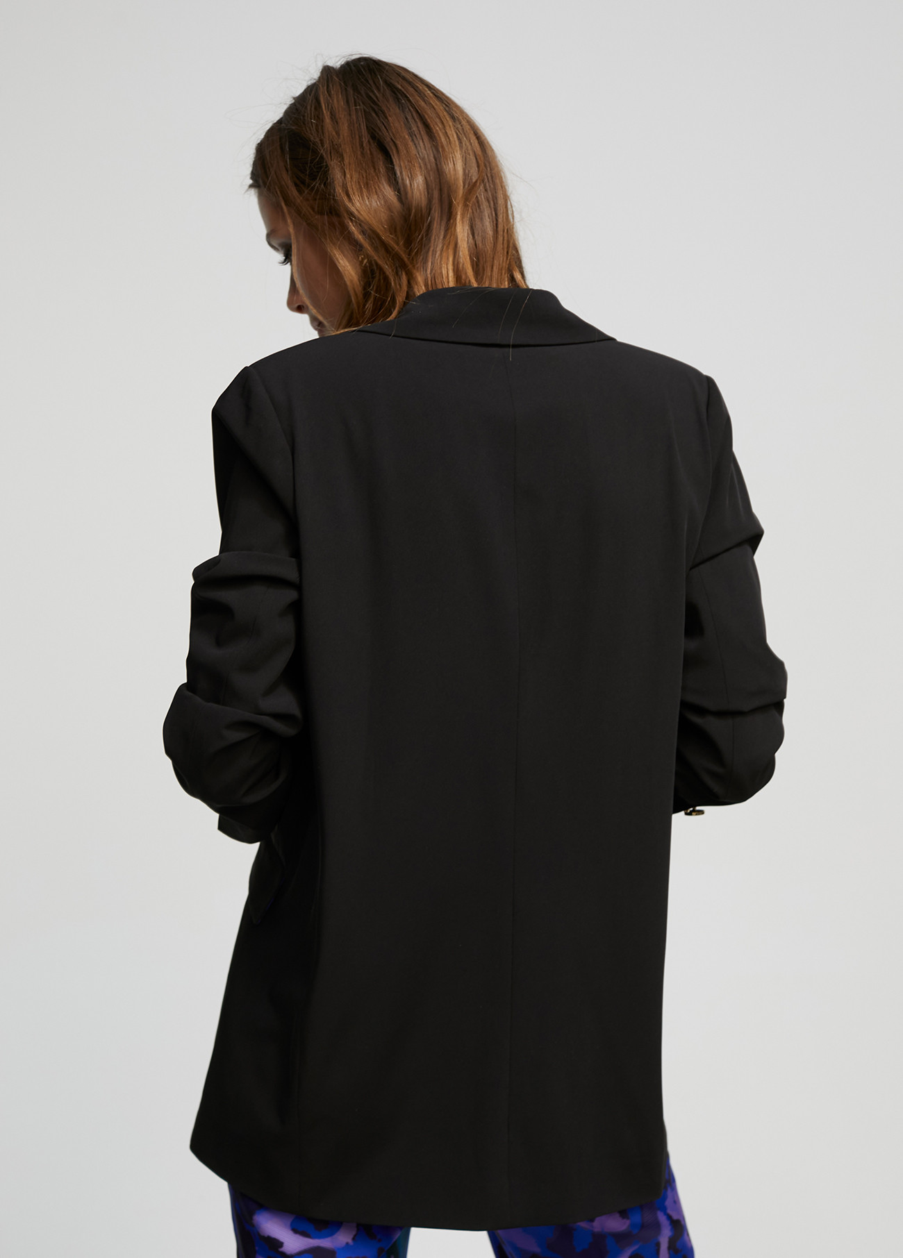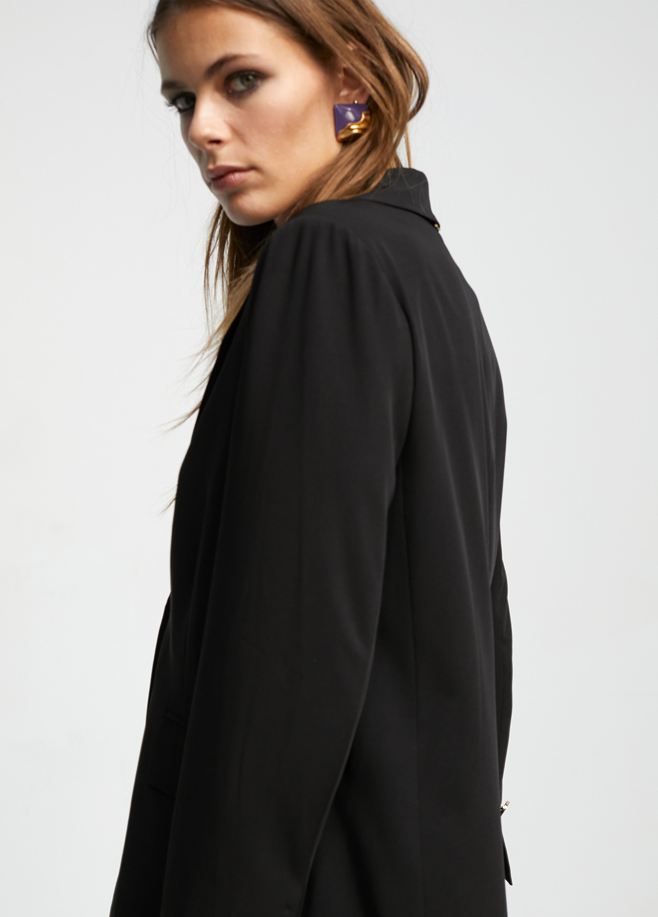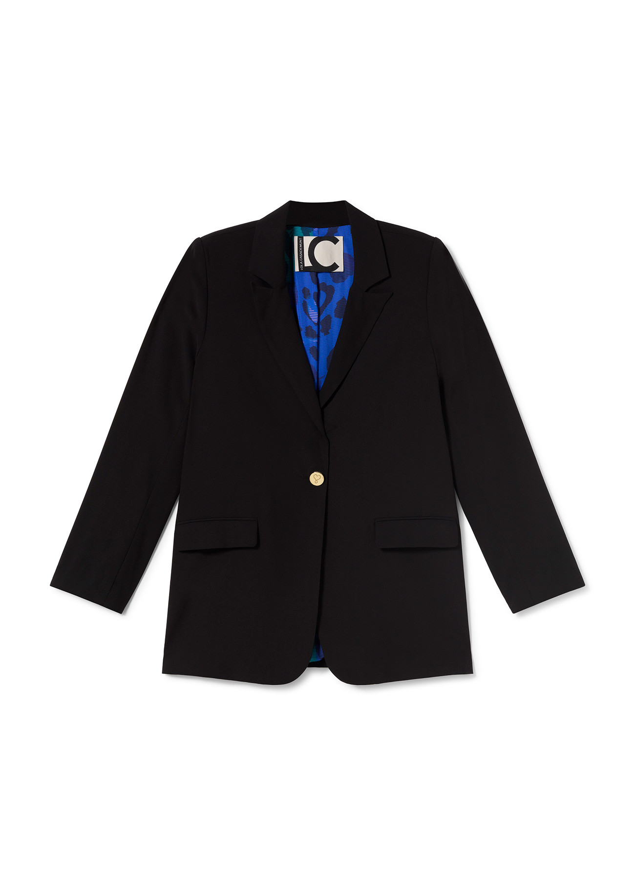 Blazer cerrado con botón dorado. Bolsillos con tapete. Forro en estampado animal contrastado.