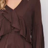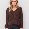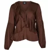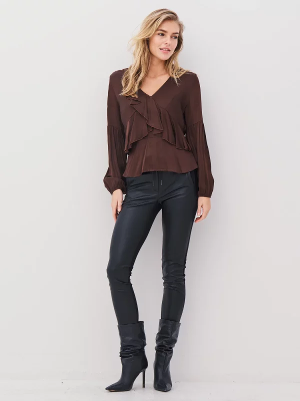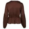 La blusa tiene un acabado ligero y brillante con elegantes volantes en la parte delantera, creando una silueta femenina y dinámica. Presenta mangas largas y voluminosas con frunces y un discreto elástico en la cintura, que crea un ligero efecto peplum y realza la figura. El suave escote en V acentúa su expresión romántica, haciéndola ideal tanto para el día a día como para la noche.