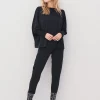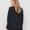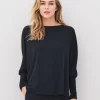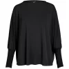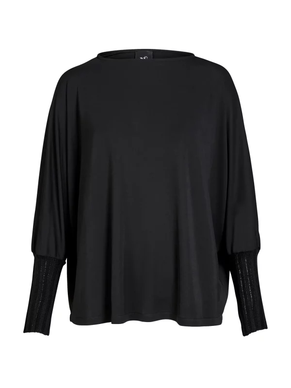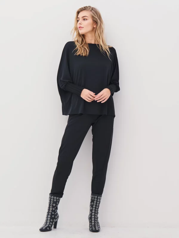 La blusa tiene un corte holgado y cómodo, con mangas murciélago anchas que se fruncen en puños largos de punto acanalado. El cuello redondo y el diseño sencillo la hacen fácil de combinar, mientras que los llamativos acabados de las mangas le aportan carácter y estilo. La tela tiene una caída suave, creando una silueta relajada y elegante.