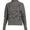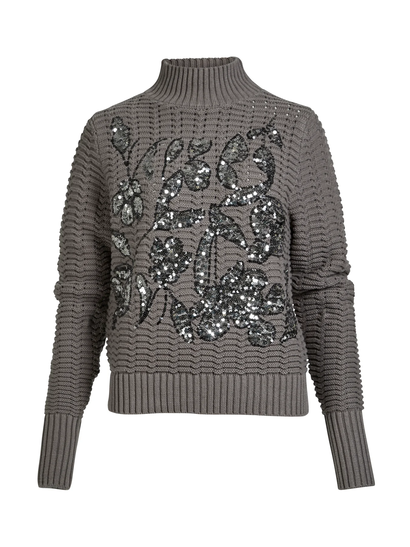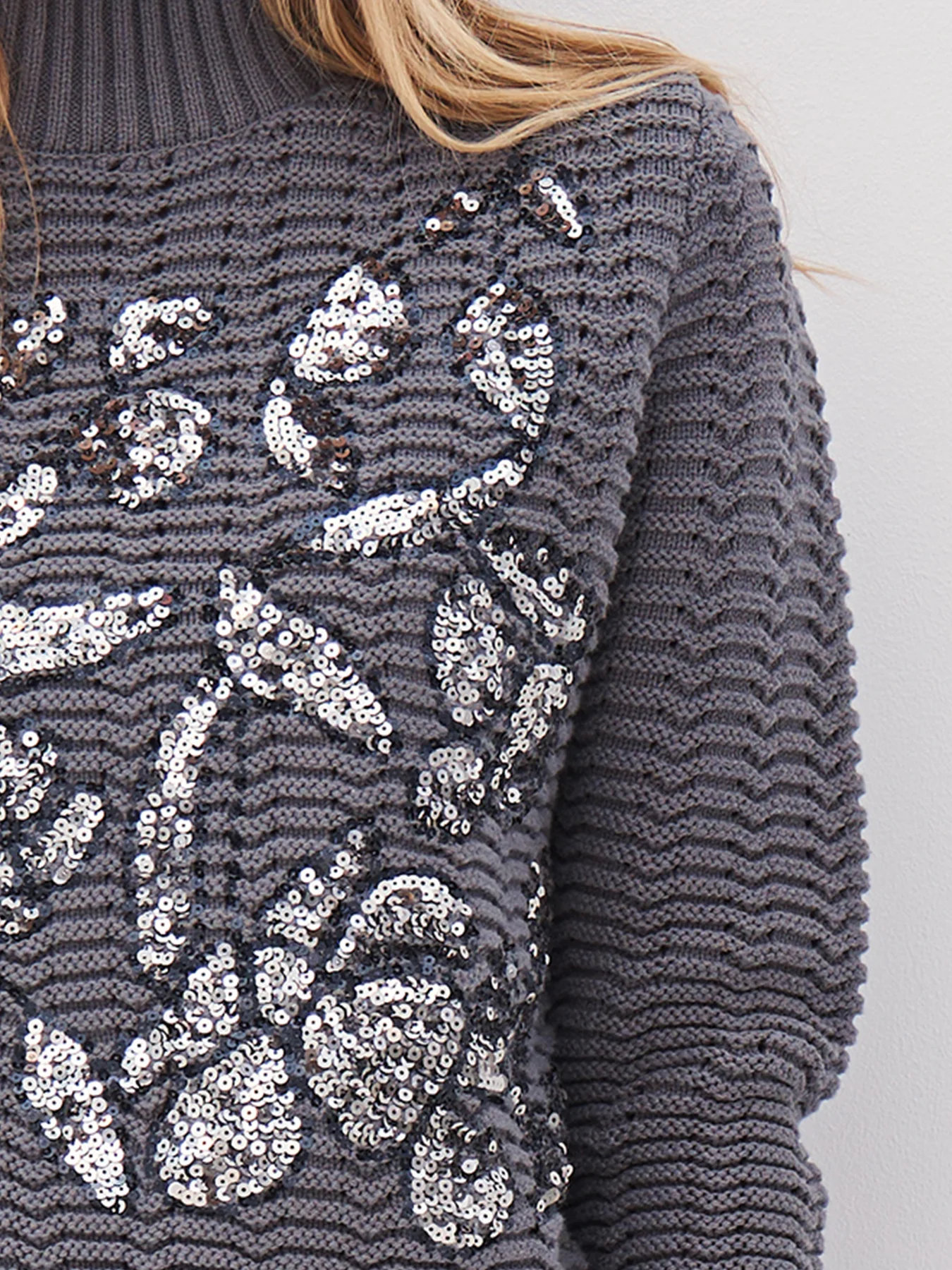 Este suéter de punto combina comodidad y glamour gracias a su estampado de lentejuelas en la parte delantera. Tejido con una estructura definida y un patrón ondulado, presenta un cuello alto de canalé que le aporta un toque cálido y elegante. Los puños y el bajo de canalé completan su diseño equilibrado.