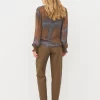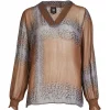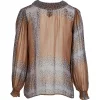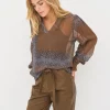 Blusa ligera y elegante con estampado gráfico y finos detalles. Tiene escote en V, manga larga y volantes. Su textura vaporosa le da una hermosa caída y la hace cómoda para usar todo el día.