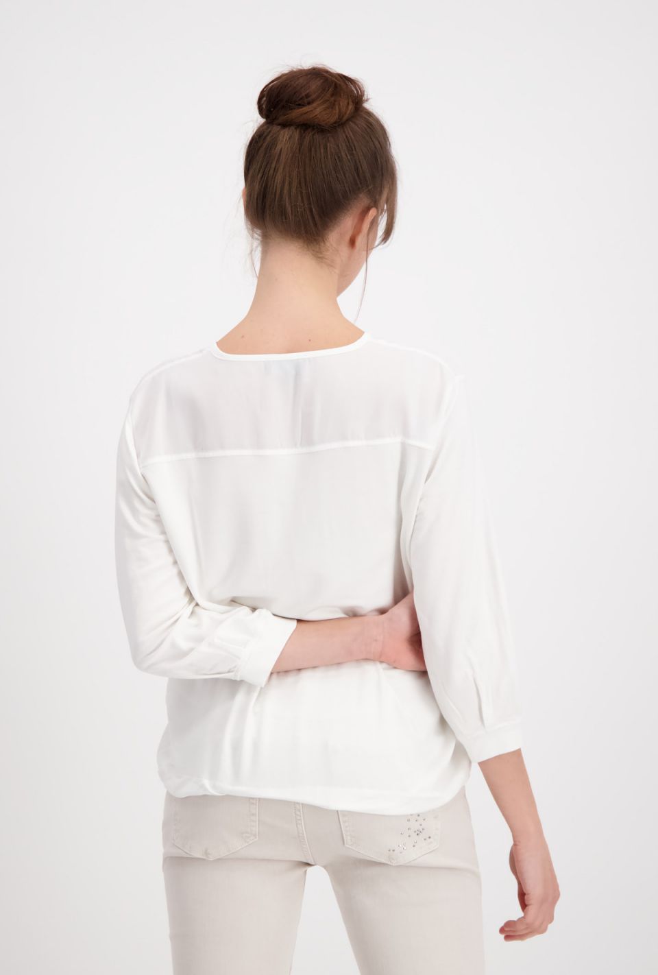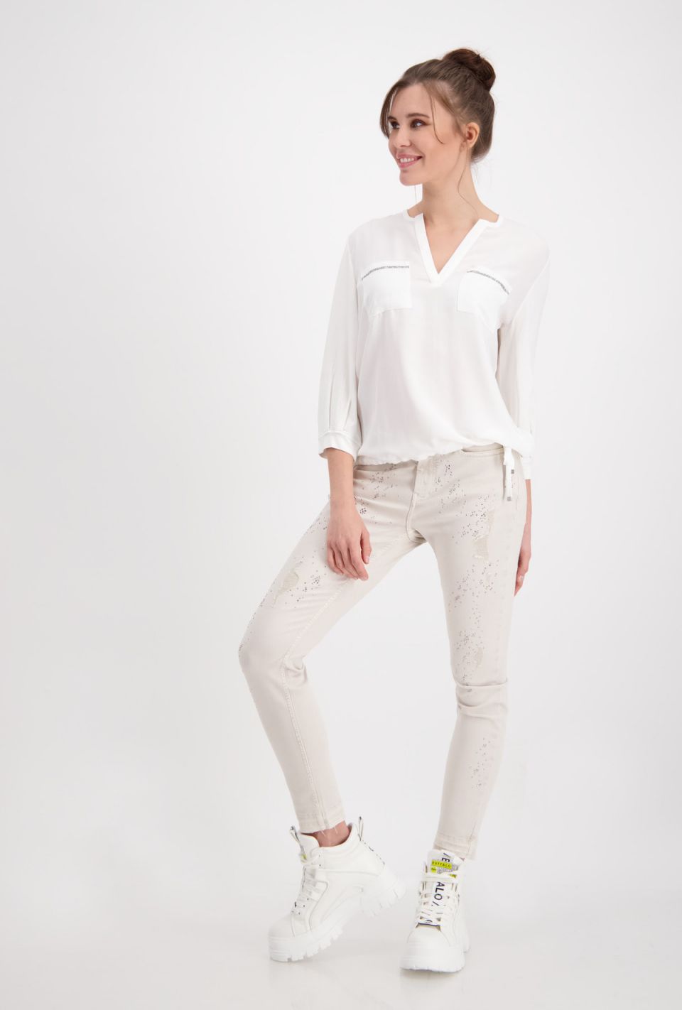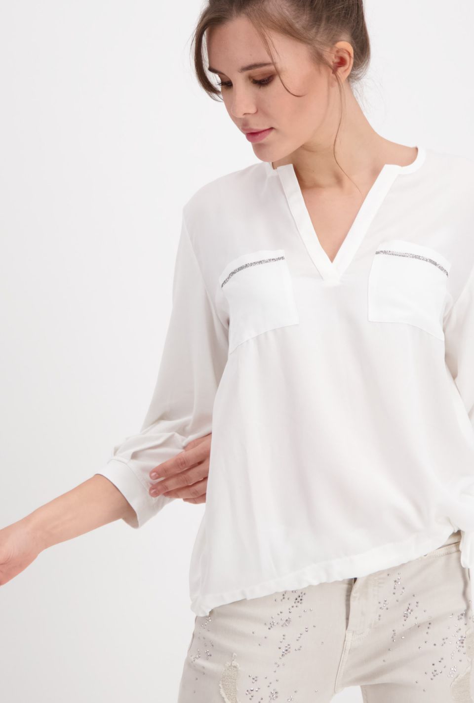 Disfruta de una camisa de manga larga femenina en un estilo de blusa deportiva. El cuello blanquecino hecho de una combinación de tela tejida y tela de jersey promete un ajuste cómodo. Corte estándar holgado con escote abierto, bolsillos de parche con brillantes, paneles de pedrería en el pecho y cordón con lazo en el bajo.