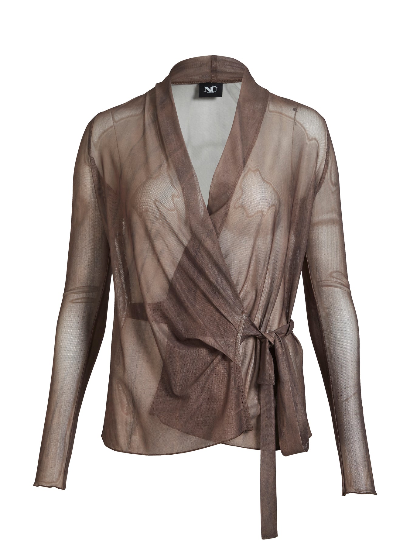 Esta blusa cruzada está confeccionada en una malla ligera y transparente que le da un aire elegante y vaporoso. Se cierra con una banda lateral para ajustarla a tu gusto. El drapeado frontal crea una silueta femenina, mientras que las mangas largas y la suave caída la hacen ideal tanto para el día a día como para la noche.