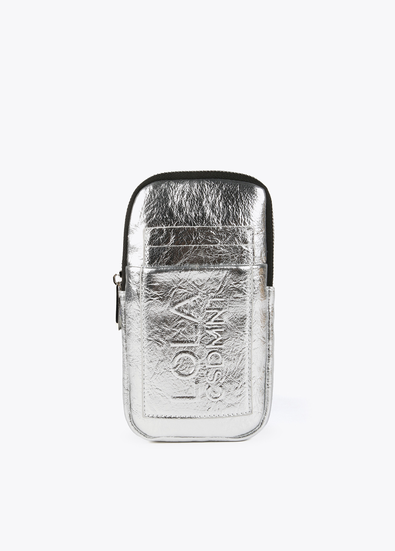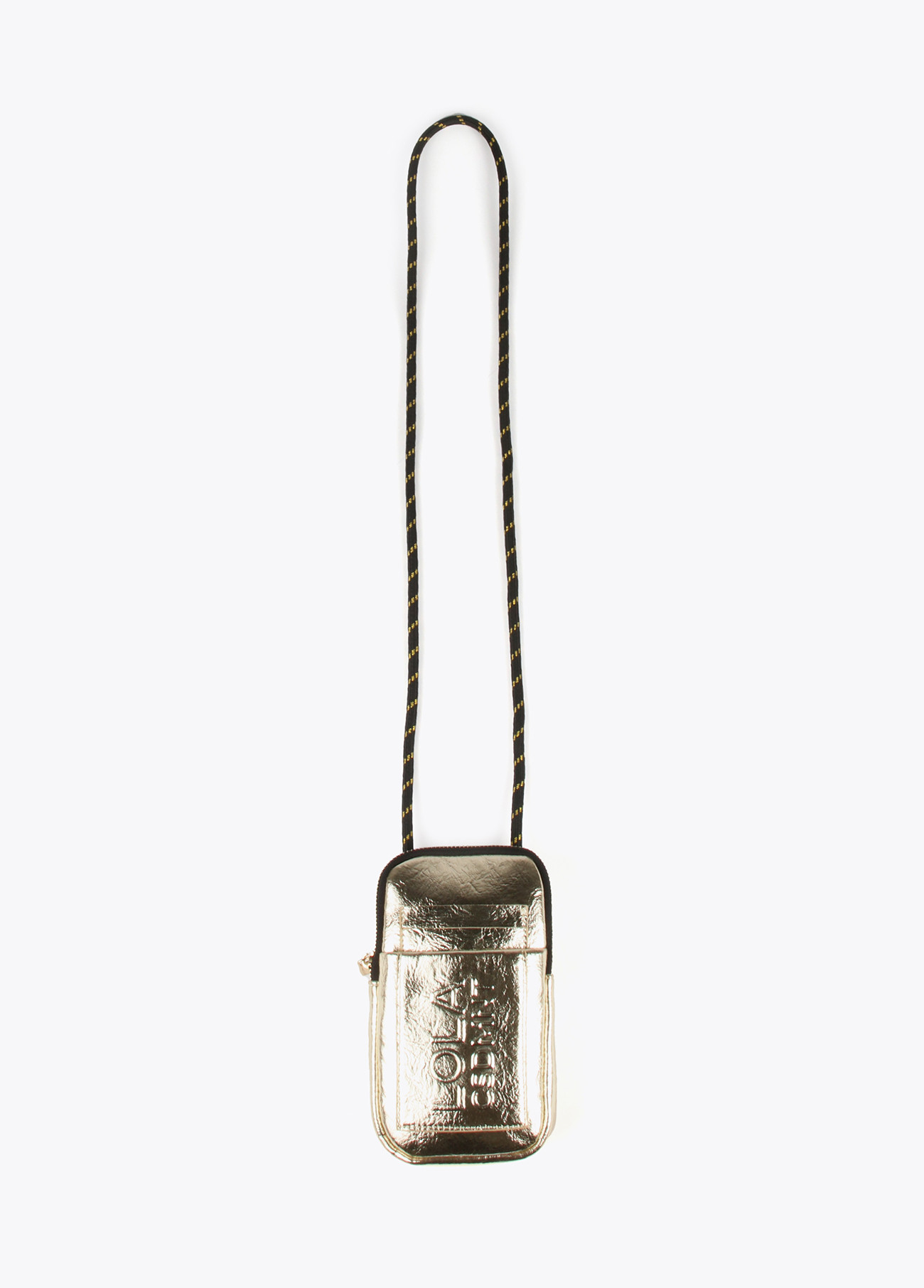 Bolsito porta móvil metalizado con logo grabado en relieve y cierre de cremallera. Asa bandolera de cordón ajustable.