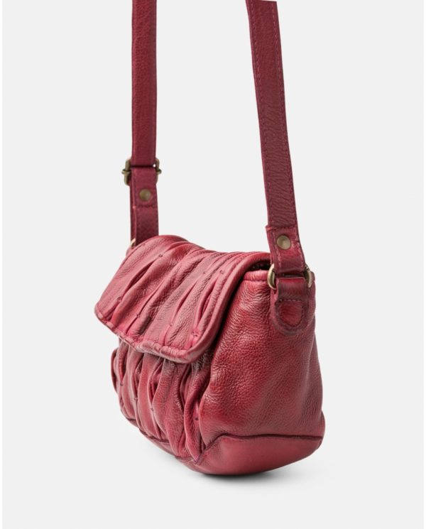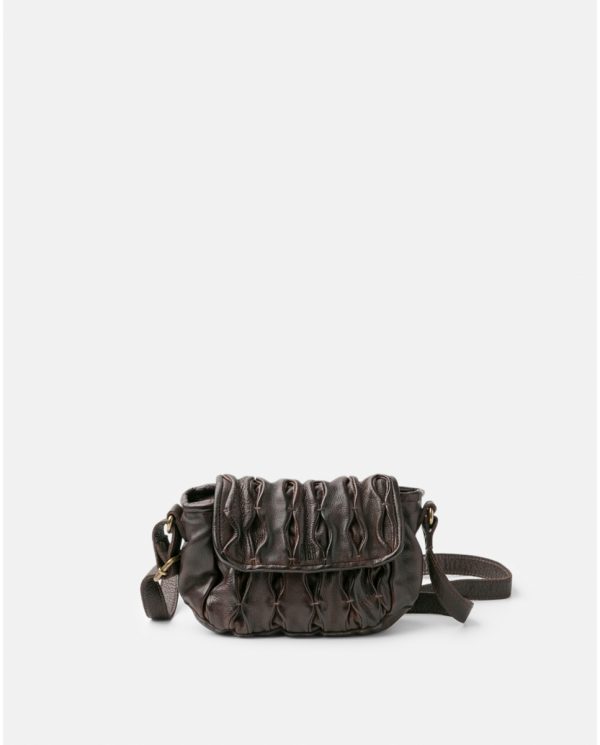 Bolso pequeño de piel vacuna lavada. Destacan los pliegues de piel en la solapa y parte frontal del bolso. Bandolera regulable y extraible. Cierre con cremallera. Bolsillos internos. Forro de algodón.