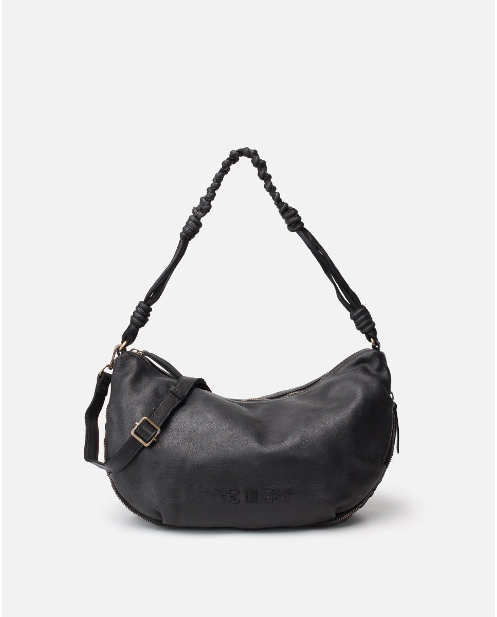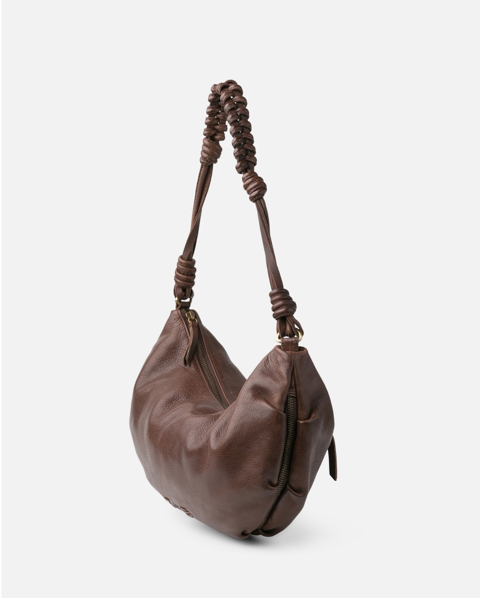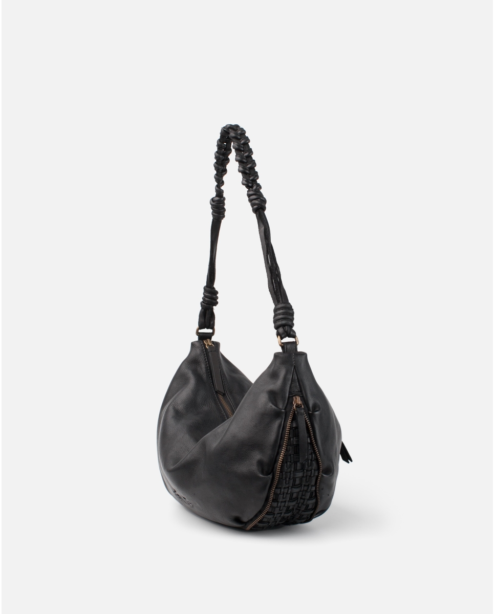 Hobo de piel vacuna lavada. Precioso trenzado a mano del fuelle y del asa de hombro. Cierre con cremallera, bandolera ajustable y extraible, bolsillos externos e internos, y forro de algodón.