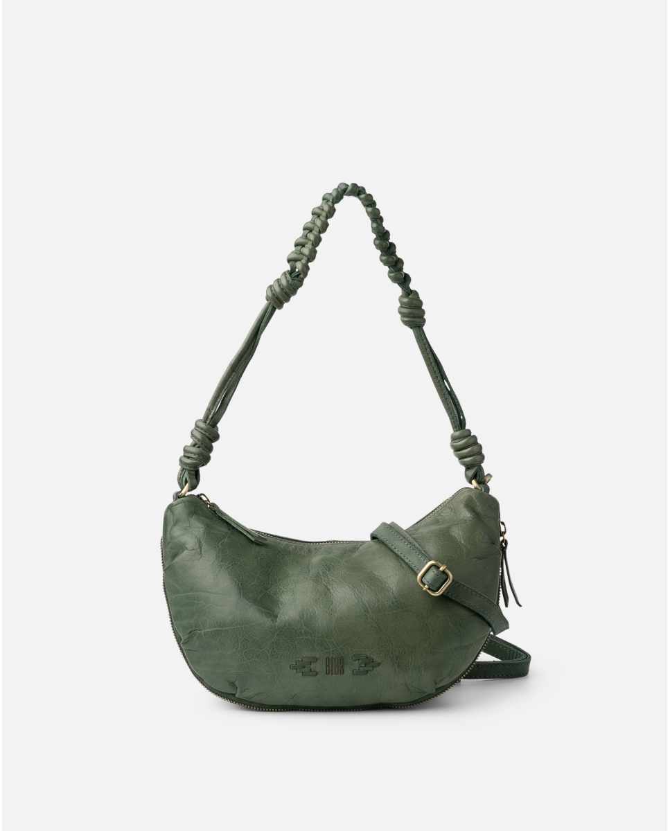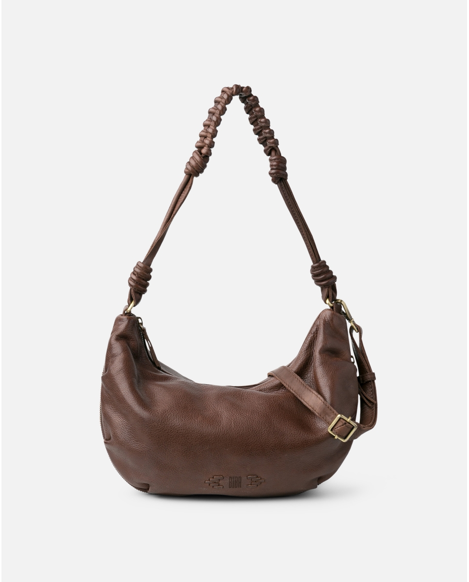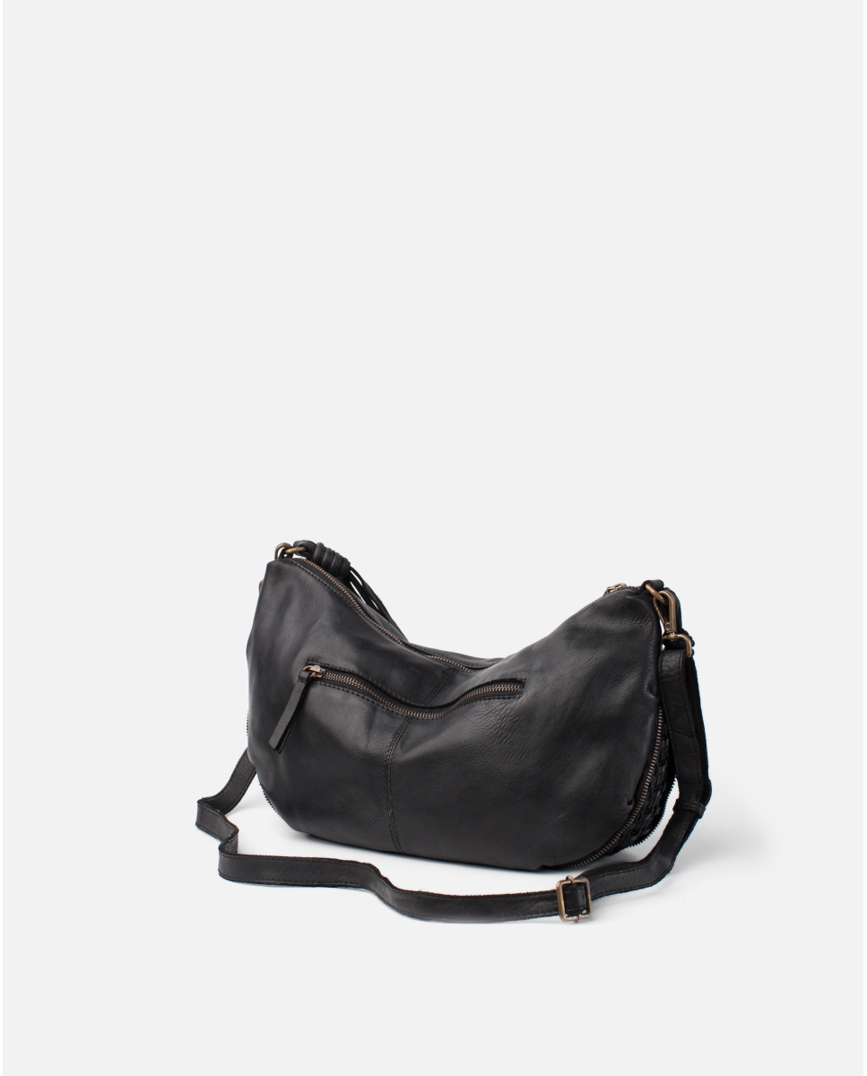 Hobo de piel vacuna lavada. Precioso trenzado a mano del fuelle y del asa de hombro. Cierre con cremallera, bandolera ajustable y extraible, bolsillos externos e internos, y forro de algodón.