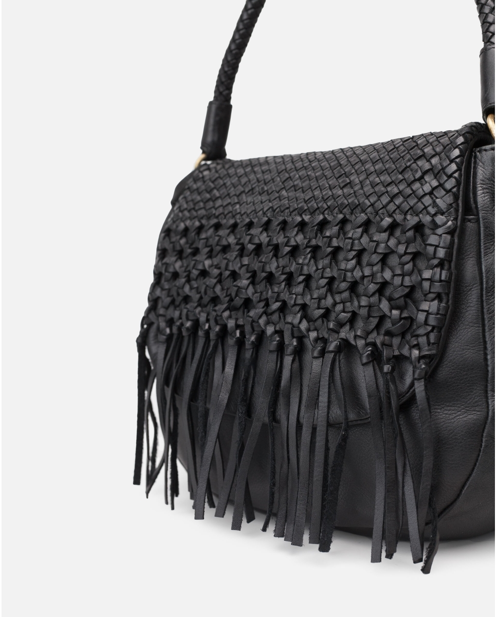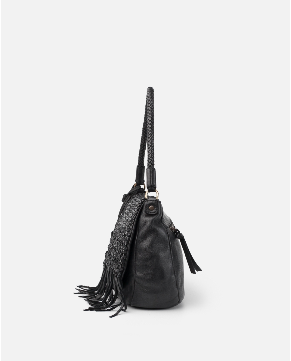 Hobo de piel vacuna lavada y trenzada a mano. Diferentes tecnicas de trenzado en la solapa, la cual cierra con boton y cremallera. Asa de hombro trenzada, bandolera ajustable y extraible, multiples bolsillos externos e internos, y forro de algodón.
