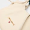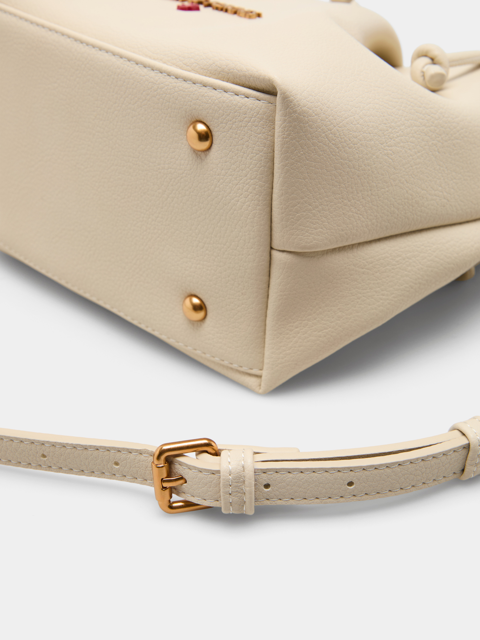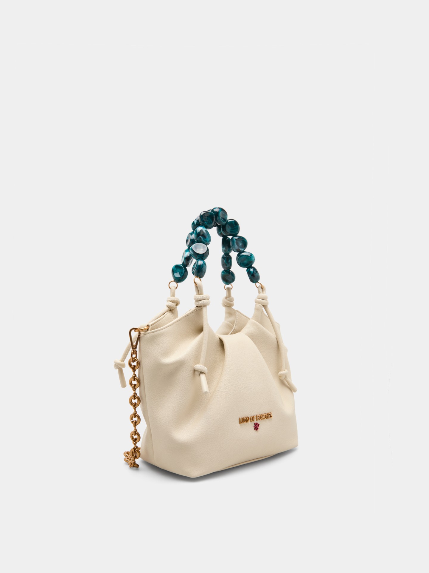 Bolso de mano de tamaño mediano. Cuenta con un asa superior decorada con piedras de resina azul y una correa de hombro ajustable y extraíble para mayor versatilidad en el día a día. El nombre de la marca está grabado en letras metálicas doradas en la parte frontal.