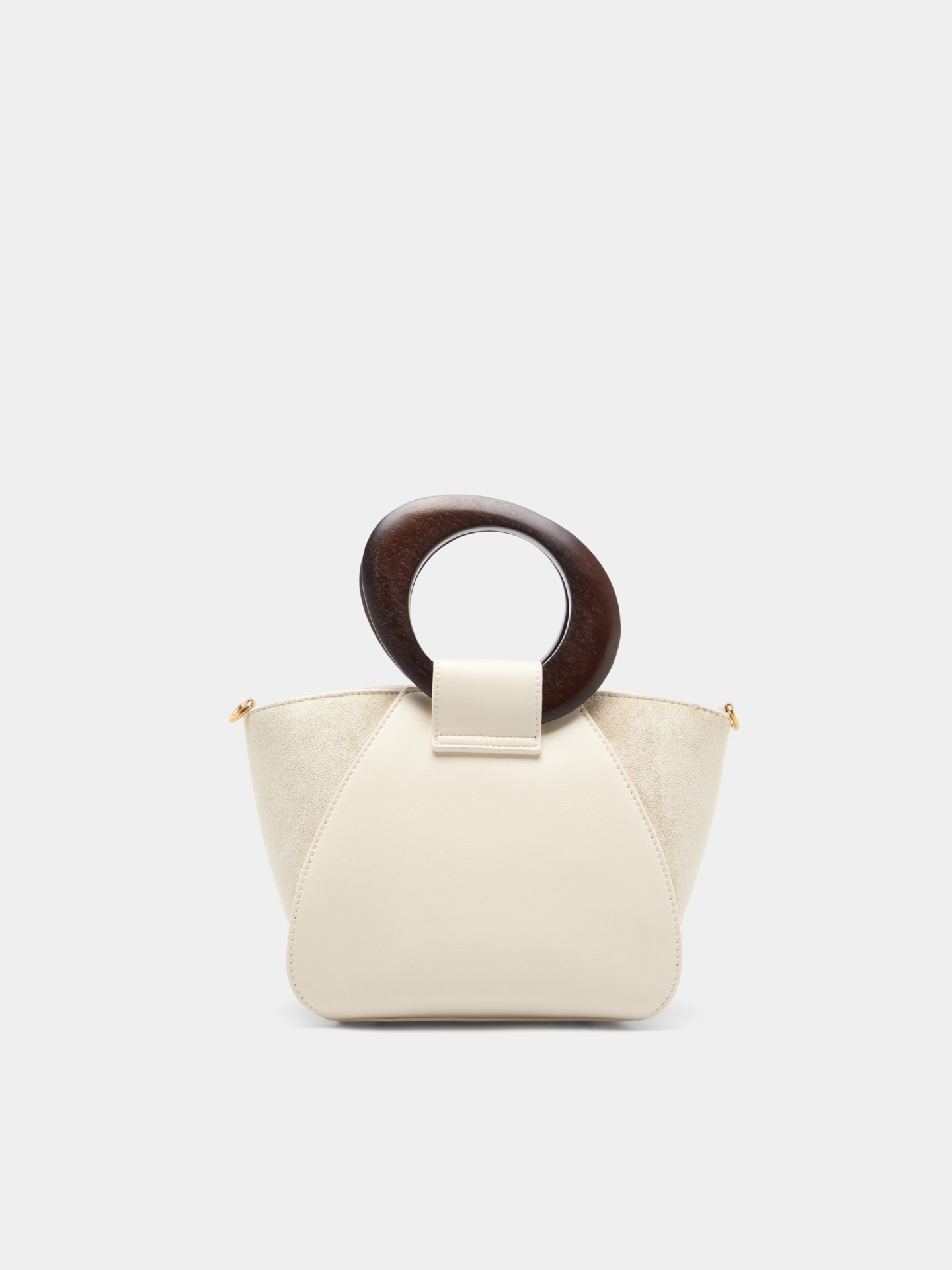 Minibolso confeccionado en una combinación de materiales, con un diseño contemporáneo y versátil. Cuenta con un asa fija de madera y una correa para el hombro ajustable y extraíble, lo que permite llevarlo de diferentes maneras. Incluye un logotipo en contraste en la parte delantera y una abertura superior con cierre de cremallera.