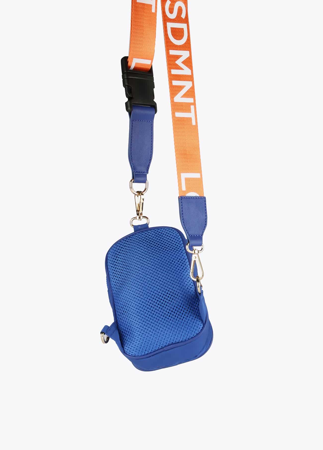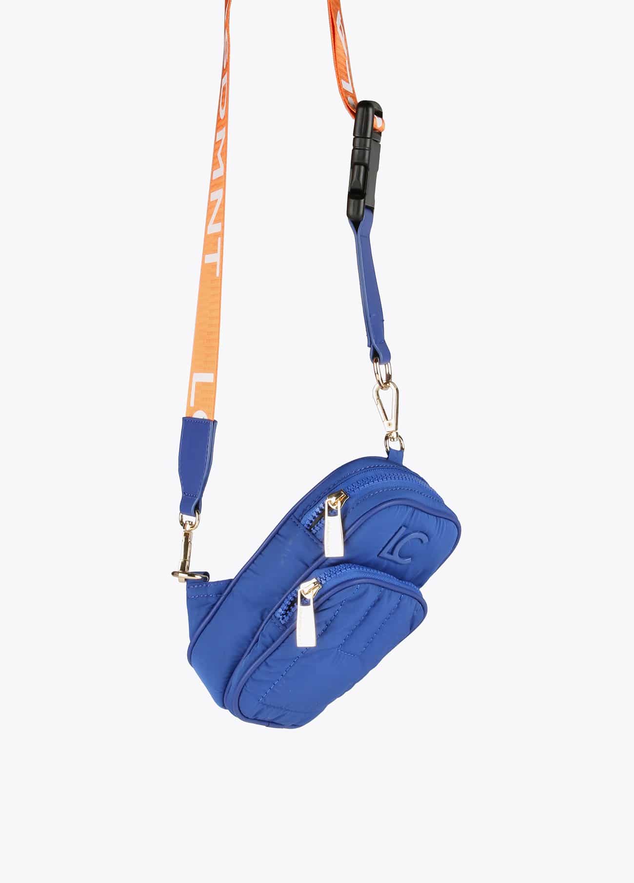 Bolso porta móvil acolchado con dos compartimentos y cierre de cremallera. Asa bandolera logotipada extraíble y ajustable y logo frontal lacado al tono.