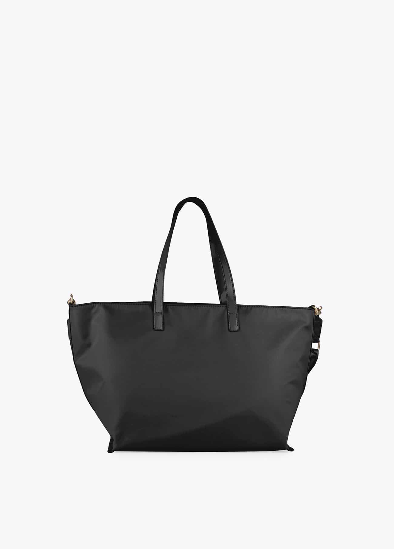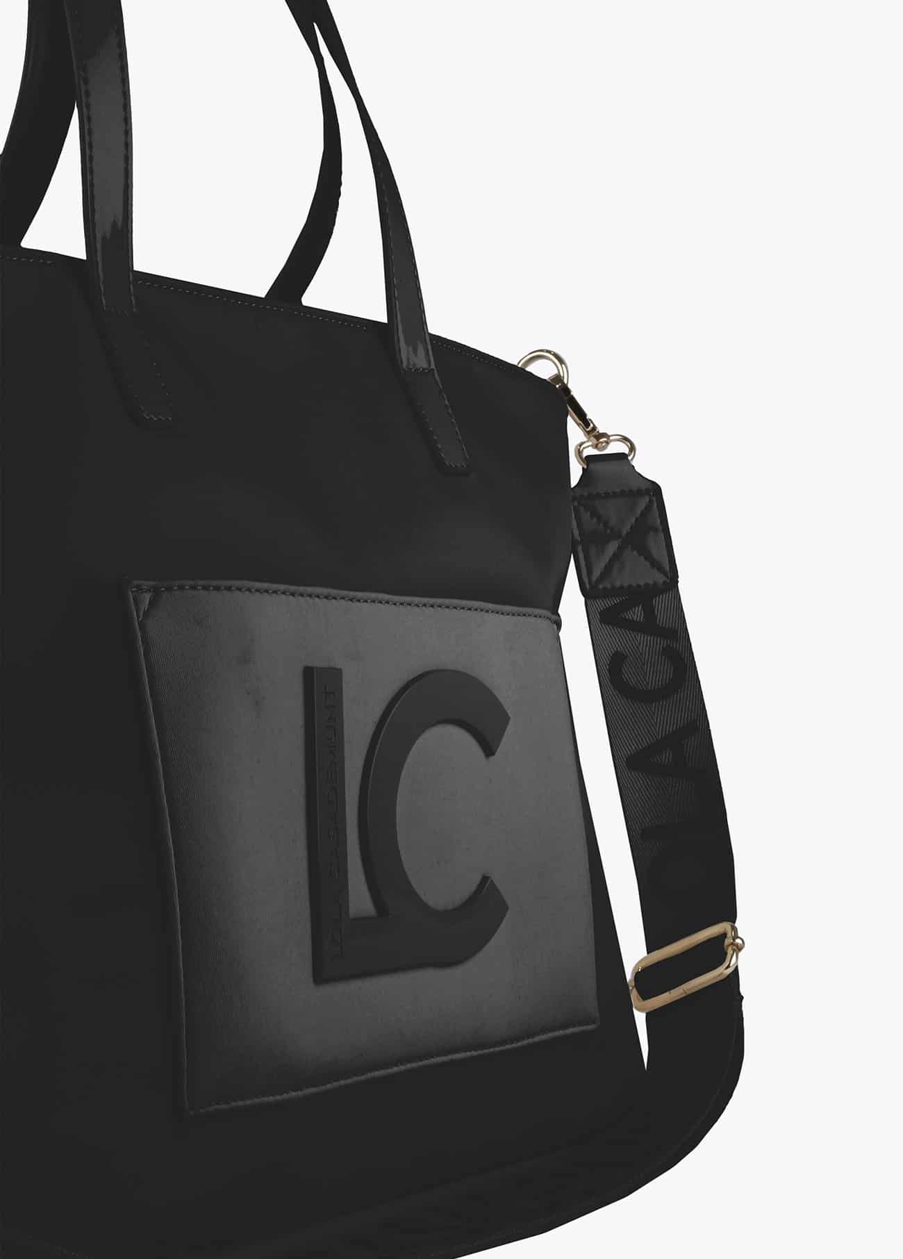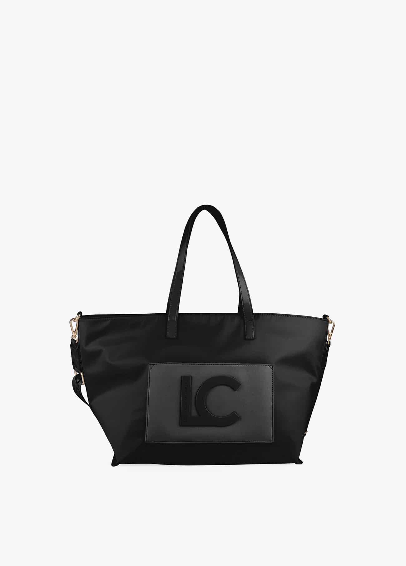 Bolso shopper con sello frontal LC con detalles en efecto piel y charol al tono. Asas de hombro y asa bandolera logotipada ajustable y extraíble. Cierre central y bolsillo interior con cremallera.