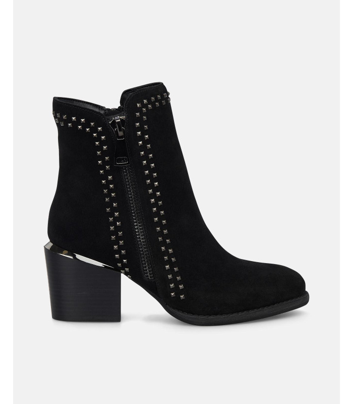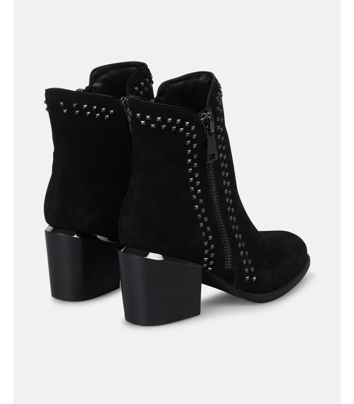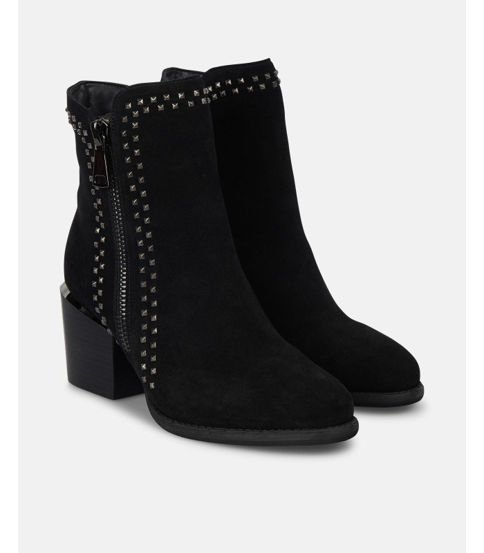 Botín con tacón para mujer con tachas. Con puntera redondeada, cierre con cremallera. La altura del tacón es de 7,5cm y la caña mide 15cm.