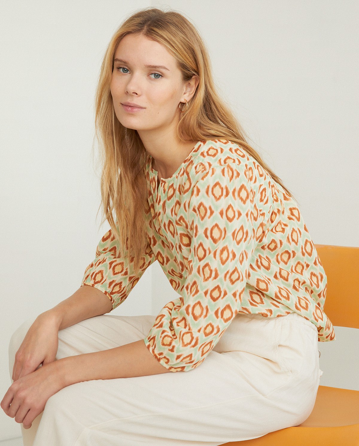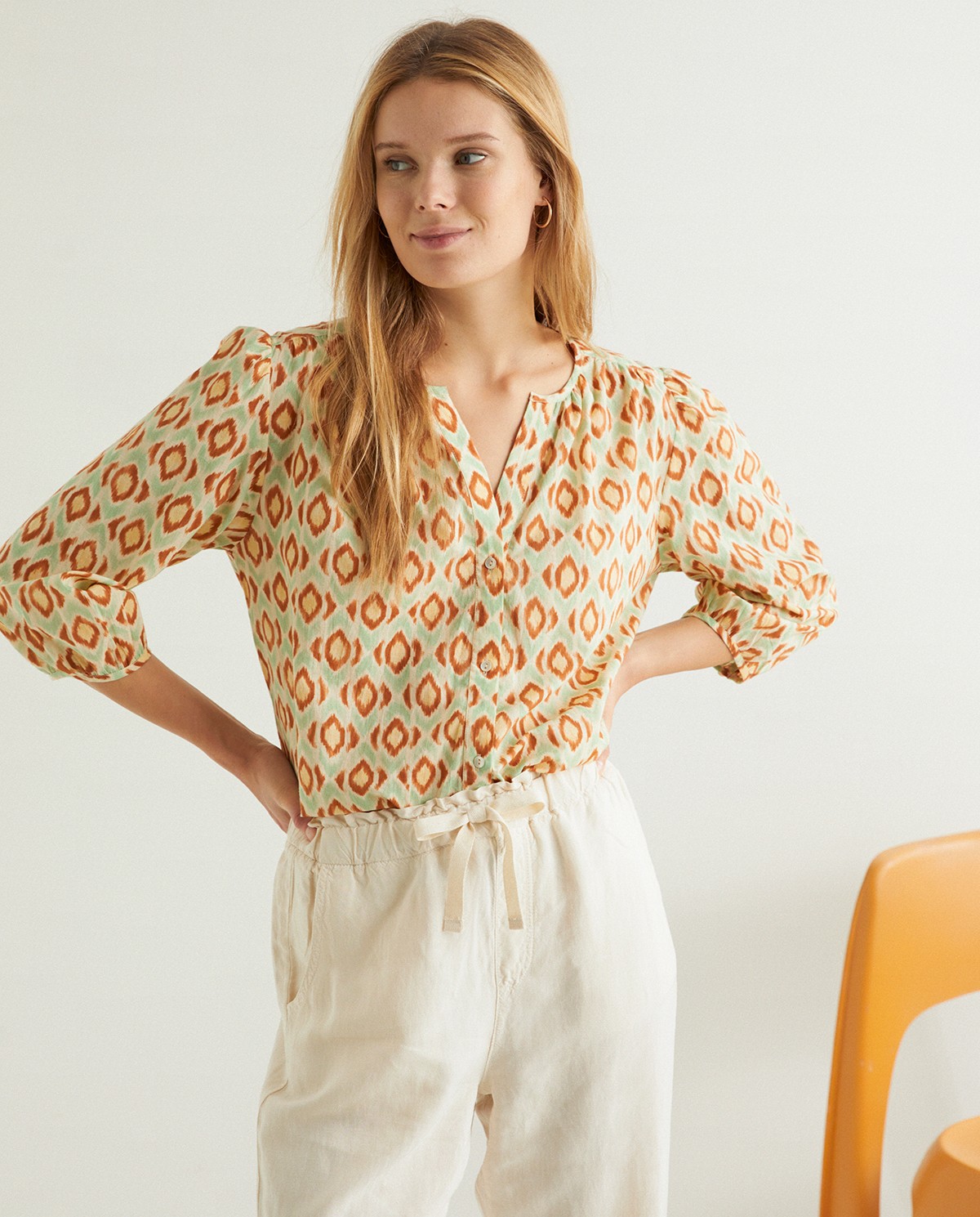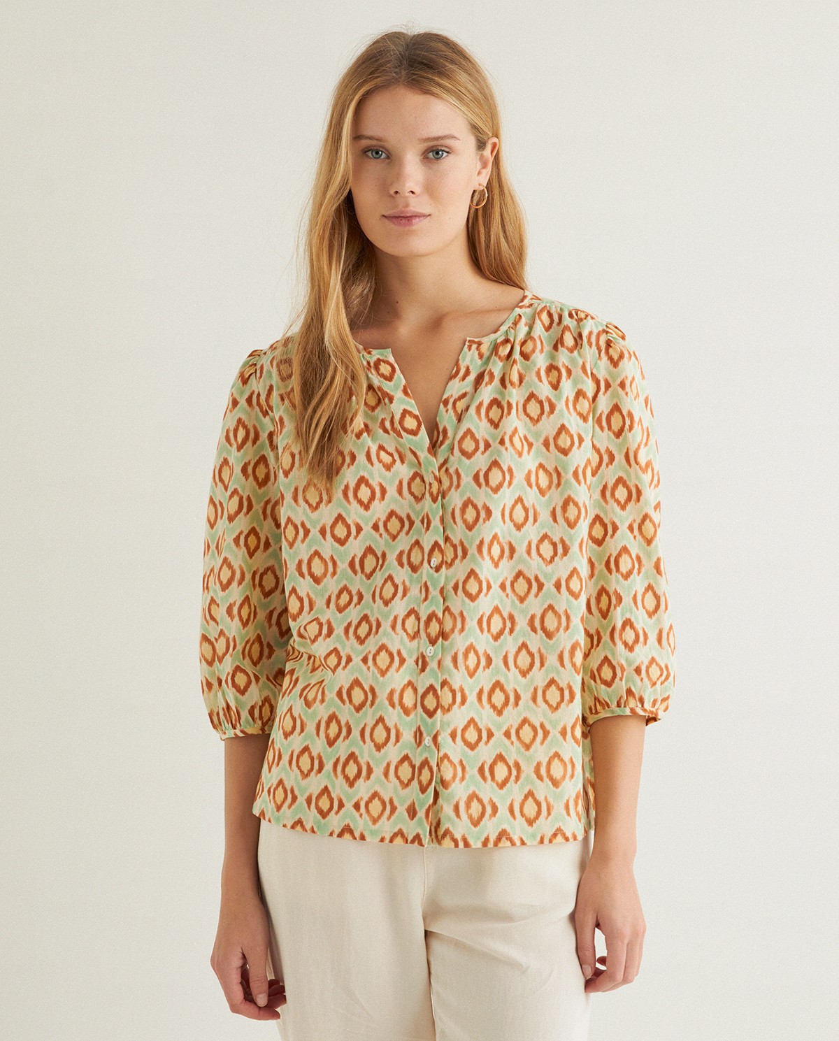 Camisa de manga abullonada tres cuartos y escote pico. Estampado geométrico. Corte recto.