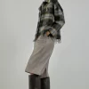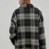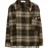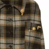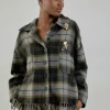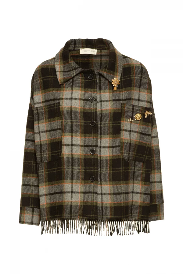 Camisa de cuadros, manga larga, cuello, cierre de botones, bolsillos, flecos, broches desmontables, corte regular, textura lana