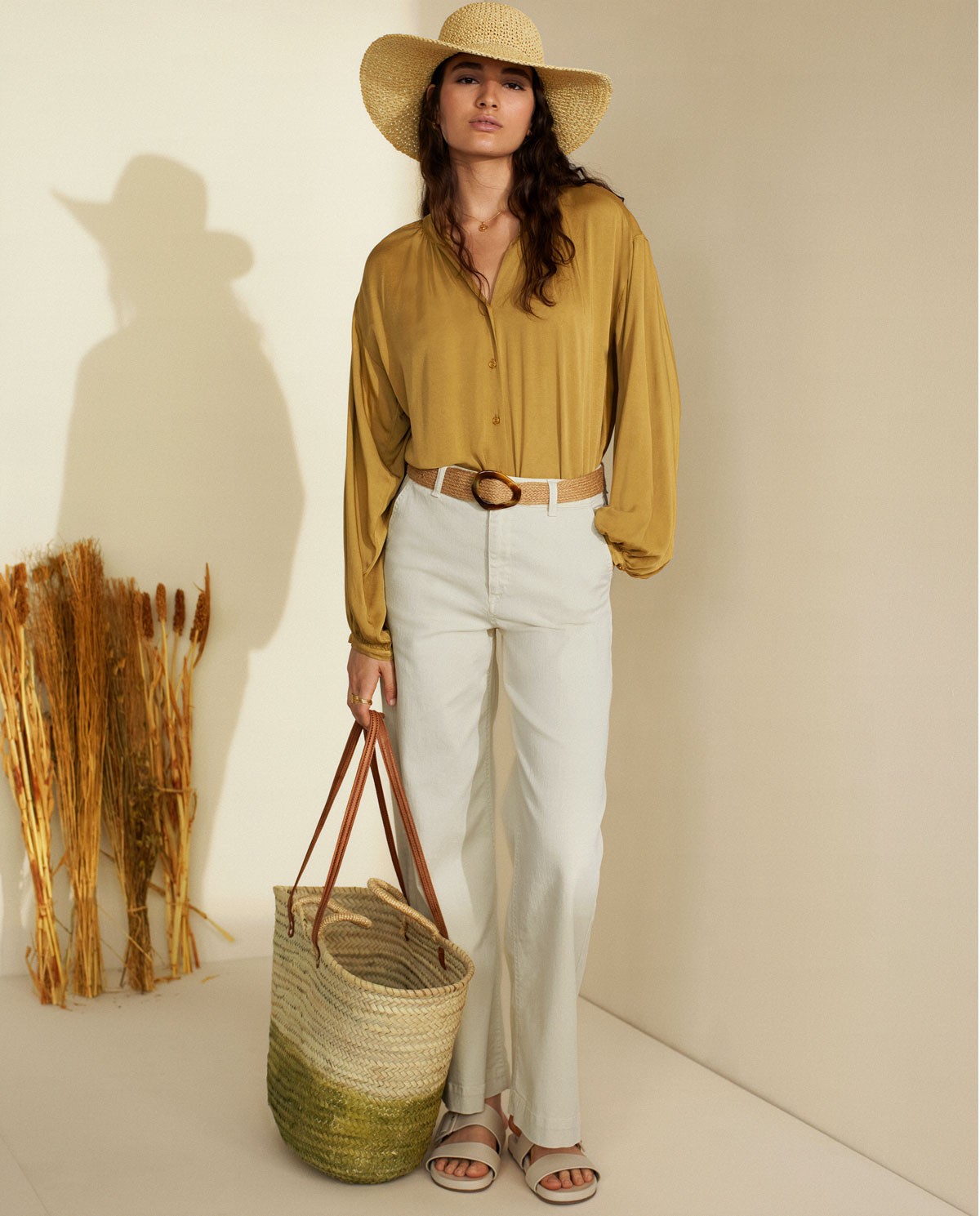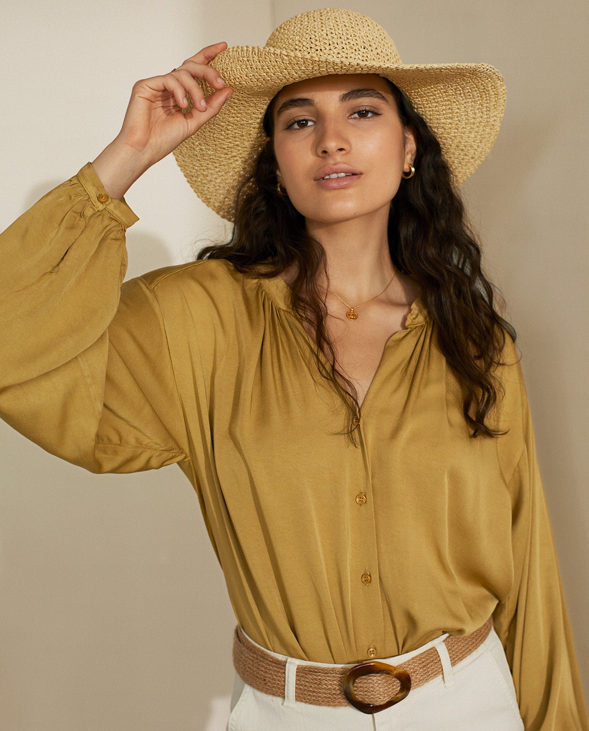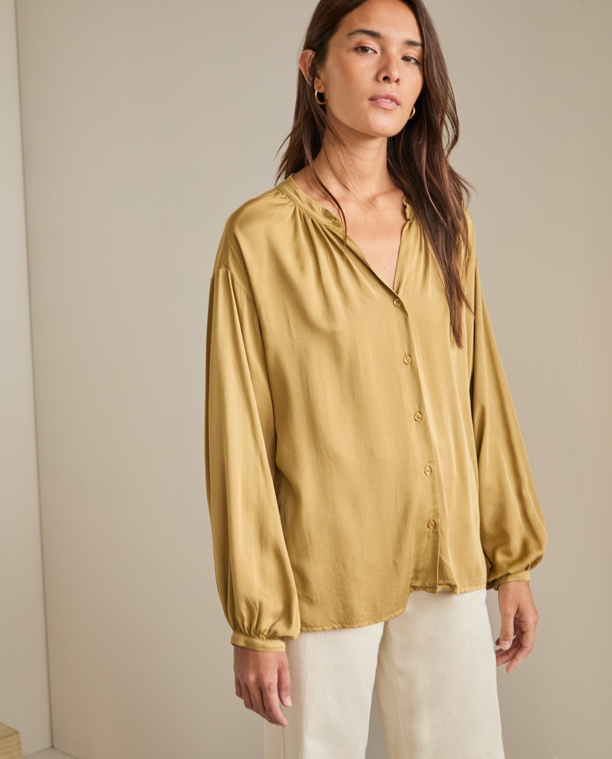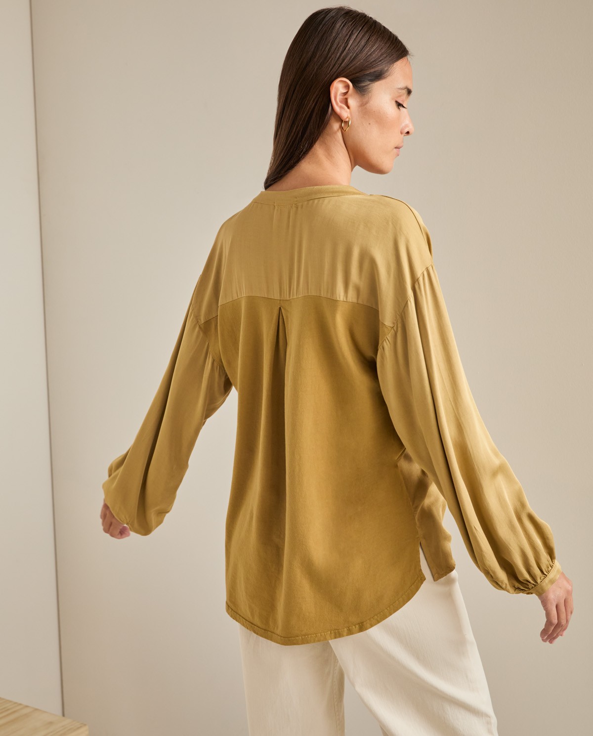 Camisa fluida bimateria con manga fruncidas, cuello en V y cierre con botones. Acabado satinado. 100% viscosa delante, 100% algodón detrás.
