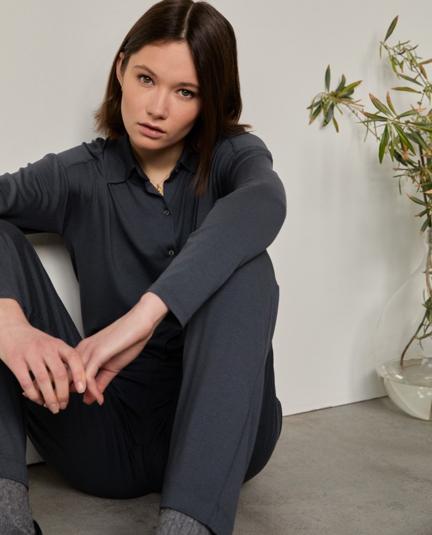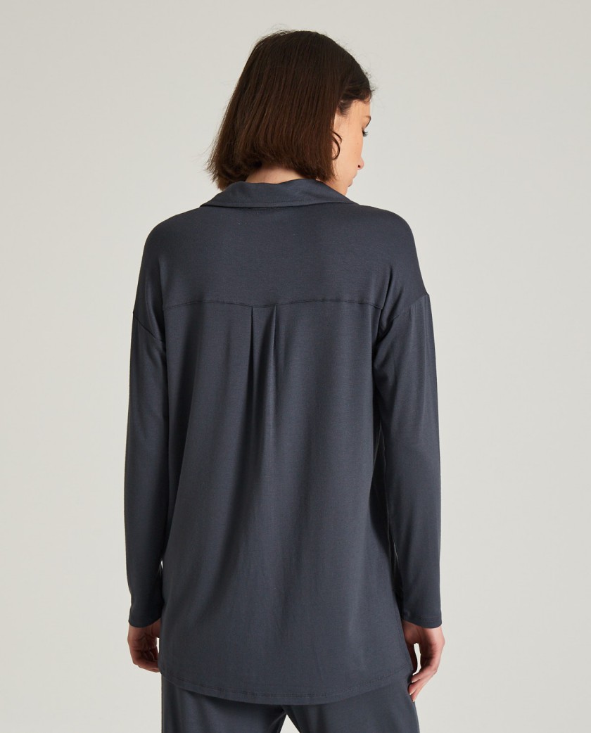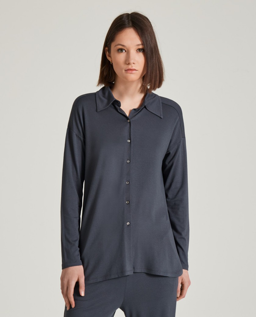 Camisa de manga larga y cuello solapa con estética retro. Cierre delantero con botonadura y tejido en crepe de viscosa de punto. Corte recto. Diseñada para un fit acomodado a la figura, puede elegir su talla habitual.