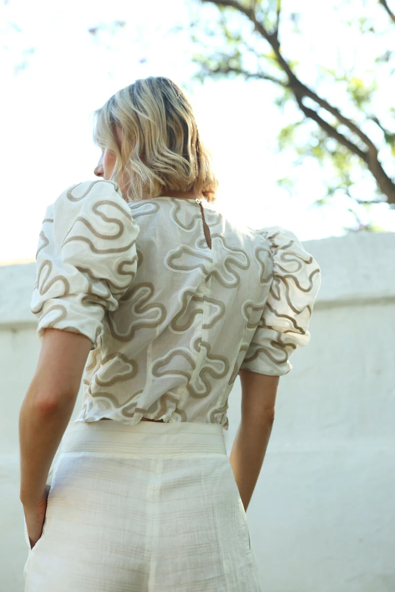 Una camisa con mangas abullonadas que añaden volumen y sofisticación. Cuenta con un delicado diseño bordado en tonos neutros y detalles de volantes en la parte frontal. Perfecta para combinar con su falda Lamin a juego o con cualquier pantalón para un look más casual.