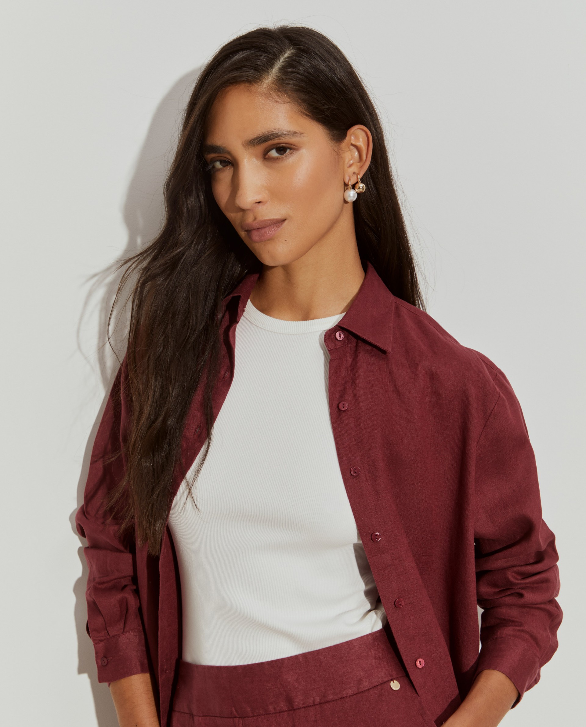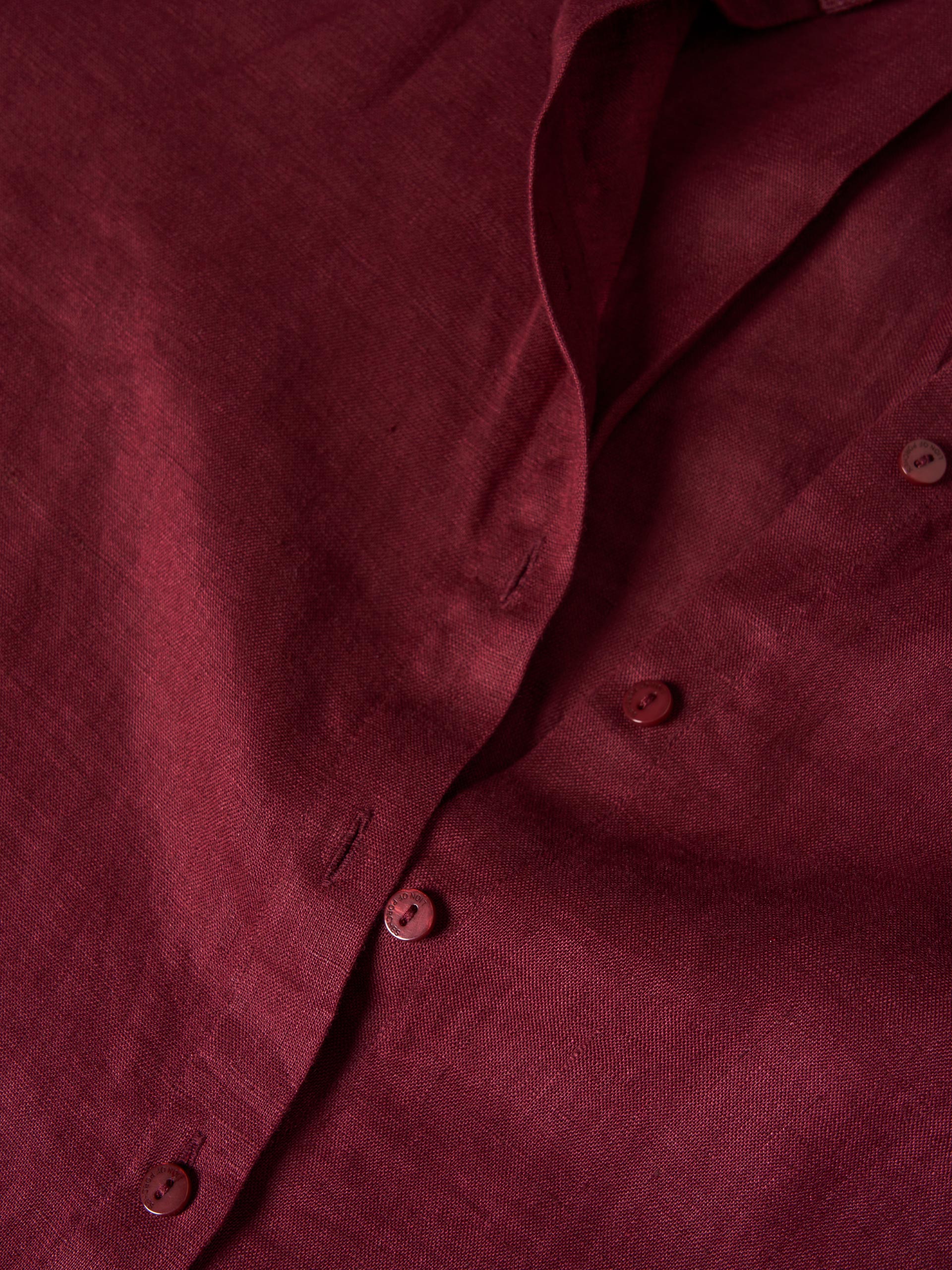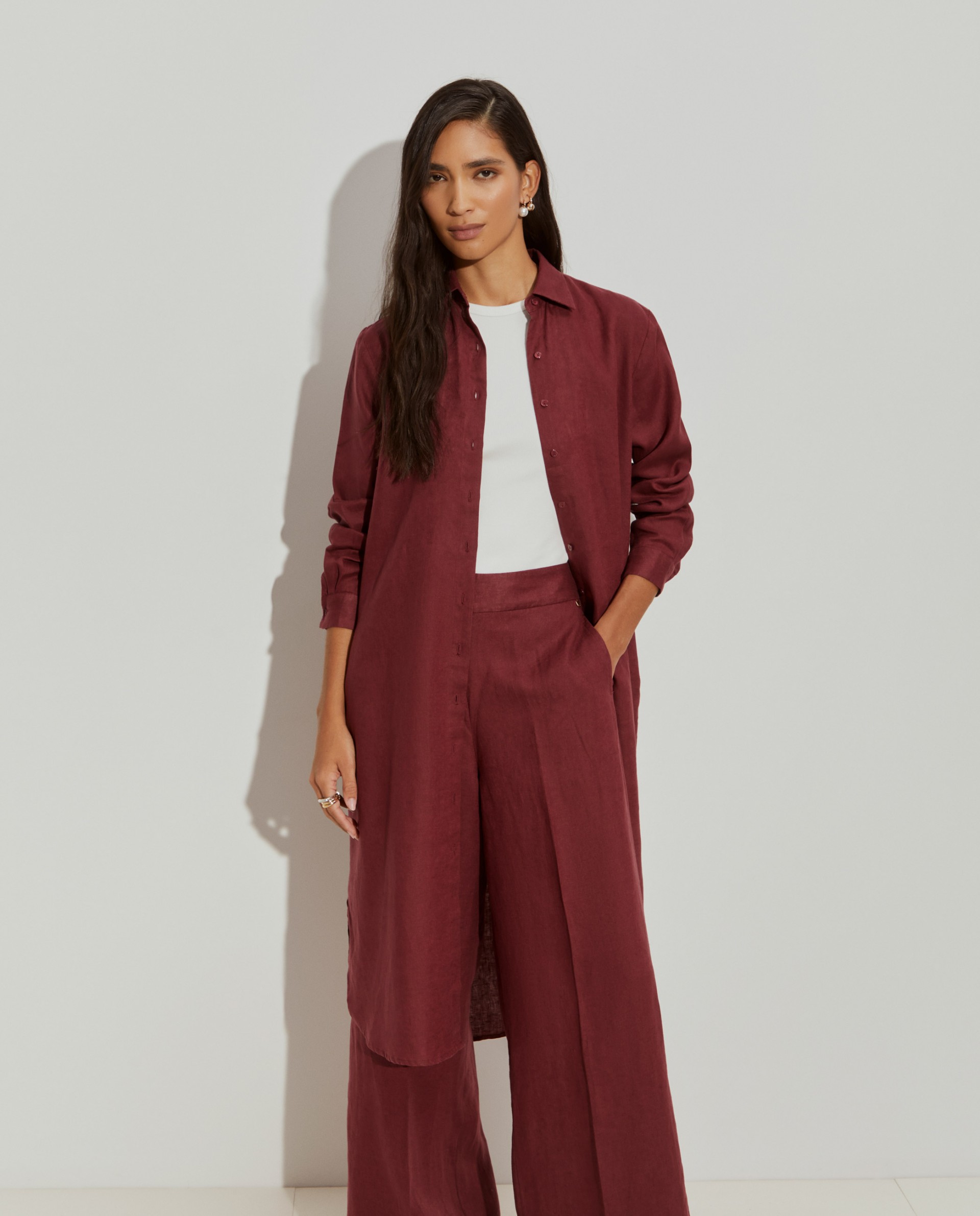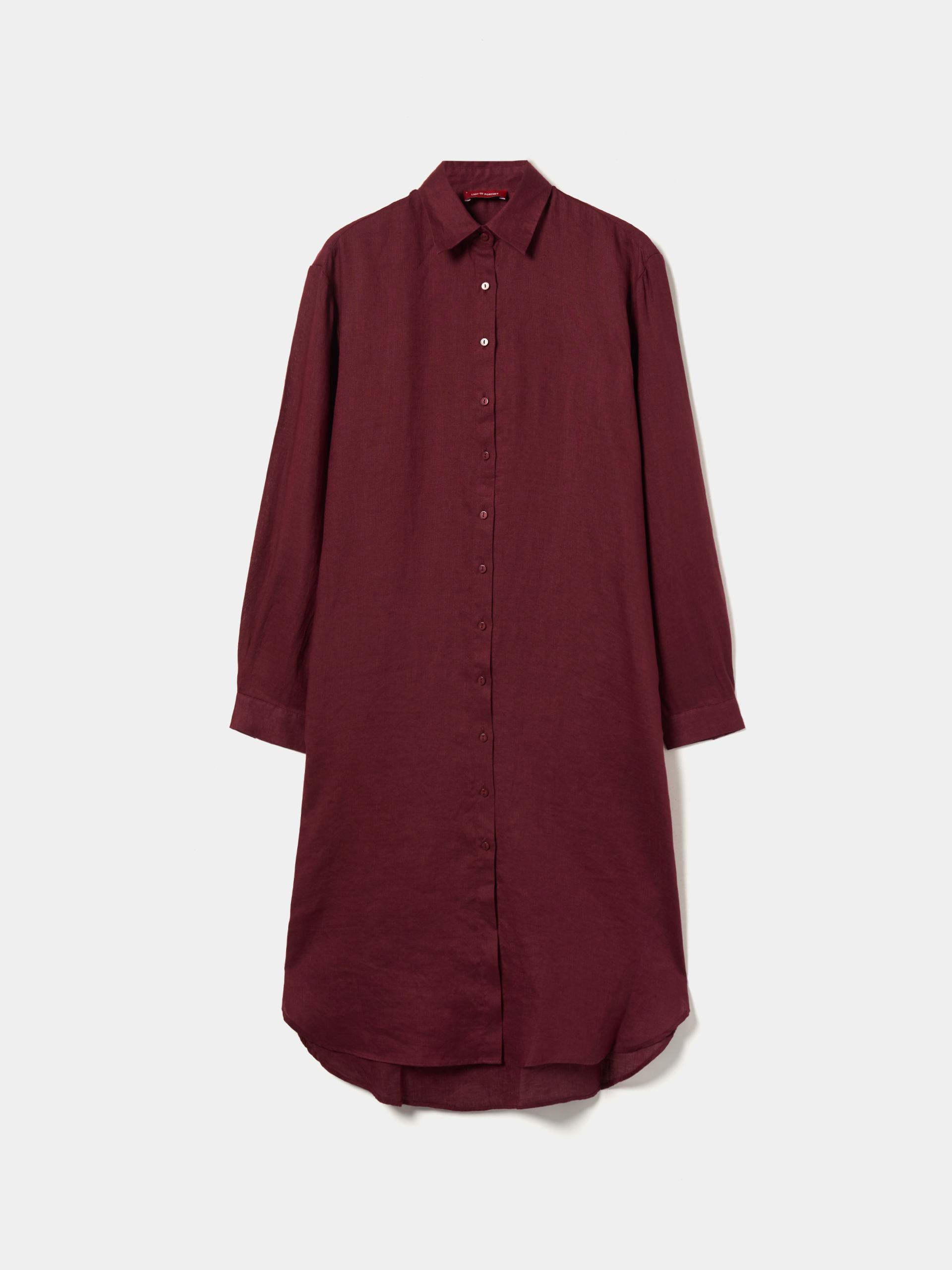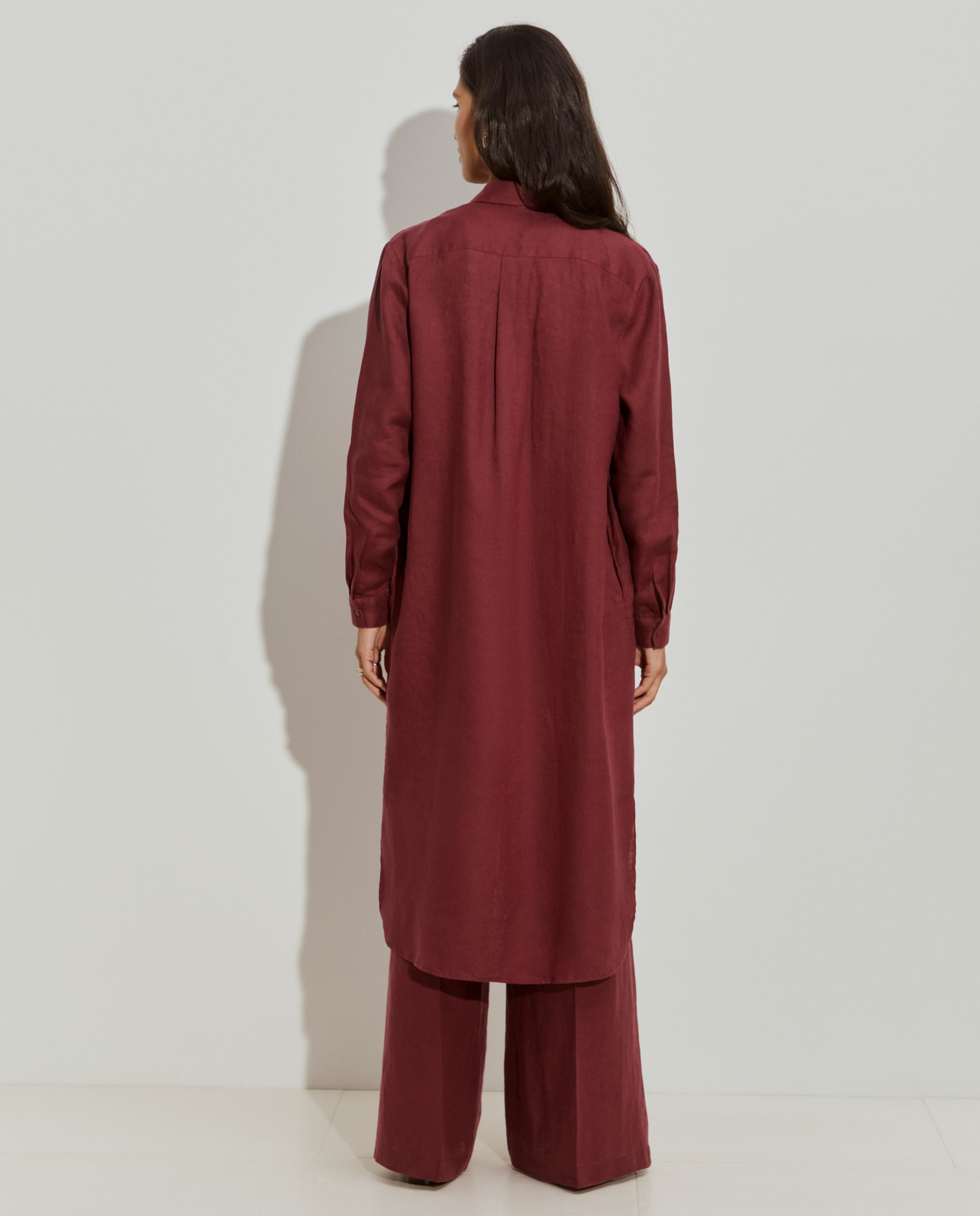 Camisa larga, de base redondeada y manga larga. Con apertura con botón a juego. Está confeccionado íntegramente en lino, un material transpirable, cómodo y duradero, el bálsamo preferido para los días más calurosos.