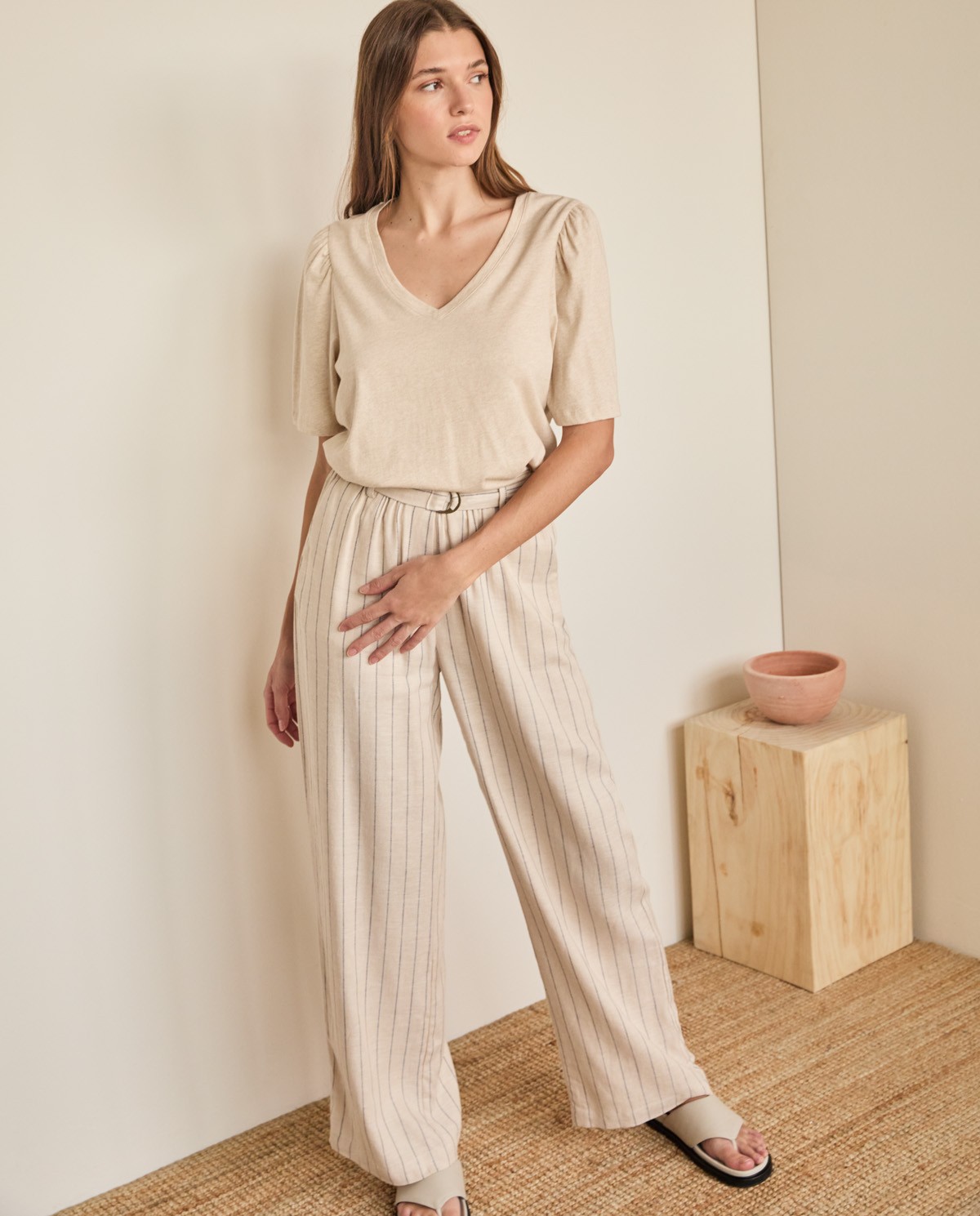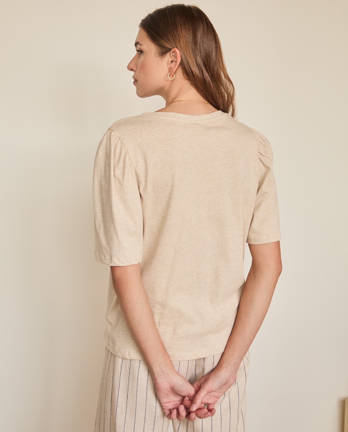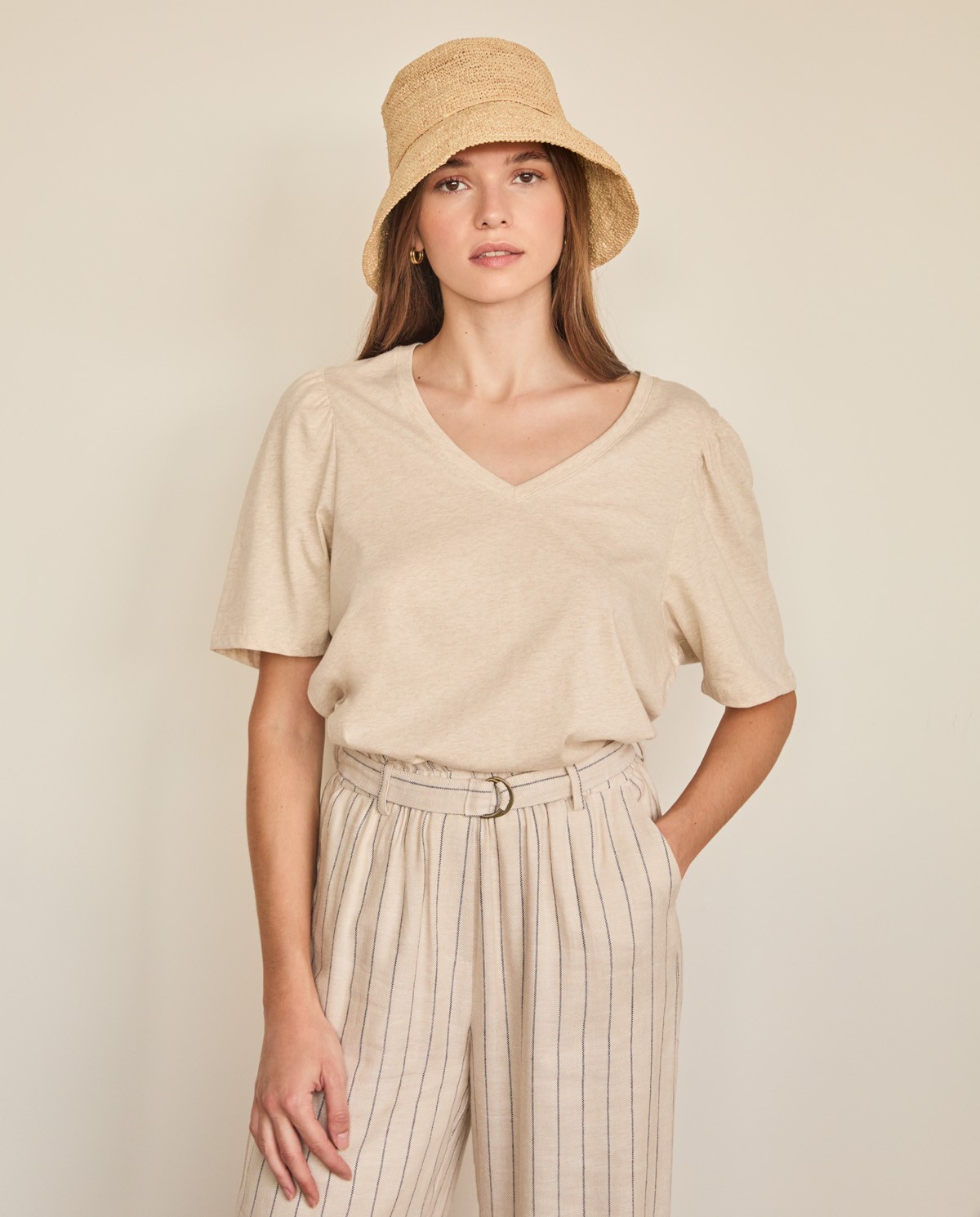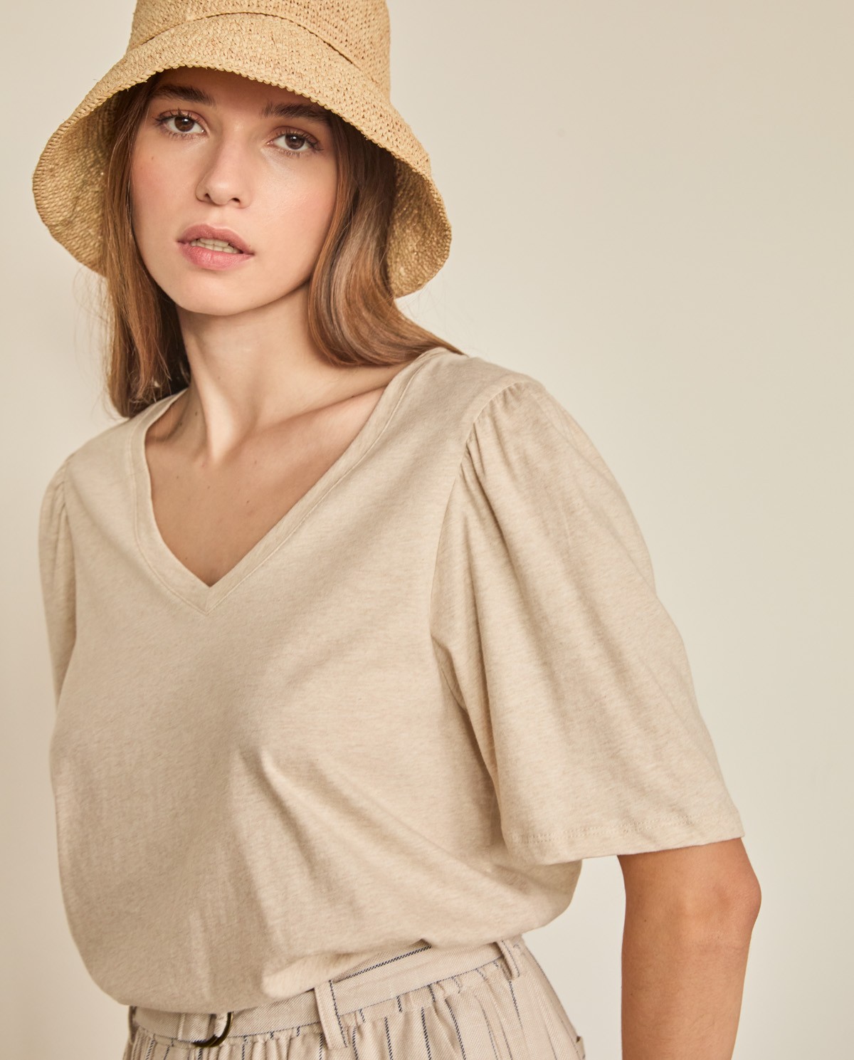 Camiseta de manga corta y cuello pico con detalle fruncido en las mangas. 100% algodón orgánico.