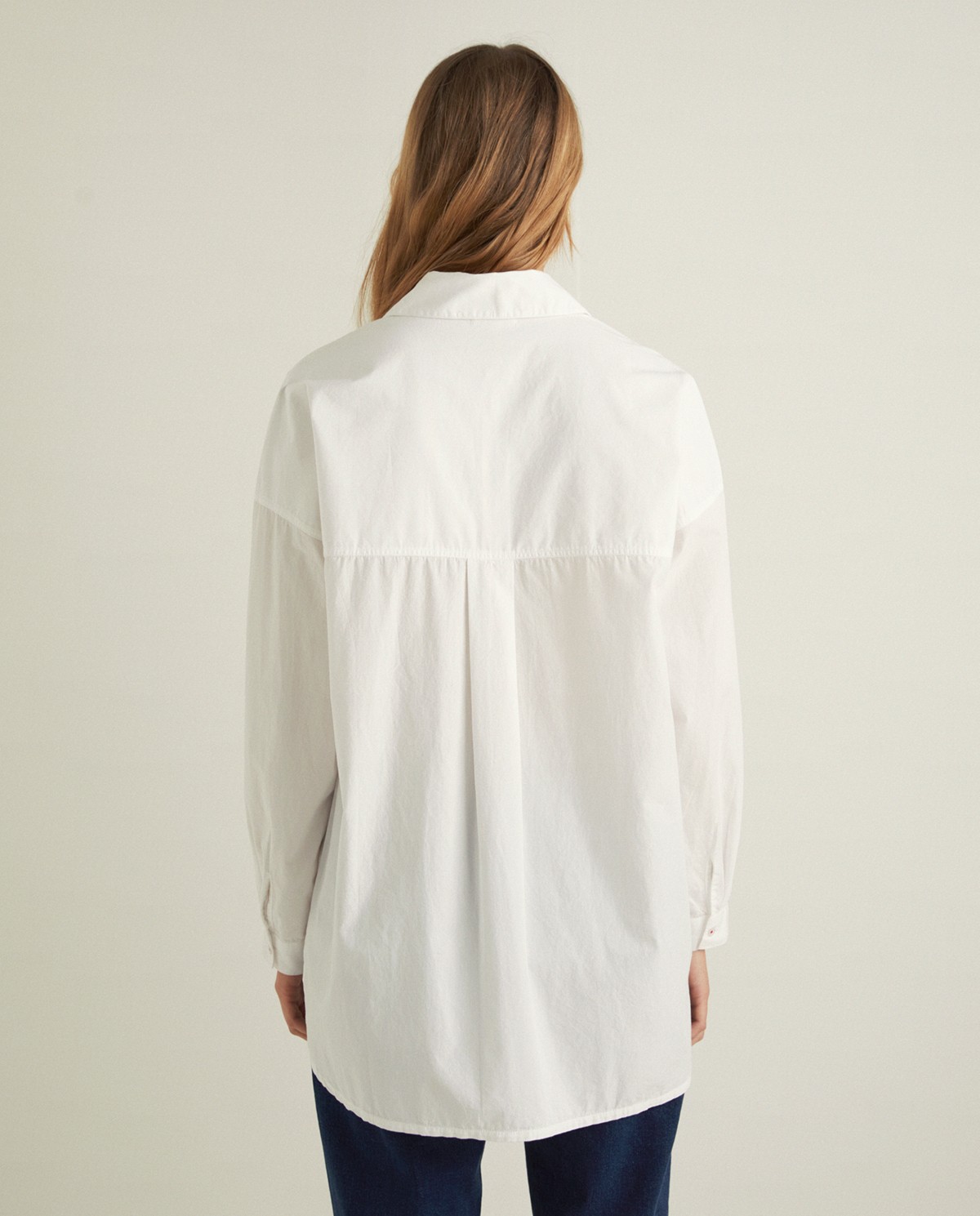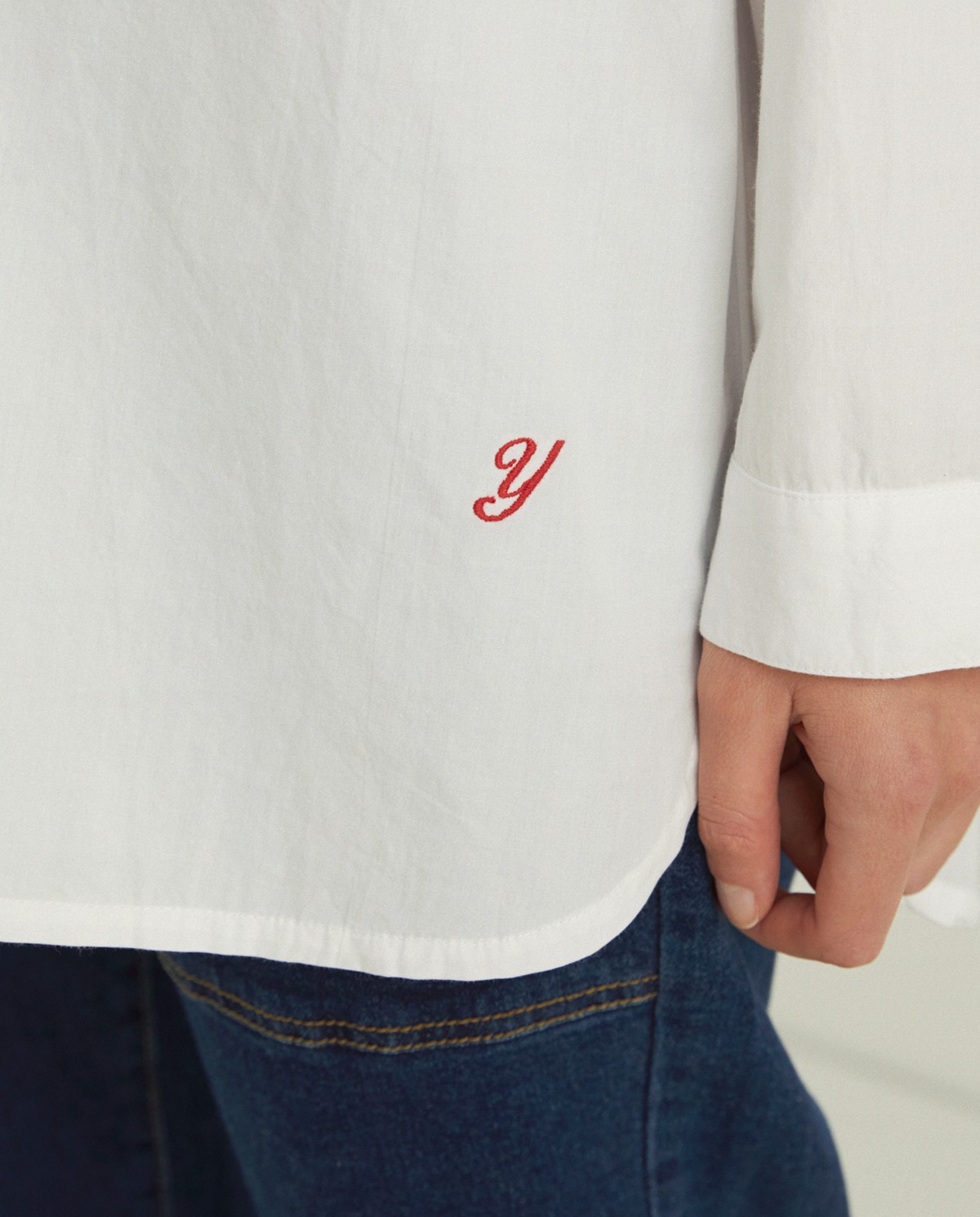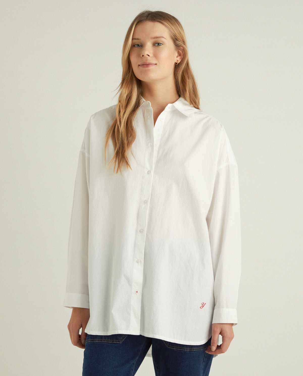 Camisa de manga larga y cuello camisero. Detalle bordado en el bajo. Tejido en algodón. Cierre frontal con botonadura. Corte oversize.