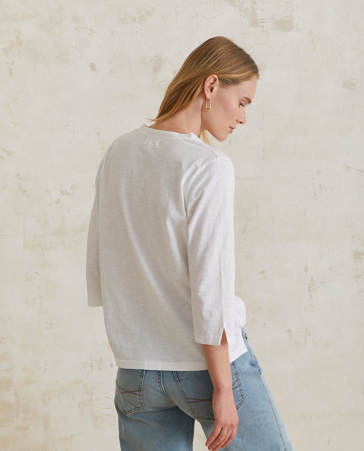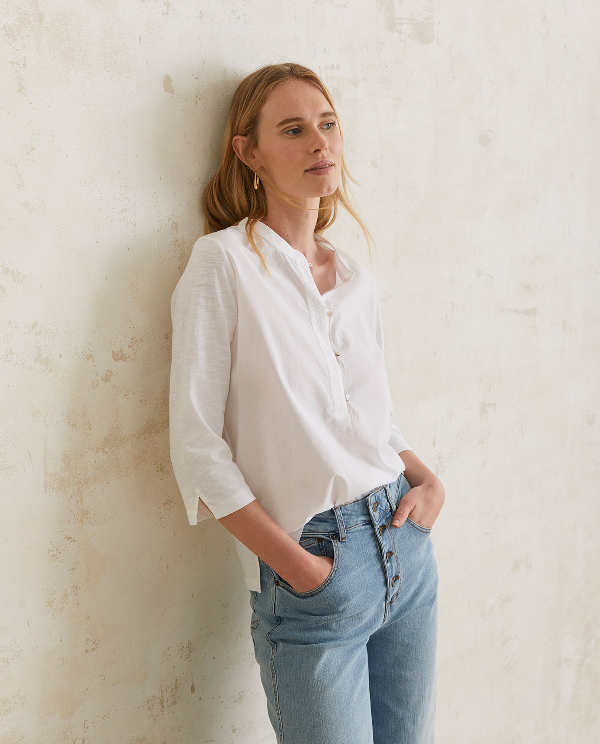 Camiseta 100% algodón orgánico. Escote panadero con botones. Manga francesa. Detalle bordado de punto de cruz en la parte delantera. Aberturas en los laterales y mangas. Fitting recto. Composición: 100% algodón orgánico. Altura modelo 175 cm, talla S.