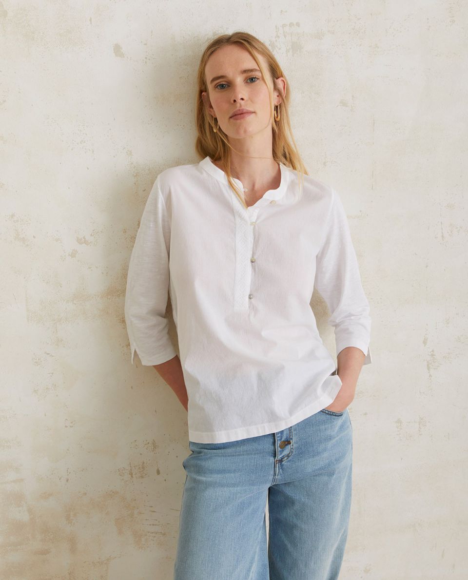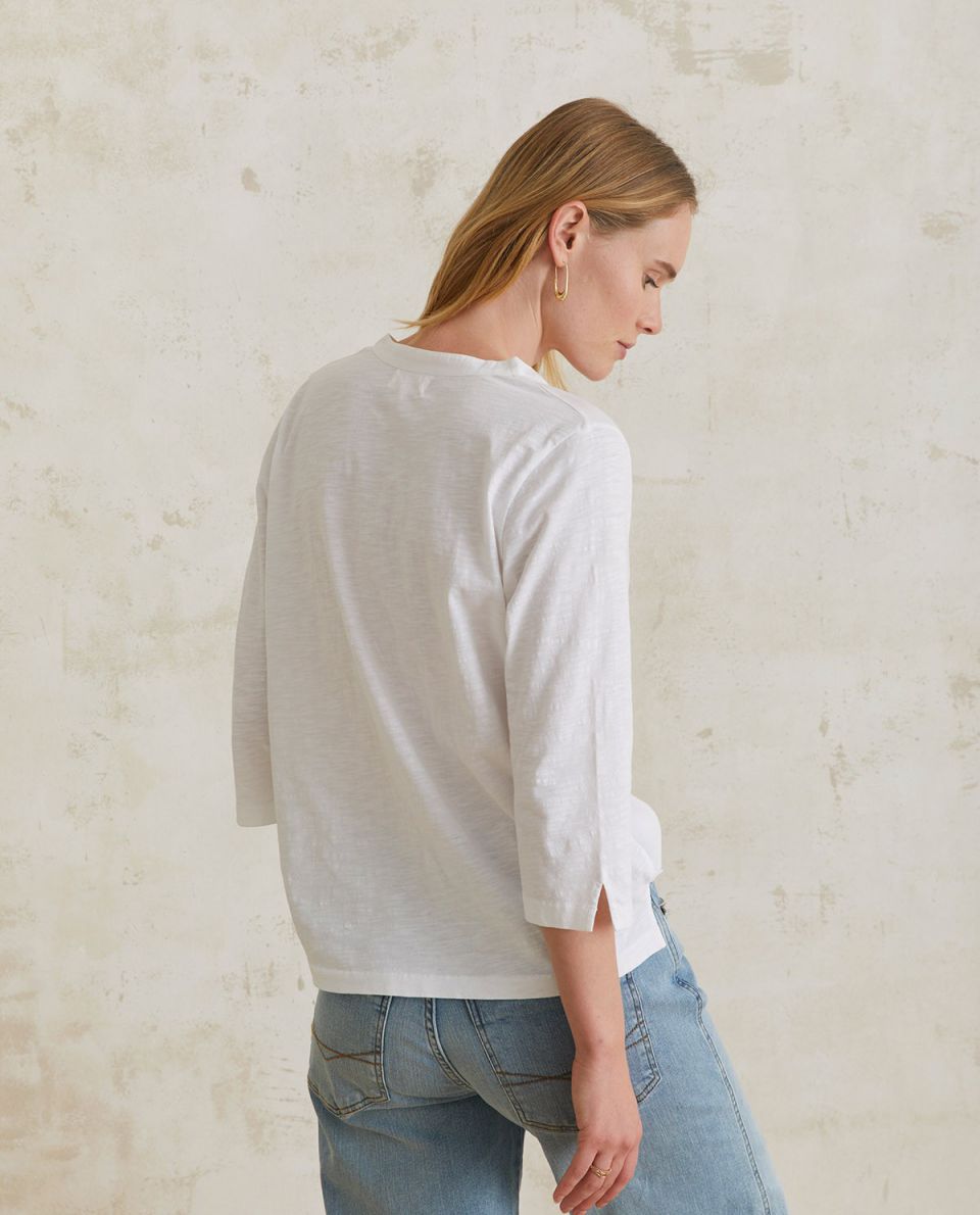 Camiseta 100% algodón orgánico. Escote panadero con botones. Manga francesa. Detalle bordado de punto de cruz en la parte delantera. Aberturas en los laterales y mangas. Fitting recto. Composición: 100% algodón orgánico. Altura modelo 175 cm, talla S.
