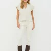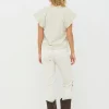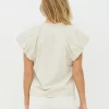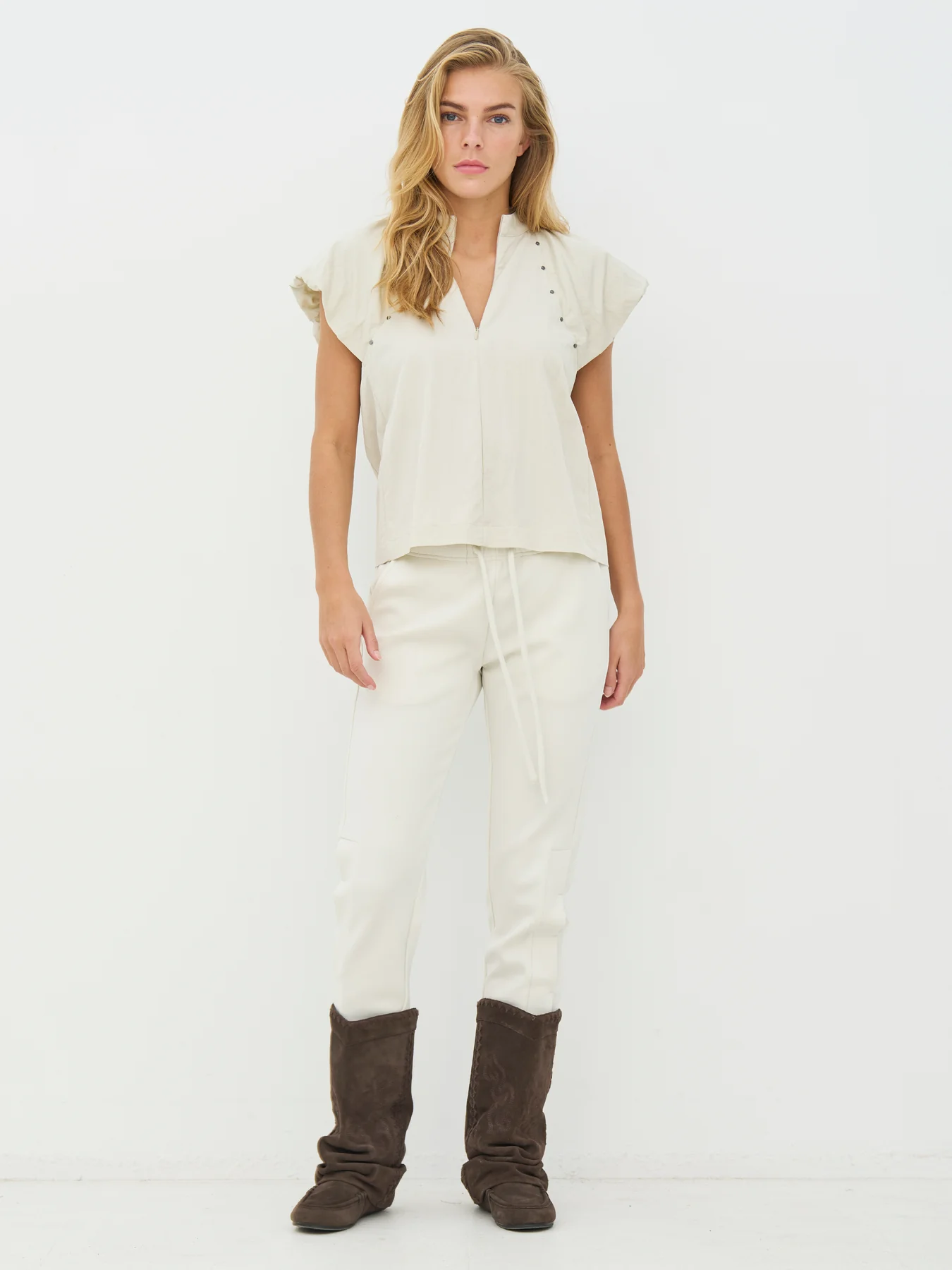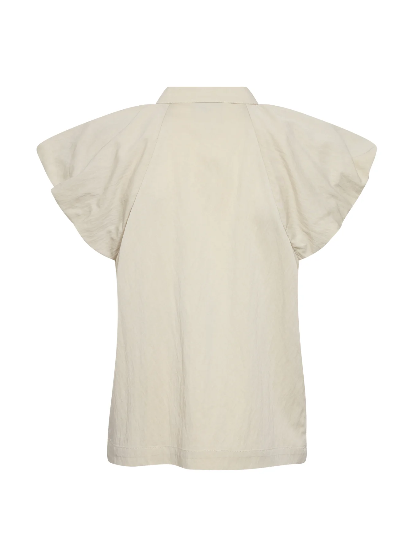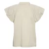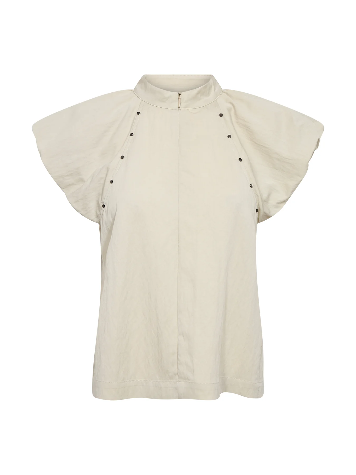 Esta blusa tiene un estilo femenino con un cuello alto y suave y mangas cortas ligeramente acampanadas, que crean una bonita caída sobre los hombros. Los pequeños remaches en las sisas añaden un detalle discreto que rompe con la sencillez del diseño sin resultar recargado. La parte delantera tiene un diseño limpio y sobrio, mientras que la espalda cae de forma suelta y cómoda. La blusa es fácil de combinar con pantalones y faldas, y queda bien tanto en ocasiones informales como más formales.