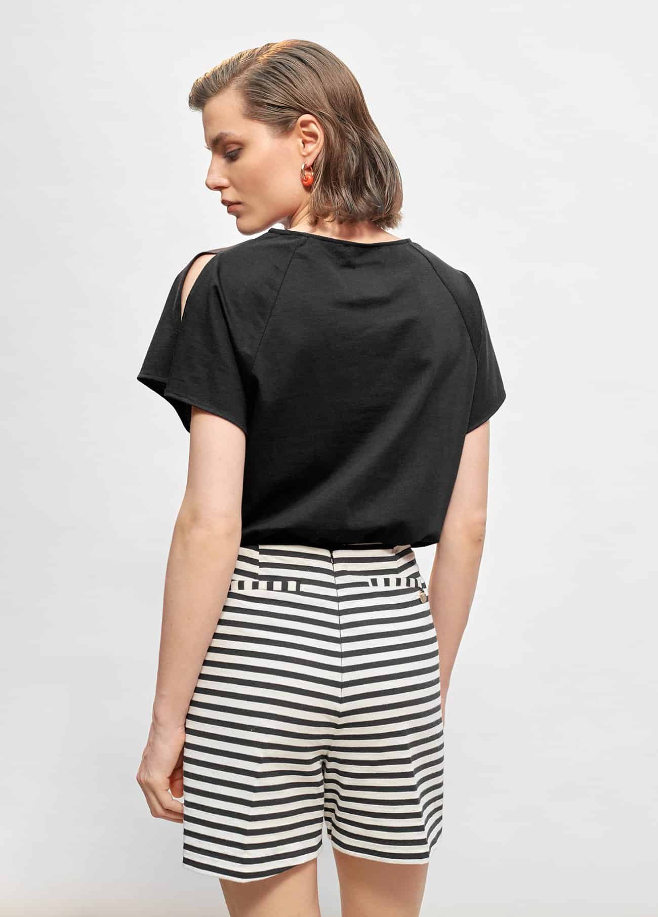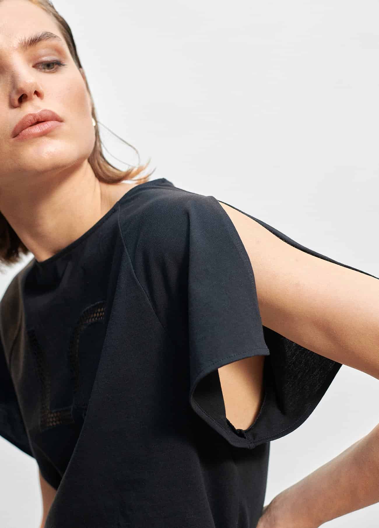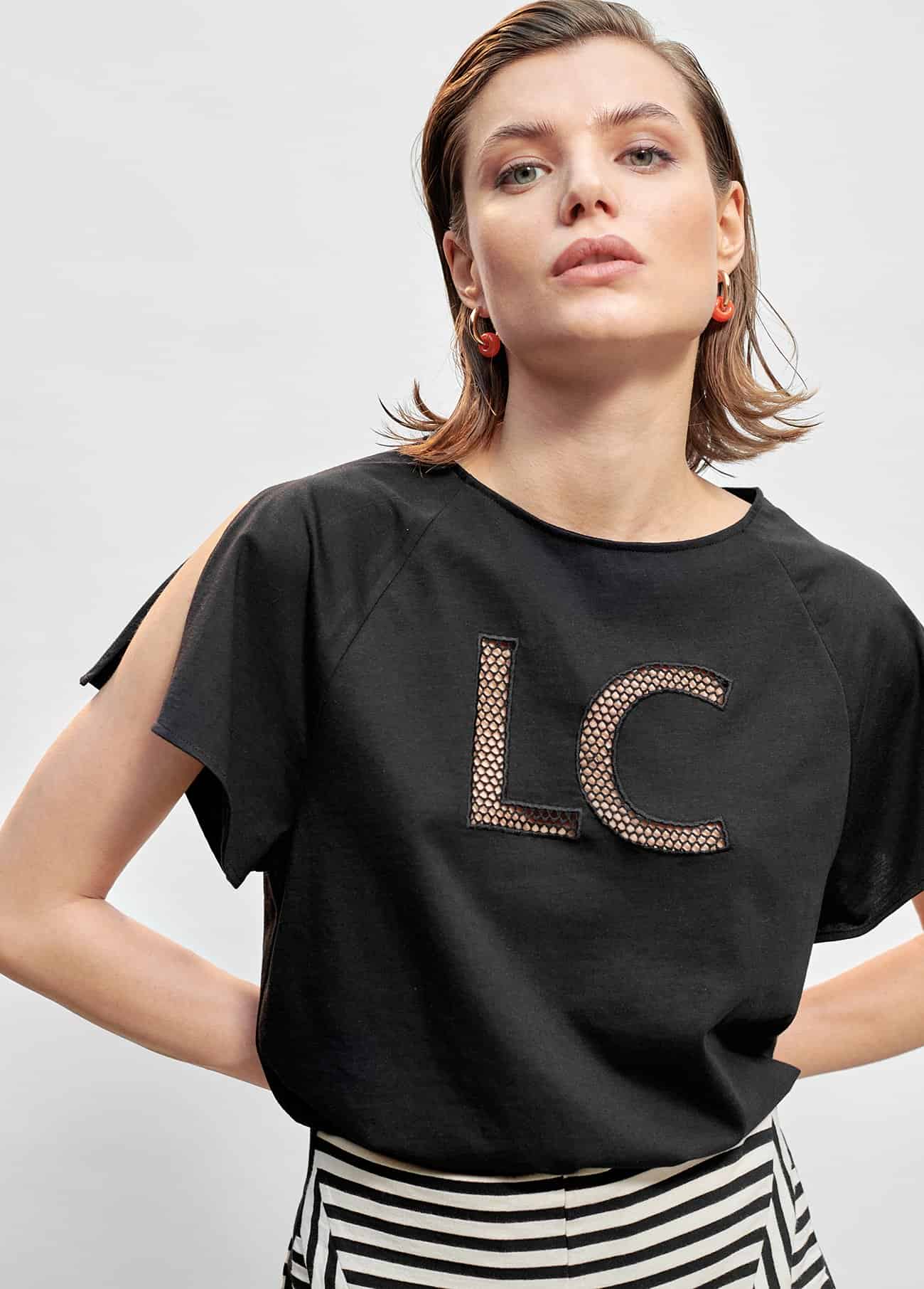 Camiseta con LC calado en frontal. Manga con hombro cortado.