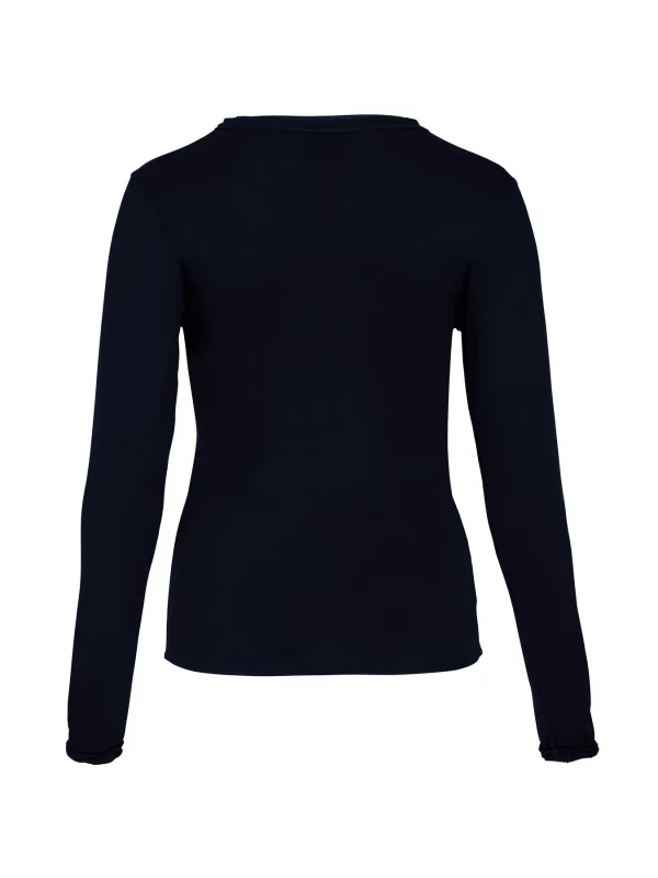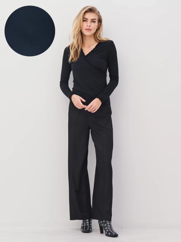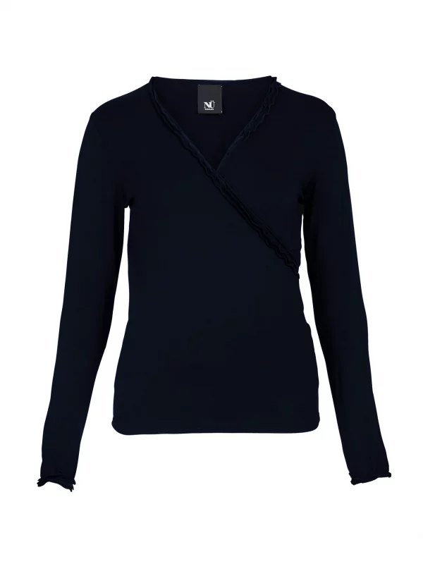 Esta camiseta cruzada de manga larga tiene un corte favorecedor y femenino, con bordes suaves y un delicado acabado ondulado en el escote. Su tejido ligero y elástico proporciona una gran comodidad, mientras que el diseño cruzado en la parte delantera le aporta un toque elegante. Las finas costuras y el borde sin rematar le dan un aire relajado y elegante.