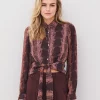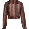 Destaca con esta camisa que combina un llamativo estampado de serpiente con una silueta femenina. Tiene mangas largas con puños y cuello clásico, y un cinturón ancho en la parte delantera, creando una cintura definida con un toque moderno. Su ligereza y corte cropped la hacen perfecta tanto para el día como para la noche.