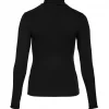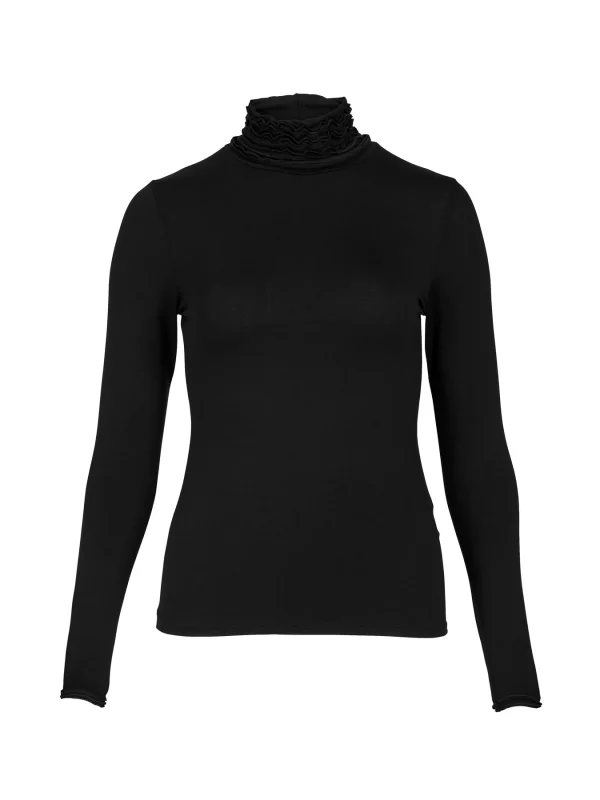 Esta camiseta de manga larga presenta un estilo sencillo y femenino, con un corte ajustado y finos detalles. El cuello alto está adornado con volantes decorativos que le dan un toque romántico. El material es suave y elástico, ofreciendo comodidad y una silueta estilizada. Los puños tienen un sutil borde ondulado que completa el delicado diseño.
