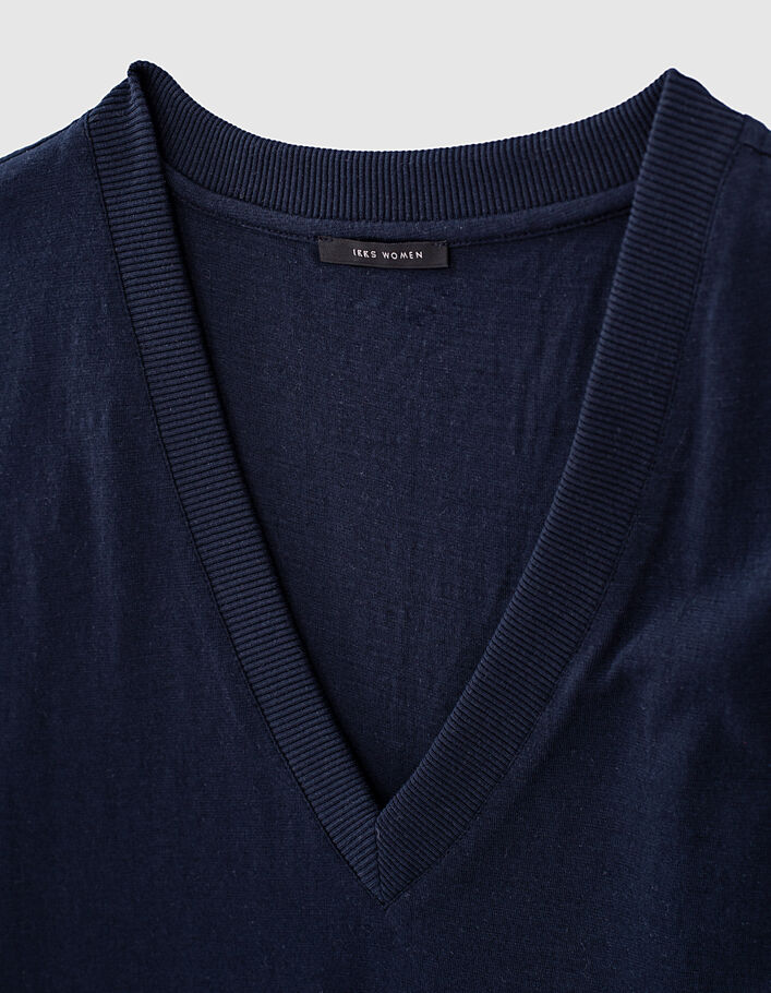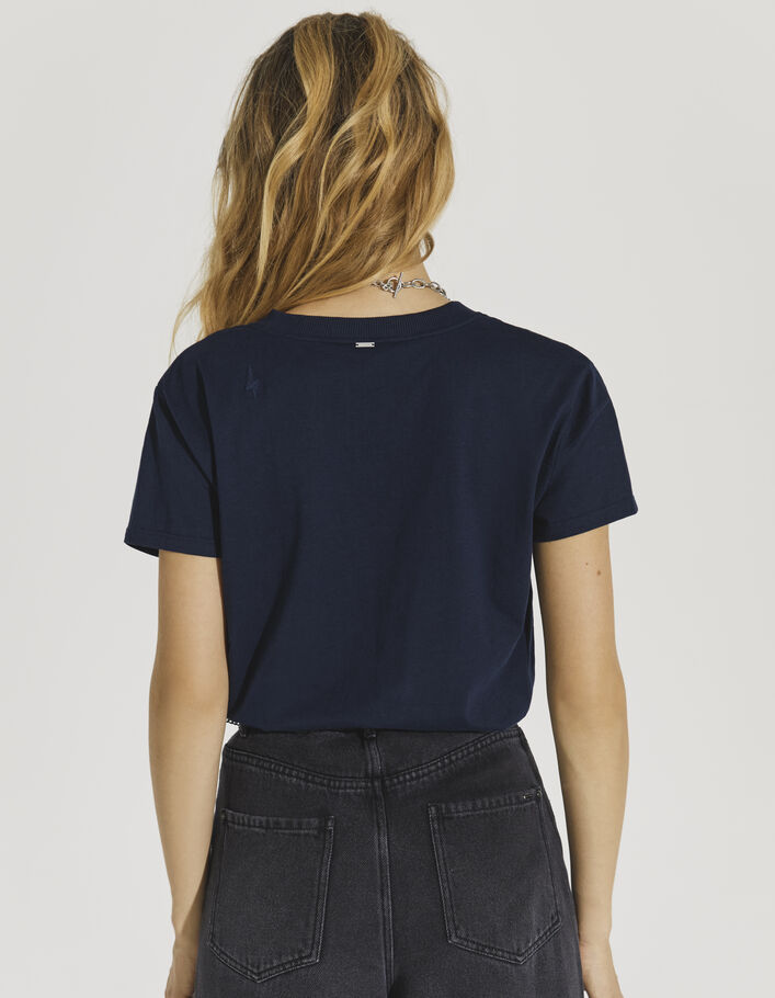 Camiseta de mujer azul marino de algodón con bordado rayo en la manga
