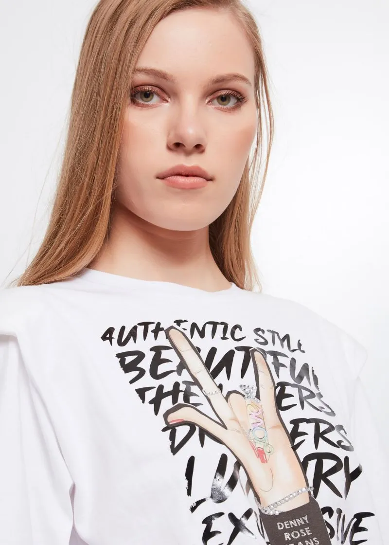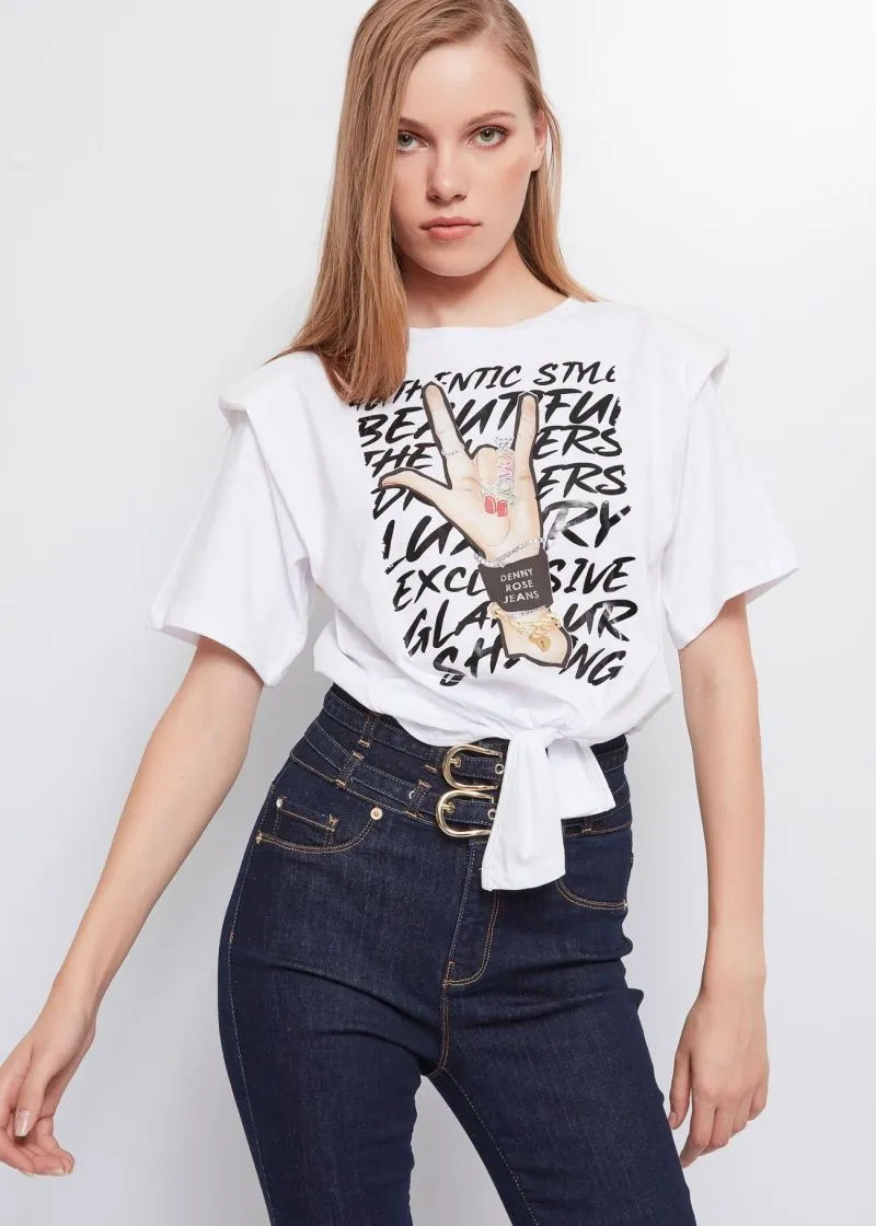 Camiseta de punto de algodón con estampado gráfico acabado con aplicaciones de pedrería en la parte delantera y lazo anudado en el bajo. El modelo tiene escote redondo y manga corta y lleva los tirantes acolchados.