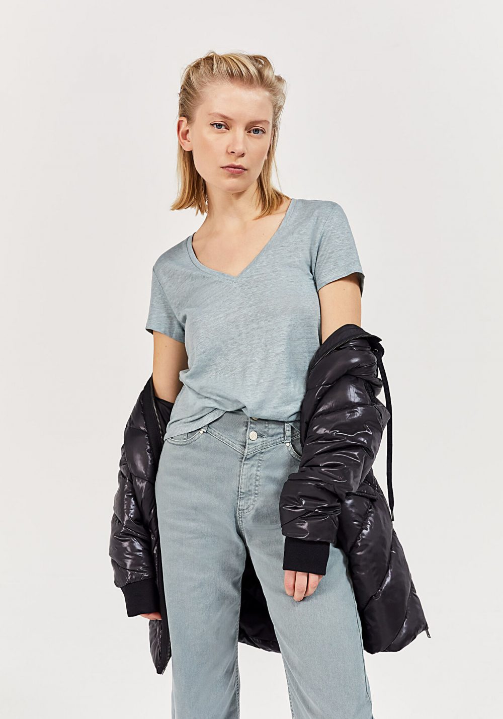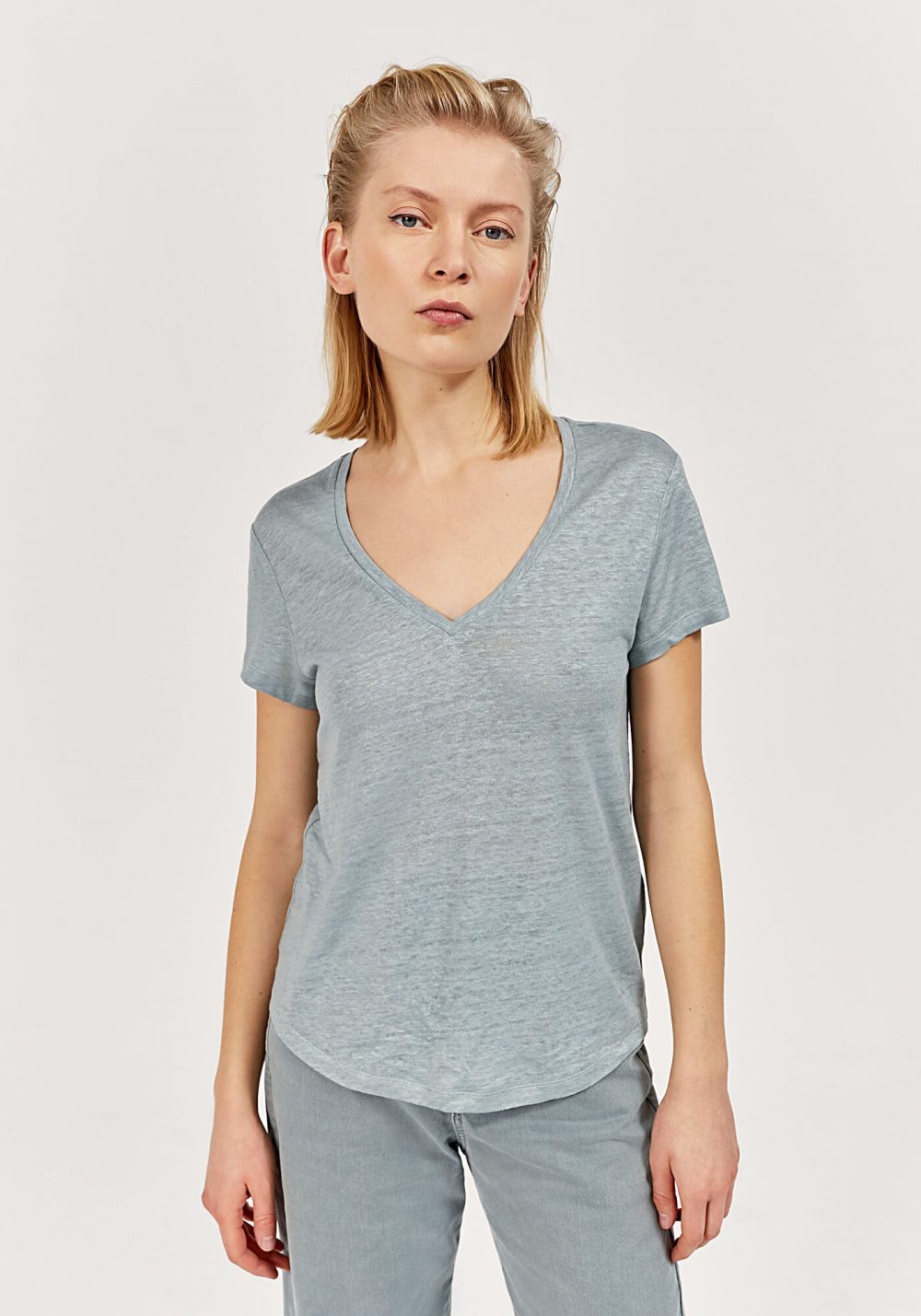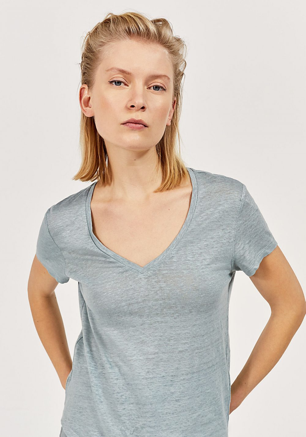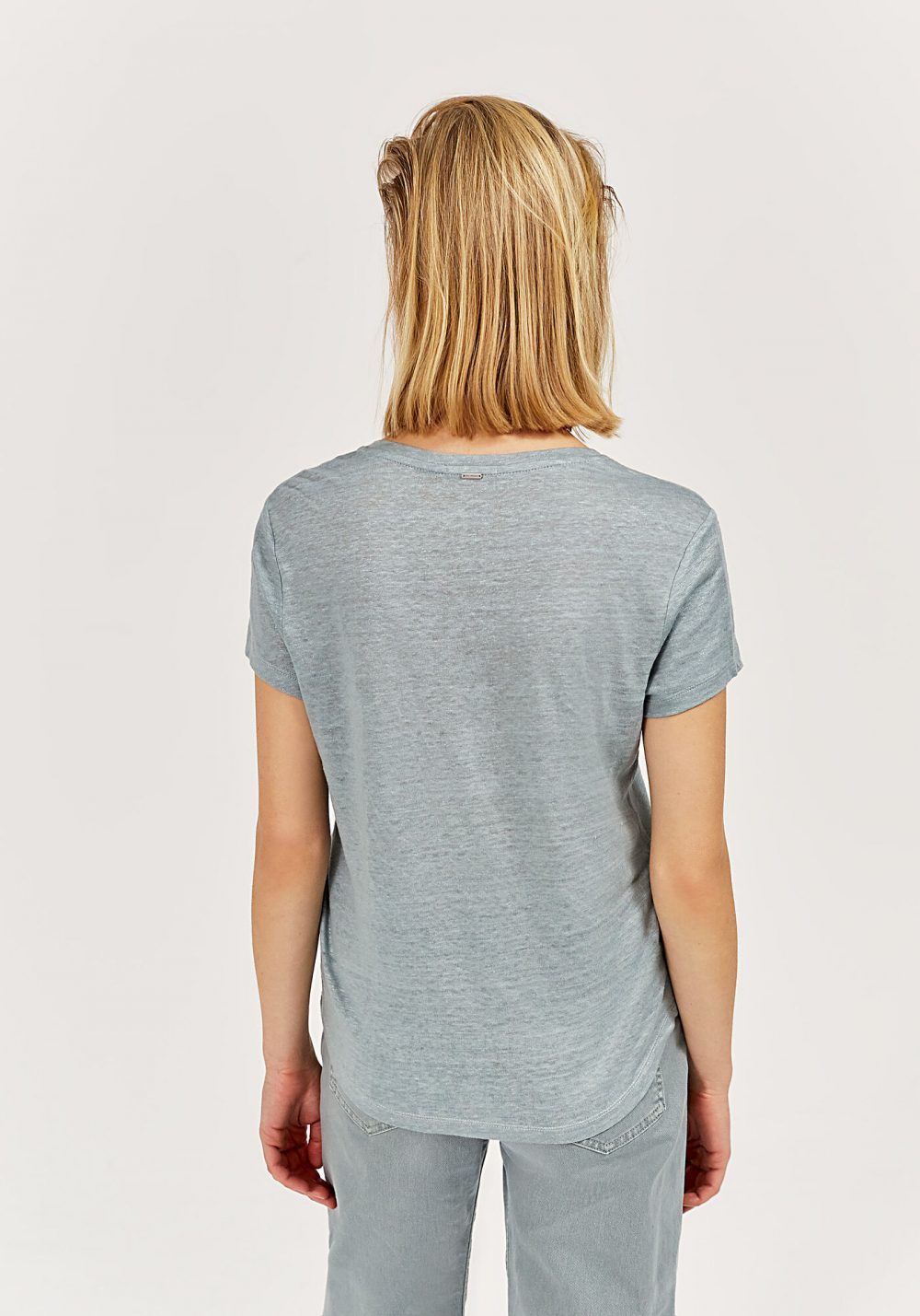 Esta camiseta 100 % lino, ultra femenina, se distingue por su color suave y su tratamiento foil que le da un efecto brillante metalizado.