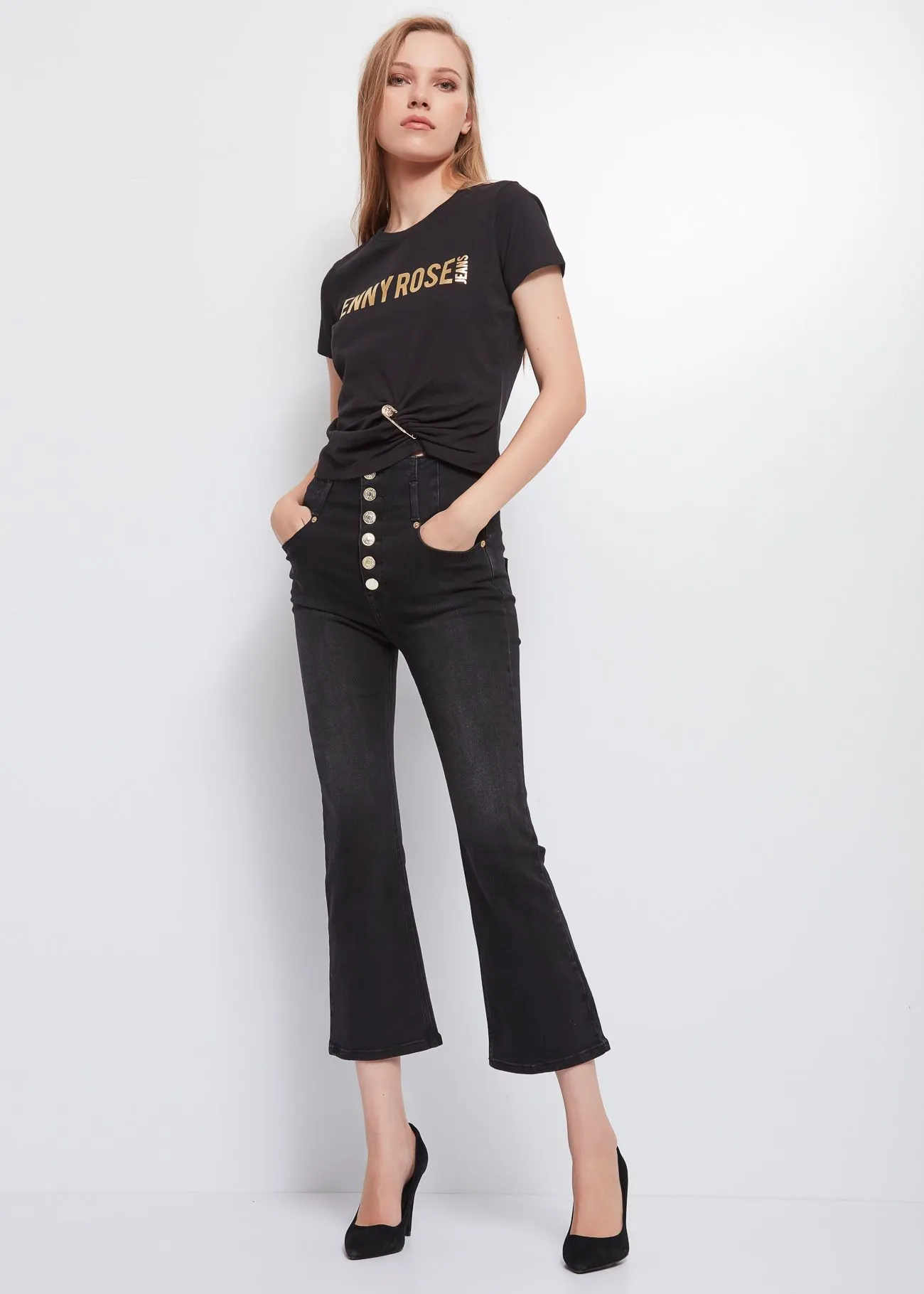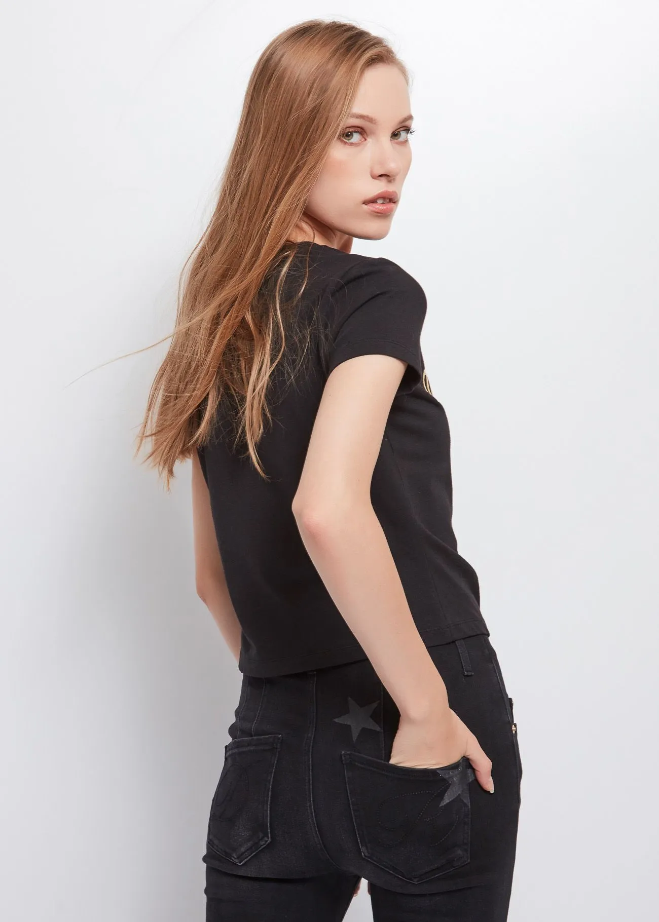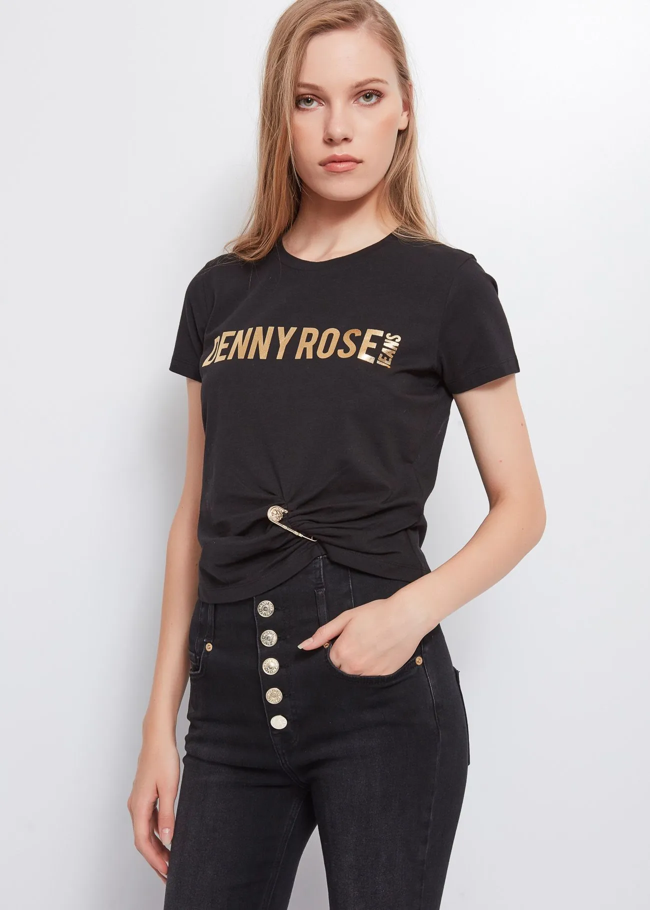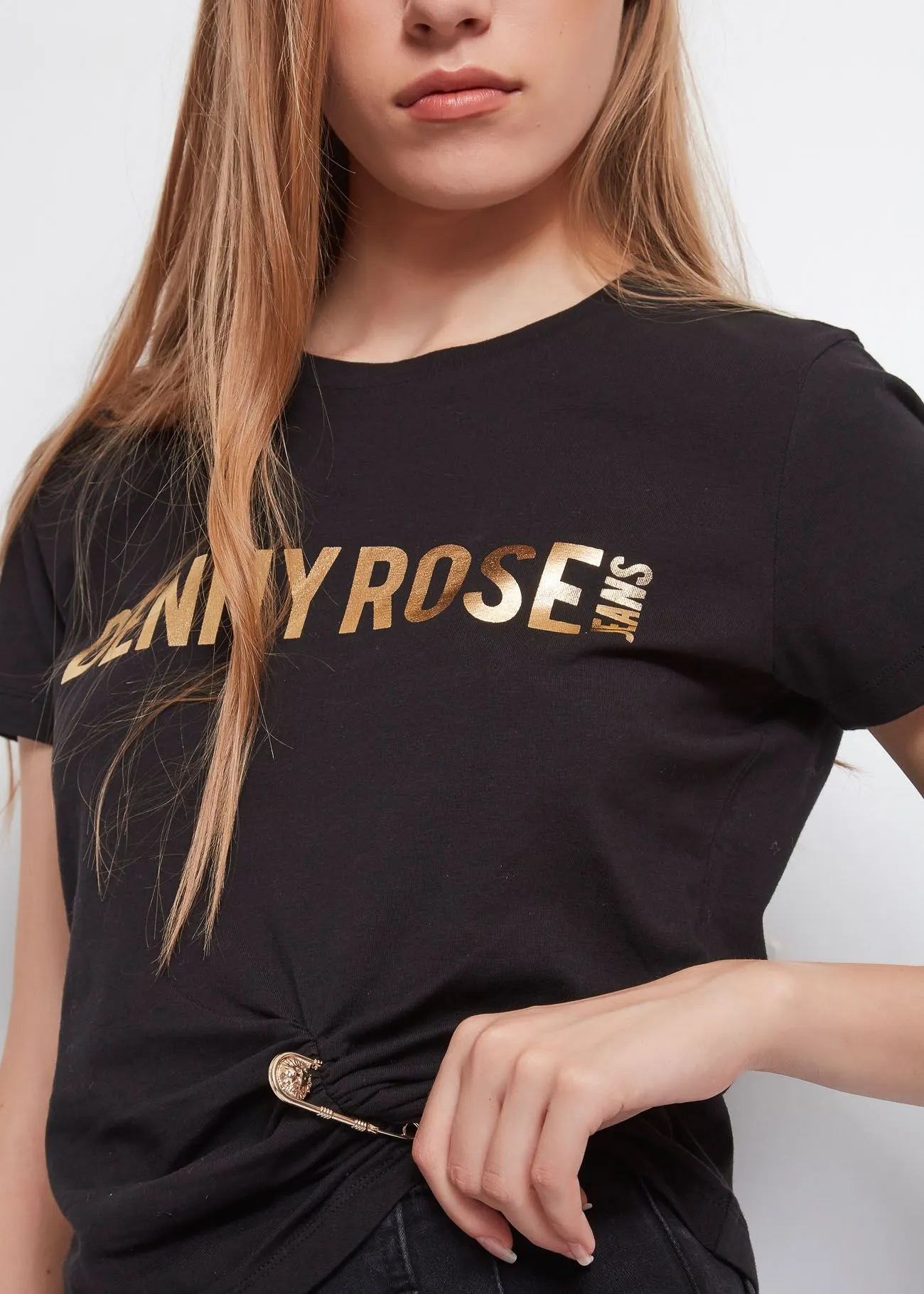 Camiseta recortada en punto de algodón elástico con el logotipo de Denny Rose Jeans estampado en la parte delantera y un imperdible que crea un patrón rizado. El modelo tiene escote redondo y manga corta.