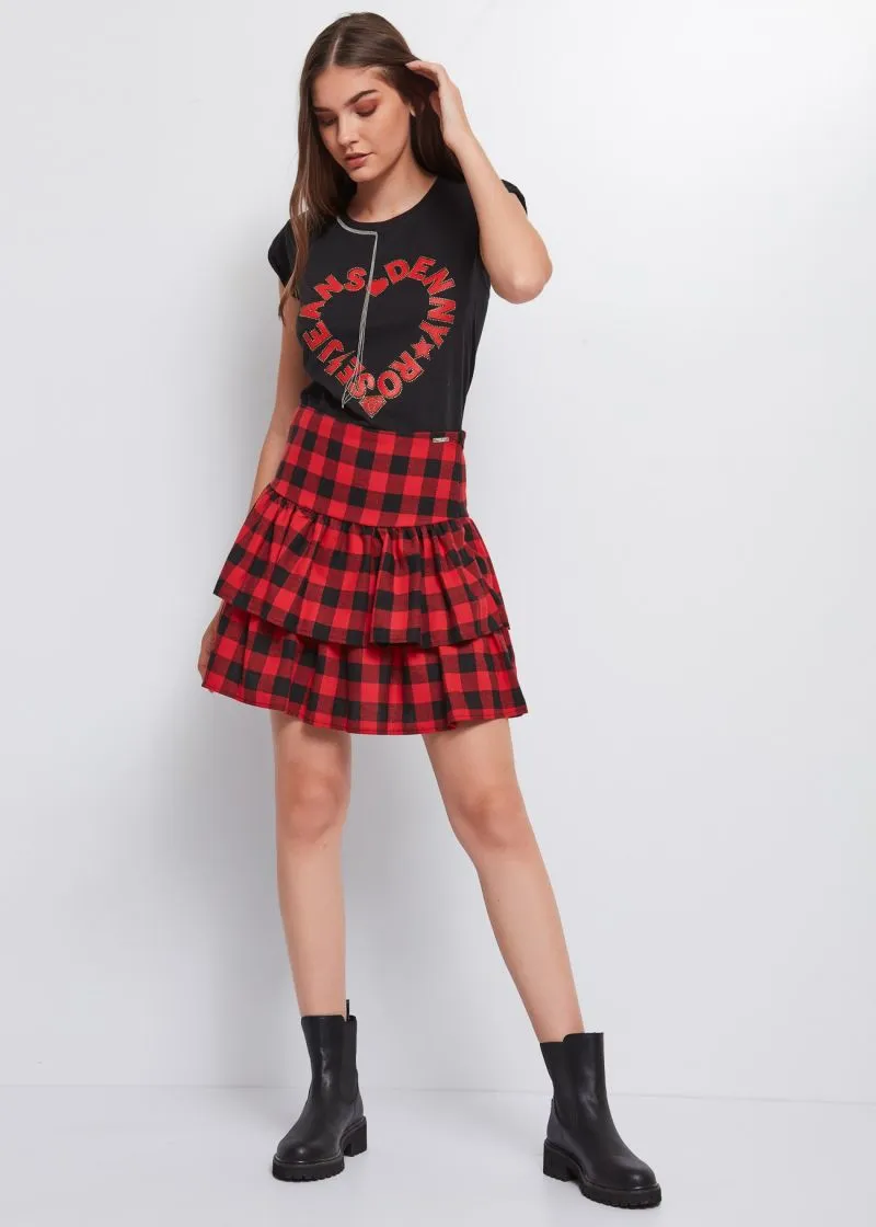 Camiseta de punto de algodón con estampado de letras en la parte delantera cubierta con pedrería de colores. El modelo tiene escote redondo y mangas montadas. Una pequeña cadena colgante comienza desde el cuello