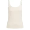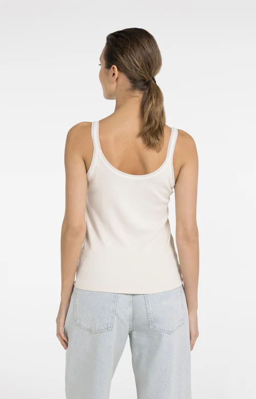 Esta elegante camiseta sin mangas presenta tirantes anchos, escote redondo y una silueta femenina y ajustada. El sutil detalle de malla en el escote y los tirantes le aporta un toque ligero y moderno. Confeccionada en un tejido suave y acanalado que resulta muy cómodo al tacto, esta camiseta es perfecta para llevar sola o debajo de una blusa, cárdigan o blazer. La modelo mide 175 cm y lleva la talla S.