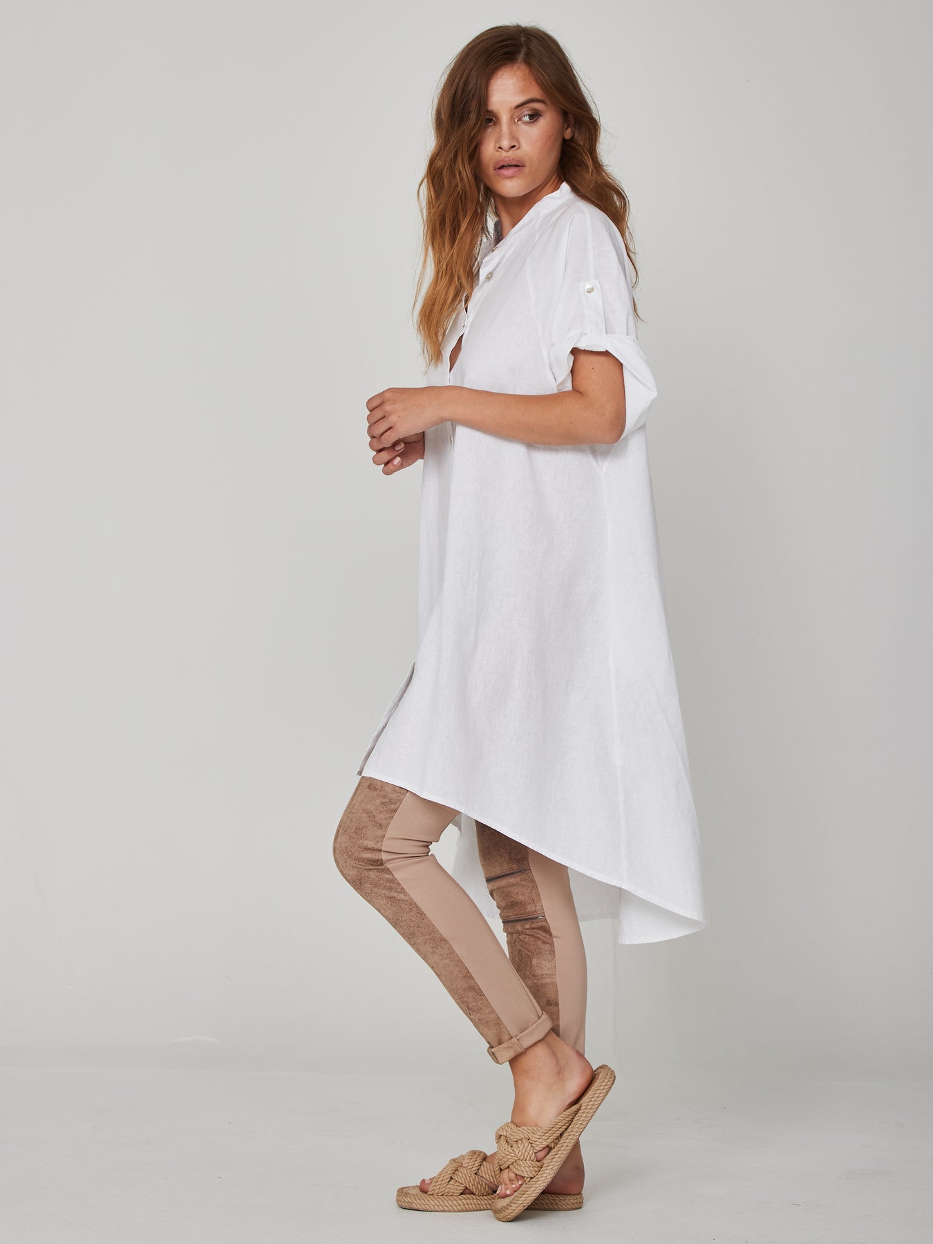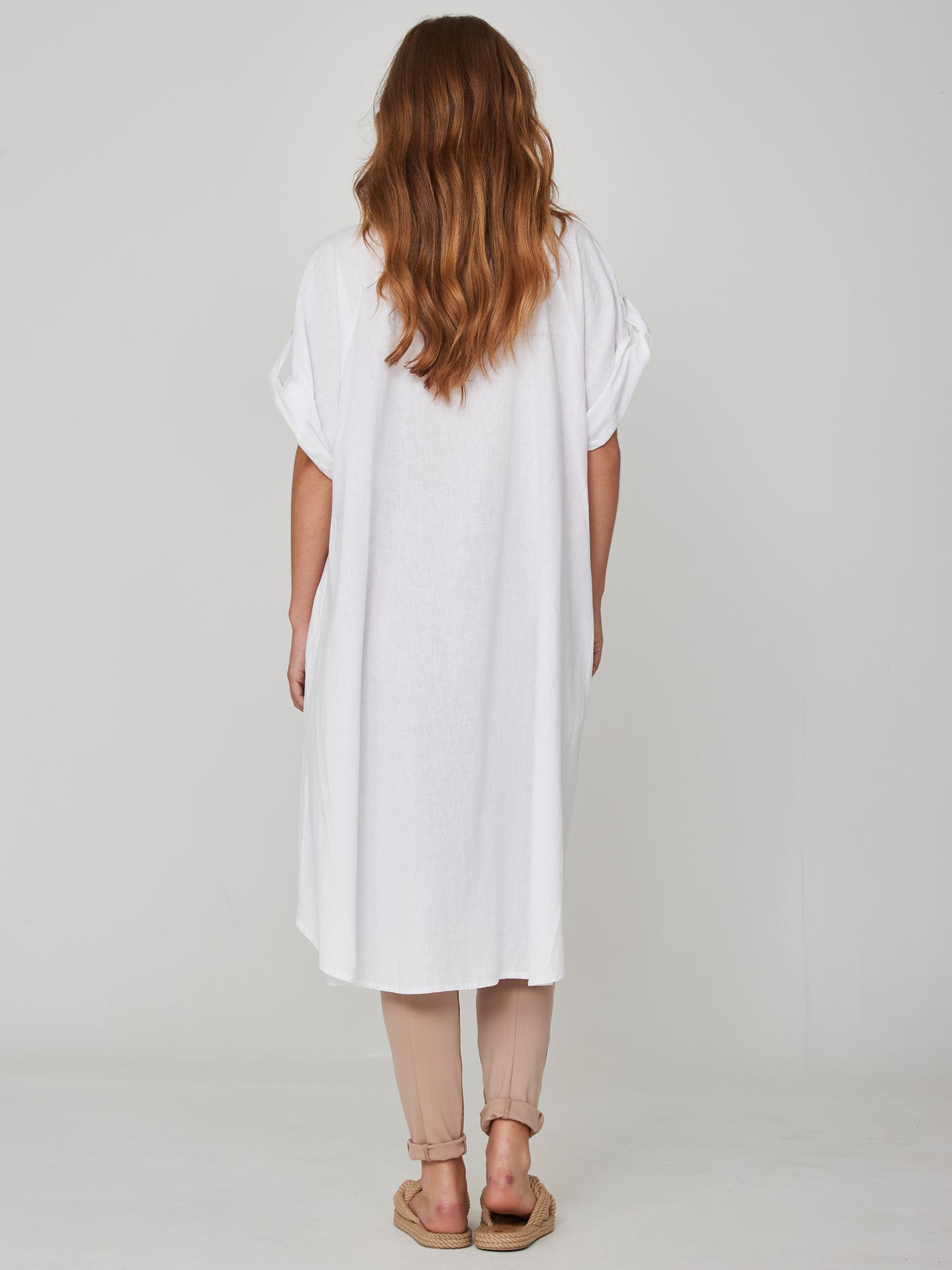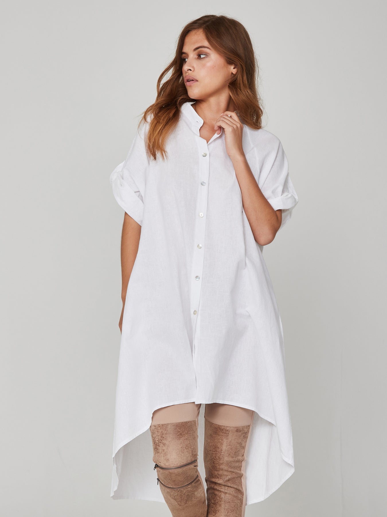 Precioso vestido camisero confeccionado en un tejido ligero y transpirable. El vestido camisero tiene un cierre de botones y mangas cortas que se pueden remangar. También tiene un ajuste extragrande y es un poco más largo en la parte trasera que en la parte delantera. Combina el vestido camisero con los leggings negros KADA para un atuendo atrevido y femenino, o combínalo con un par de pantalones negros y tacones altos para una apariencia fresca y femenina.