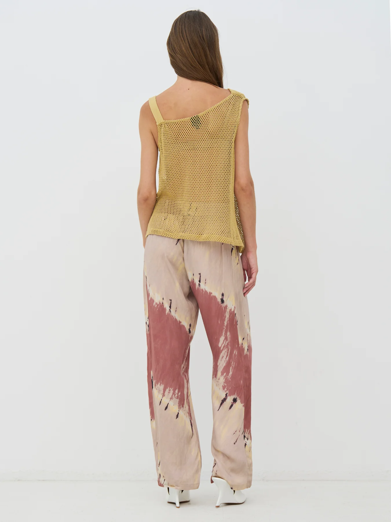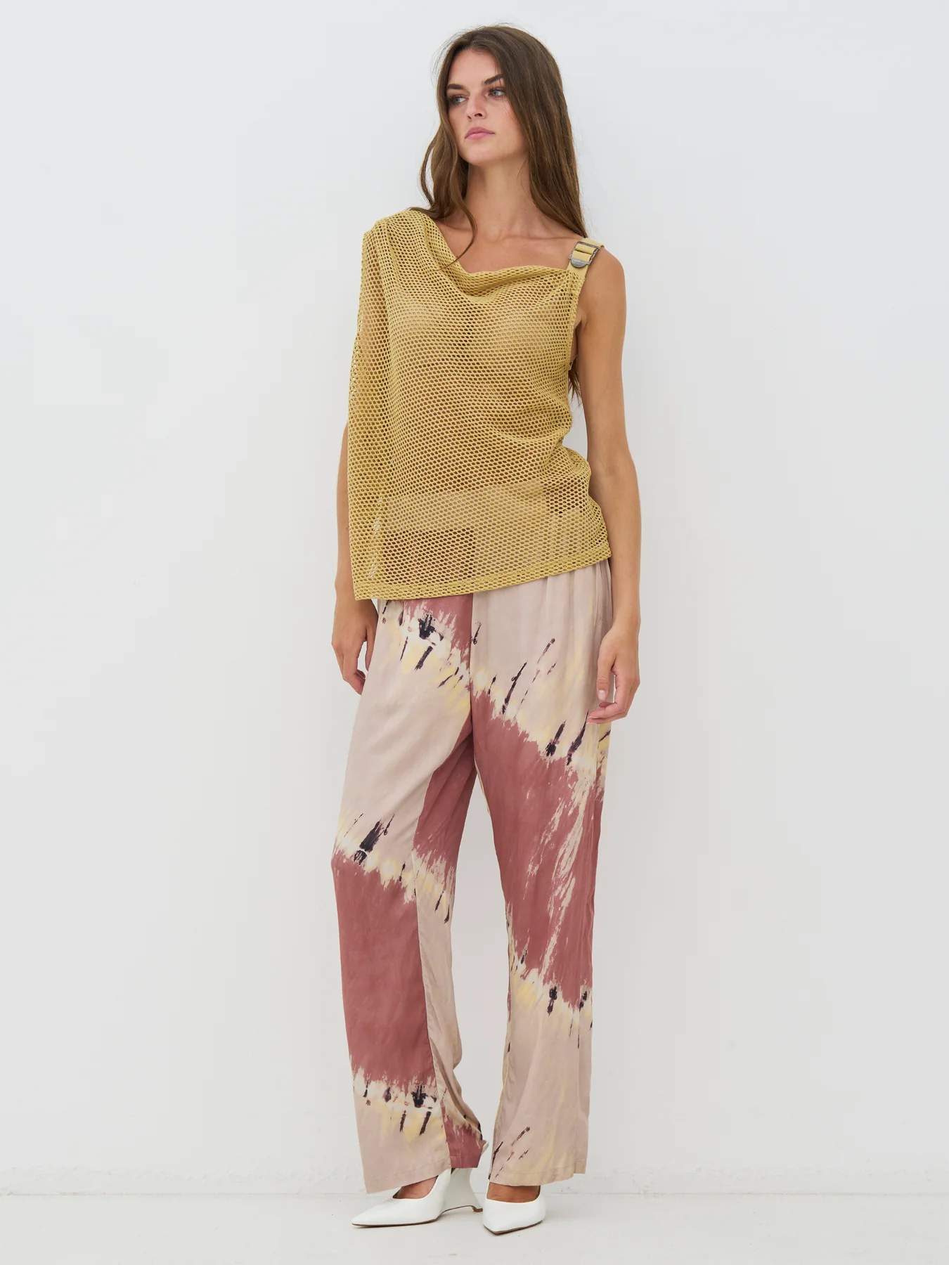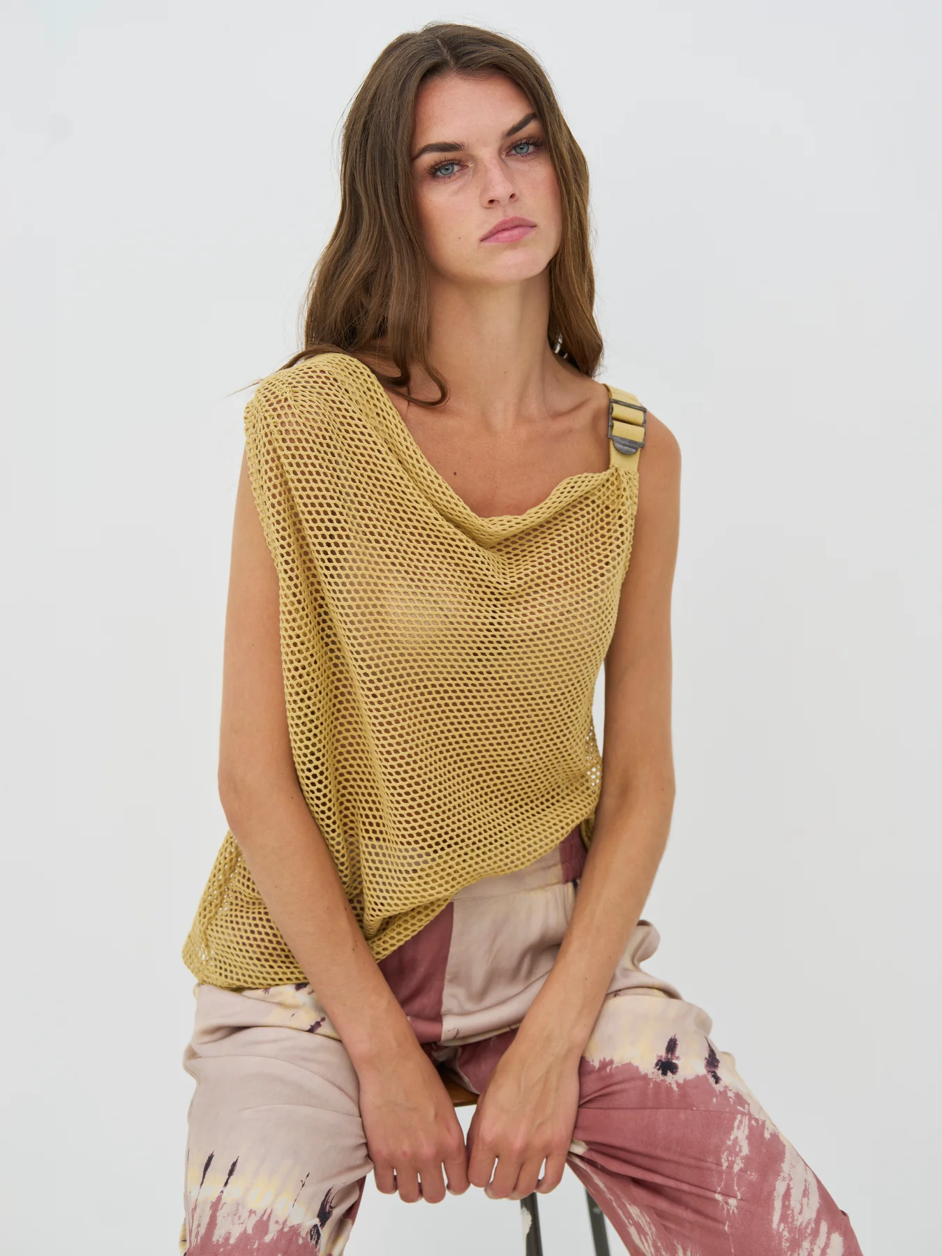 Esta blusa tiene un estilo ligero y sencillo, con un estampado perforado y un corte holgado y asimétrico. Cae suavemente sobre el cuerpo y cuenta con un tirante ancho que le da un aire relajado pero sofisticado. La espalda es sencilla y ligeramente transparente. Llévala sobre una blusa o debajo de un blazer para un look impactante.
