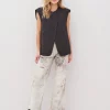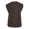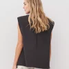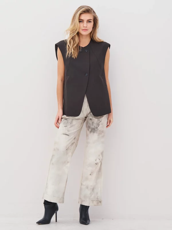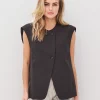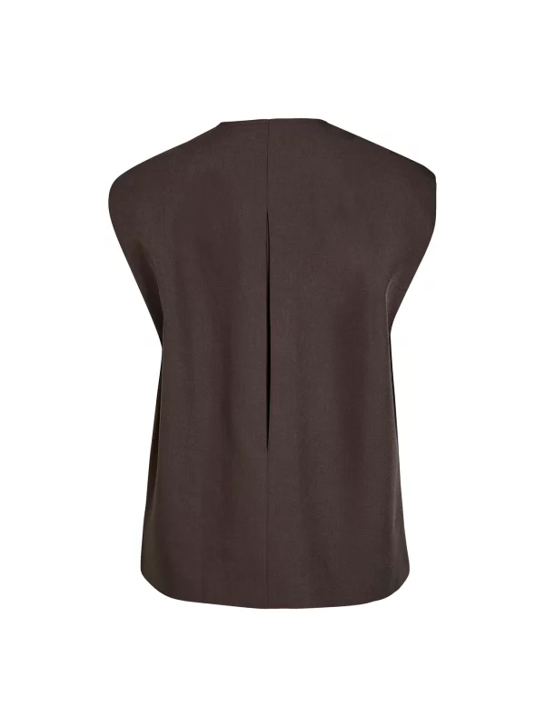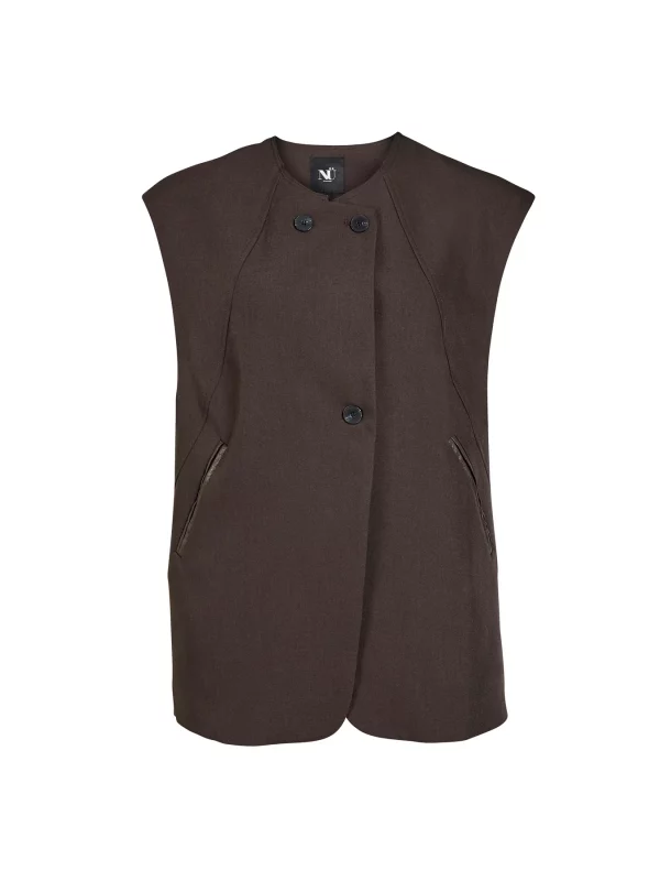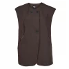 Este chaleco presenta un diseño sencillo y estructurado con cierre de doble botonadura y discretos bolsillos laterales con cremallera. Tiene cuello redondo y bordes ligeramente redondeados, lo que le da un aspecto moderno. La espalda tiene una sola abertura que le da un toque extra de movimiento y comodidad.